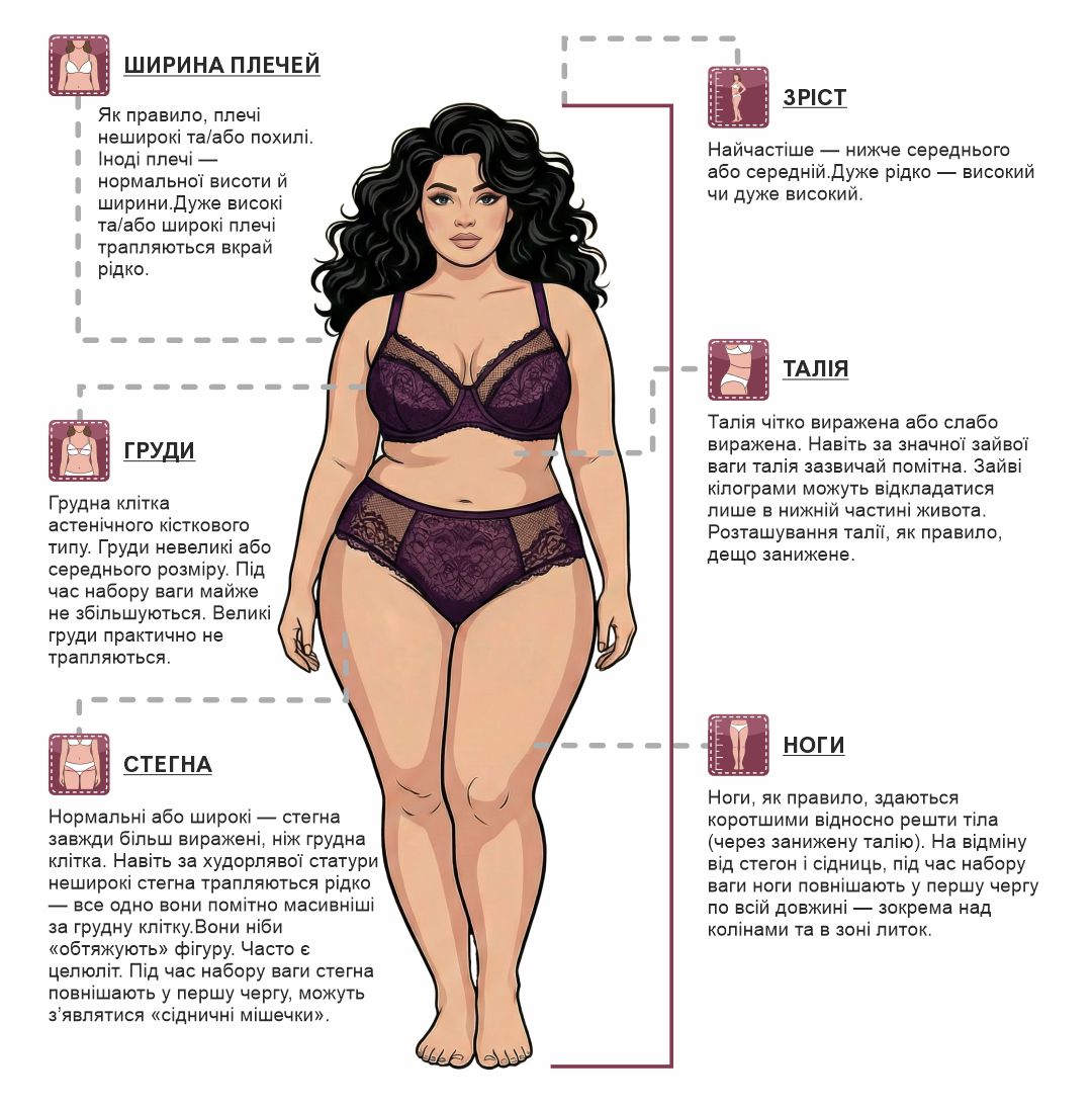 - Стегна ширші за плечі або виглядають важчими у силуеті.