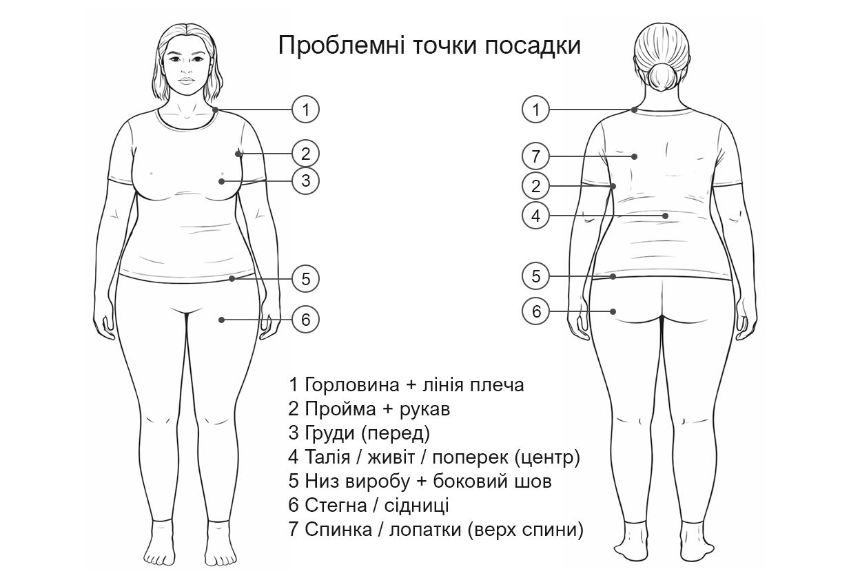 - 5 — Низ виробу + боковий шов: Критична точка для «груші»: край “сідає хвилею”, тягне по боковому шву, перекіс по низу; передній або задній низ стає коротшим/підстрибує.
