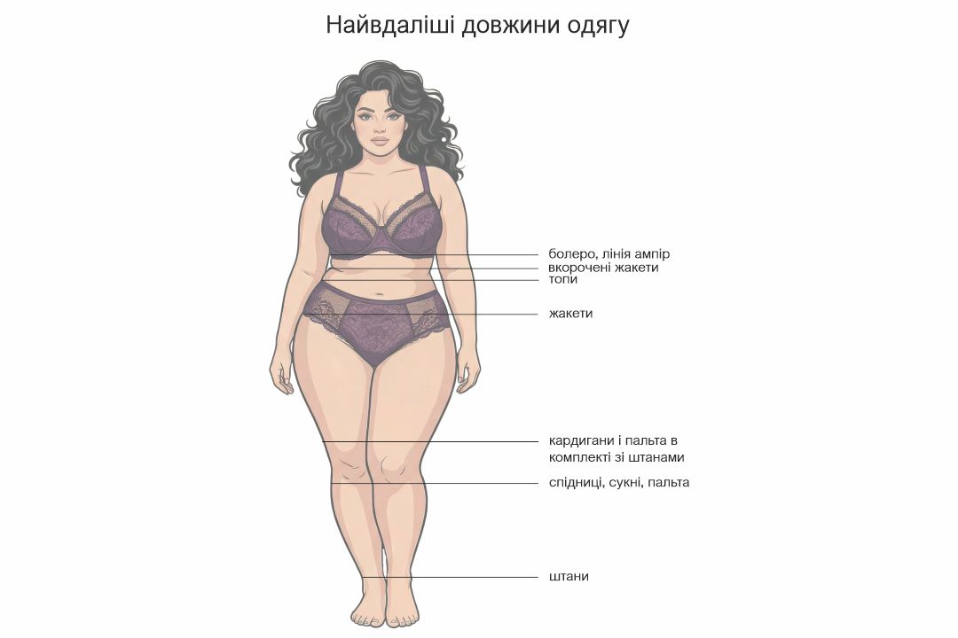 Тому одяг має або проходити повз найширшу точку, або завершуватися вище, але без жорсткого “зрізу” (краще з розрізами, асиметрією, діагоналлю).