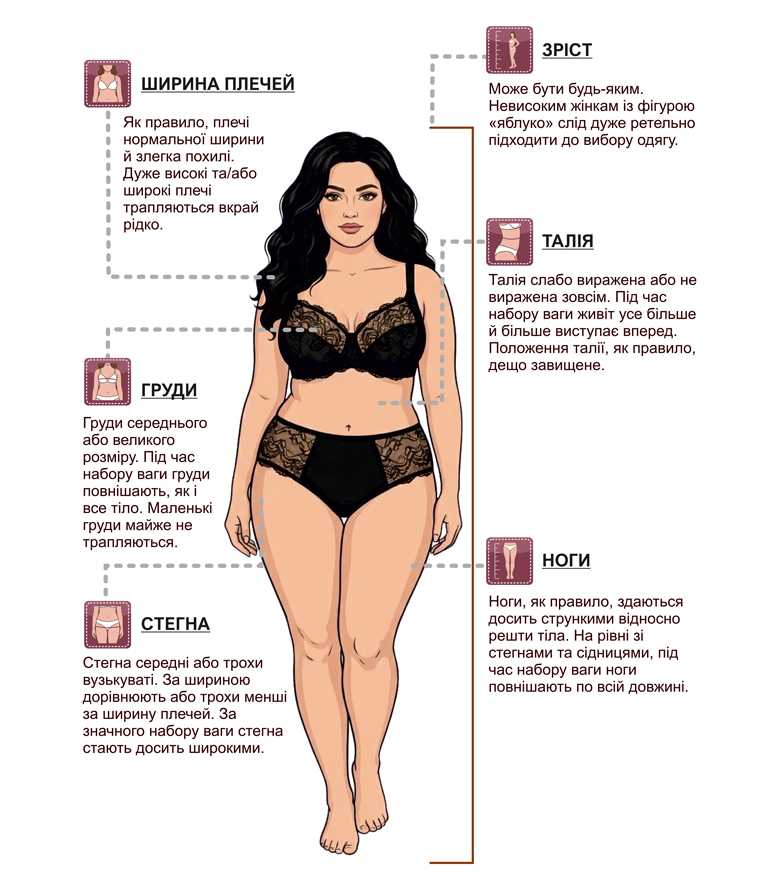 Часто при цьому верх активніший: груди можуть бути пишними, руки — повнішими, лінія плечей — м’якшою. Стегна нерідко виглядають спокійніше, а ноги — відносно легшими у загальній пропорції. Але ключова ознака завжди одна: центр задає основний контур — і саме під нього потім підбираються пропорції одягу, довжини та лінії.