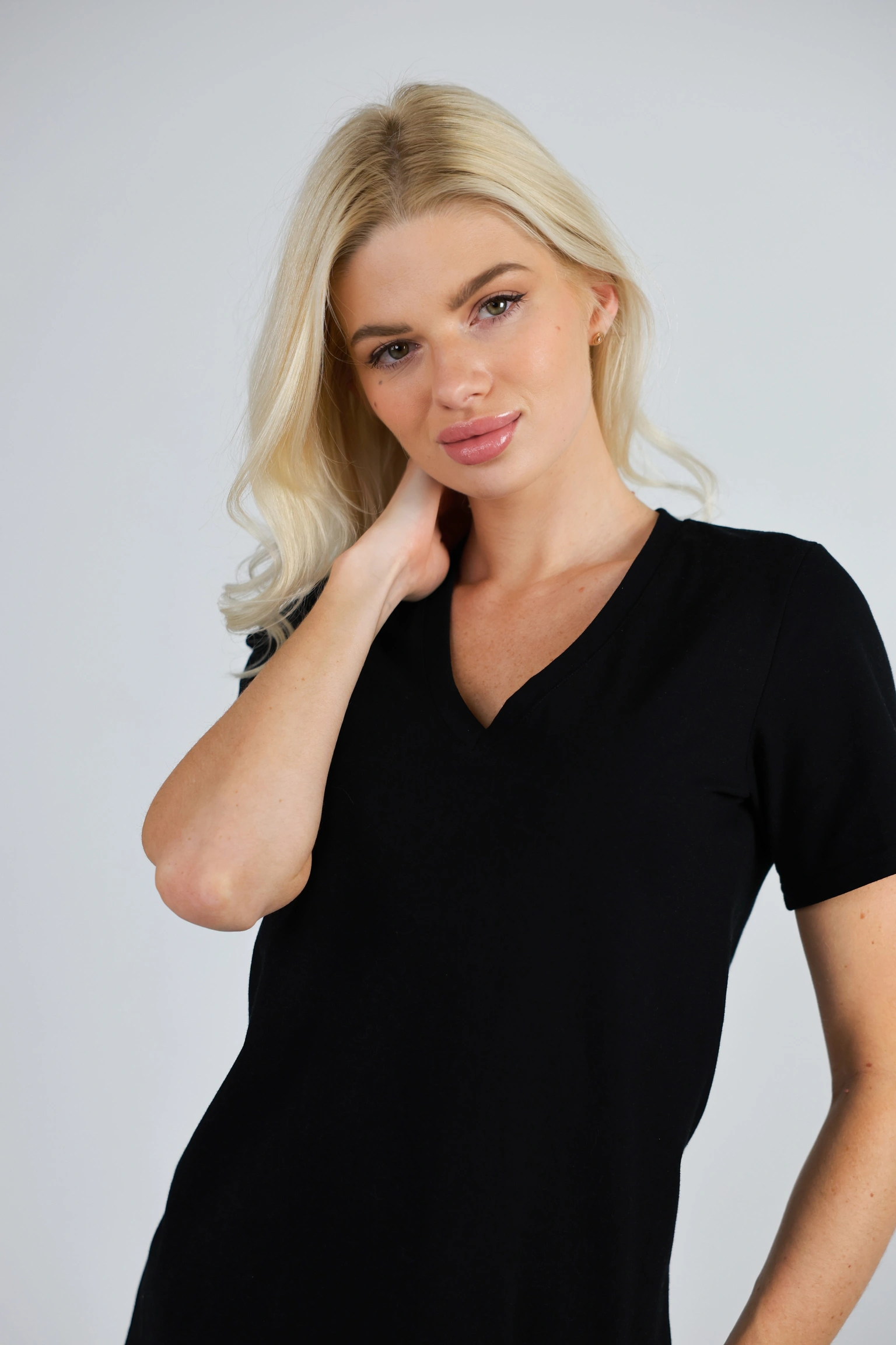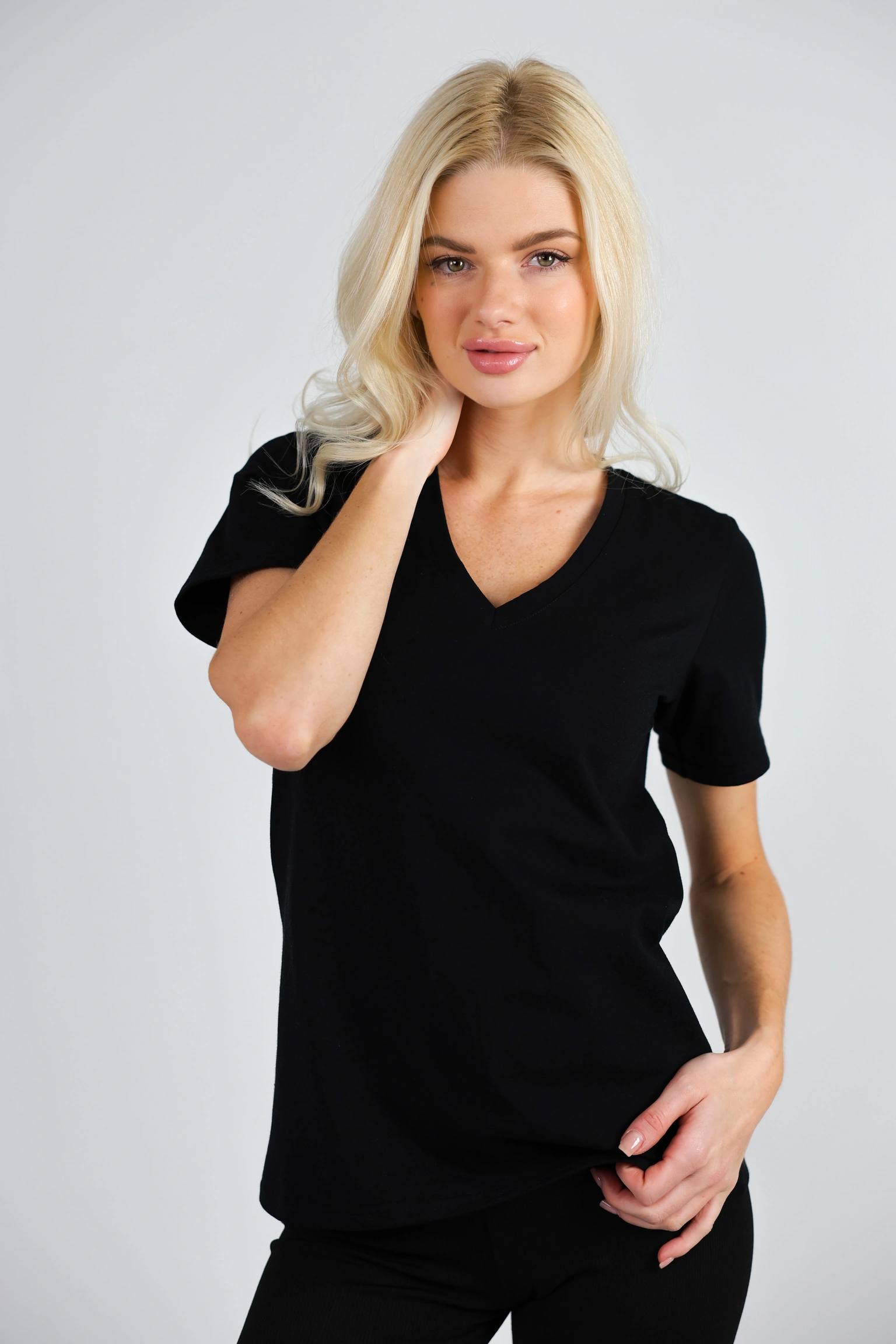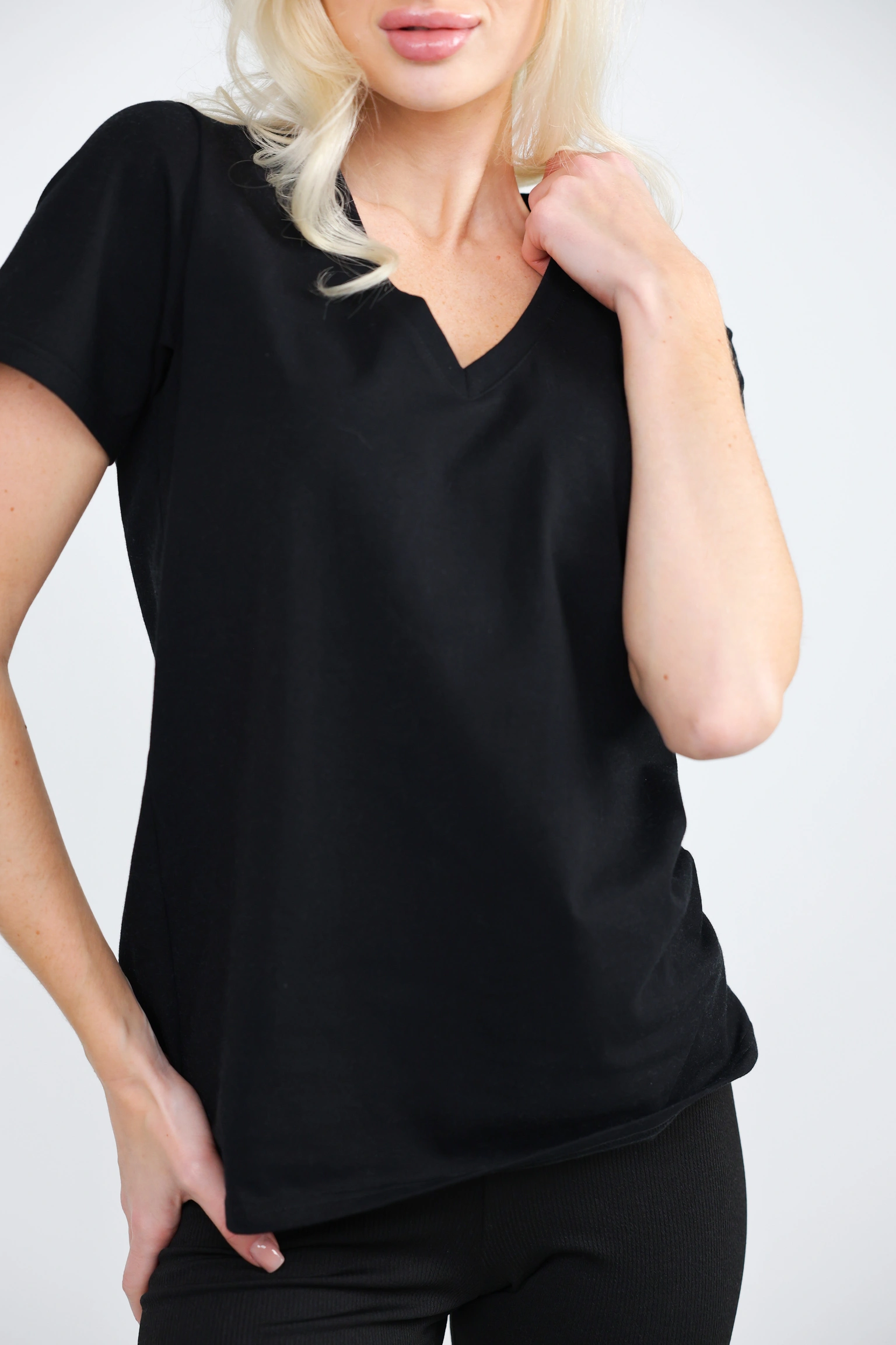 • V-виріз тримає лінію та не виглядає “розтягнутим” при носінні.