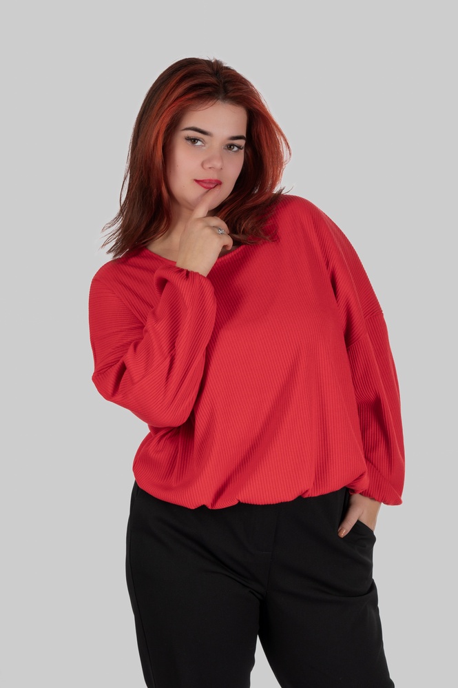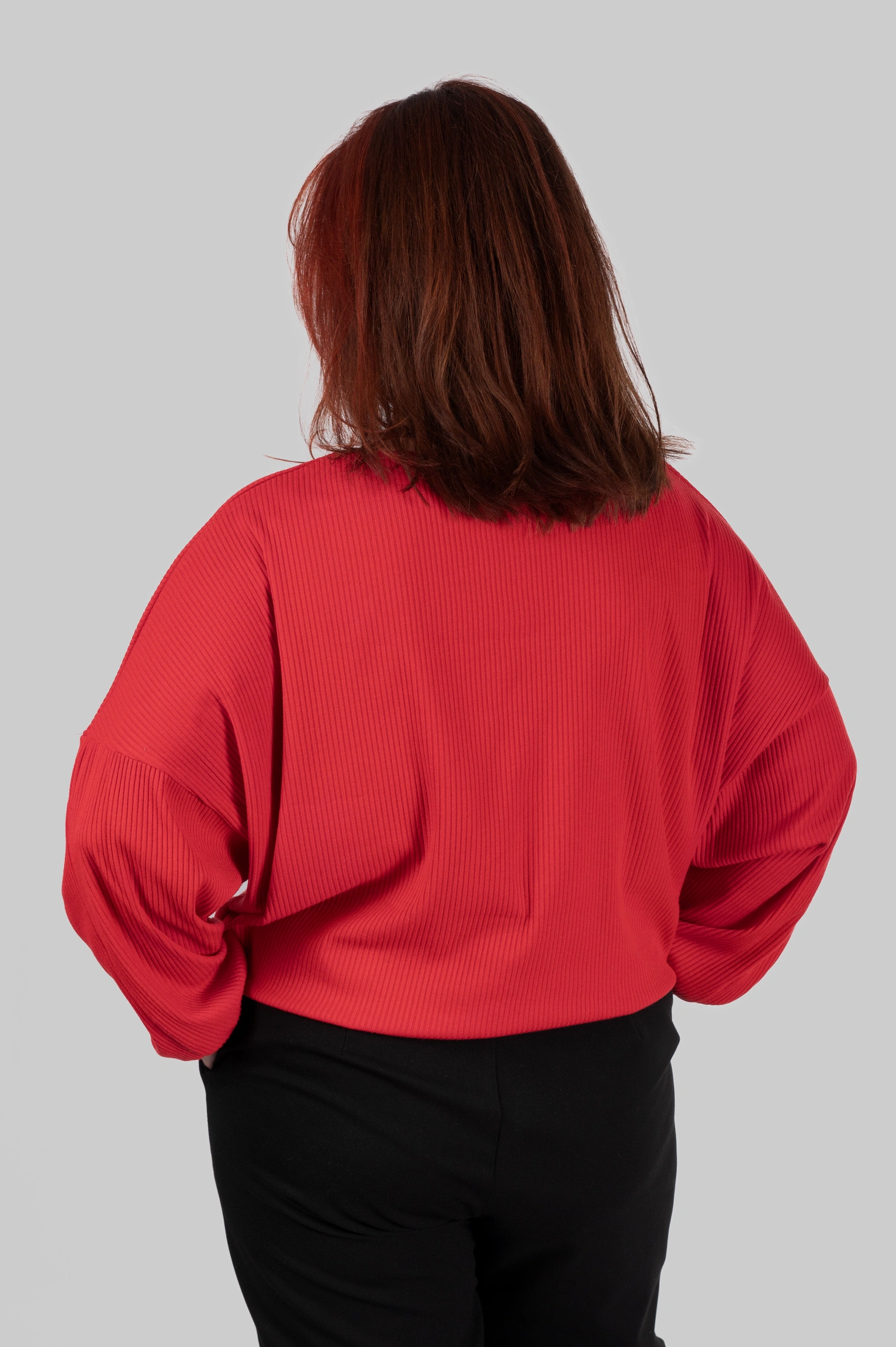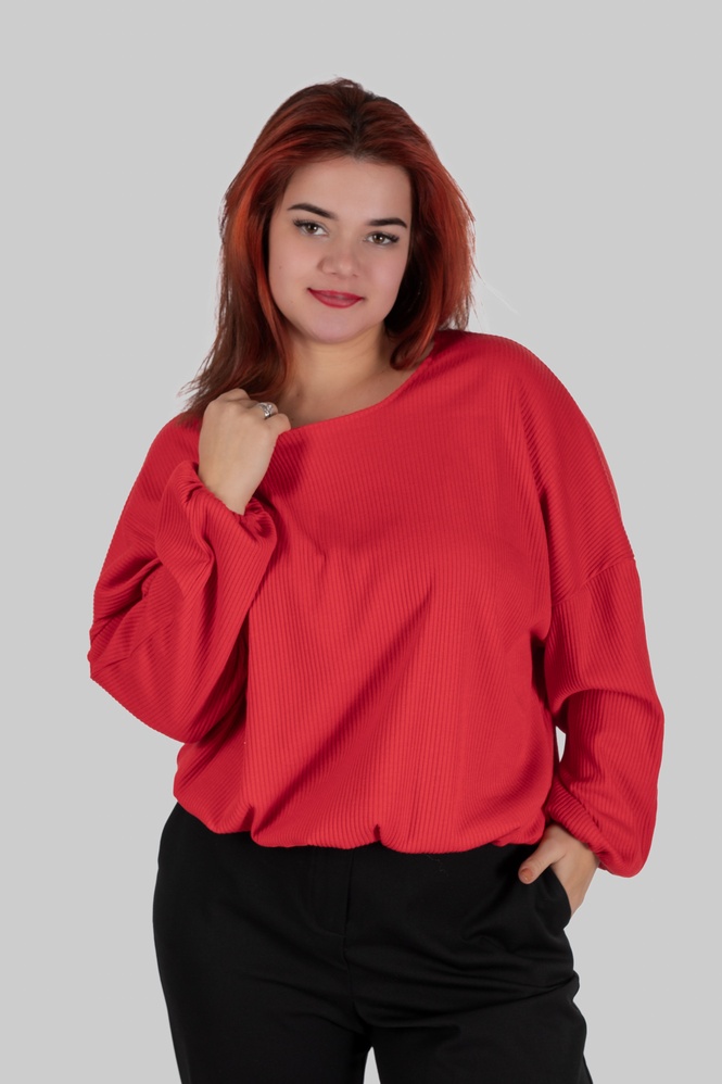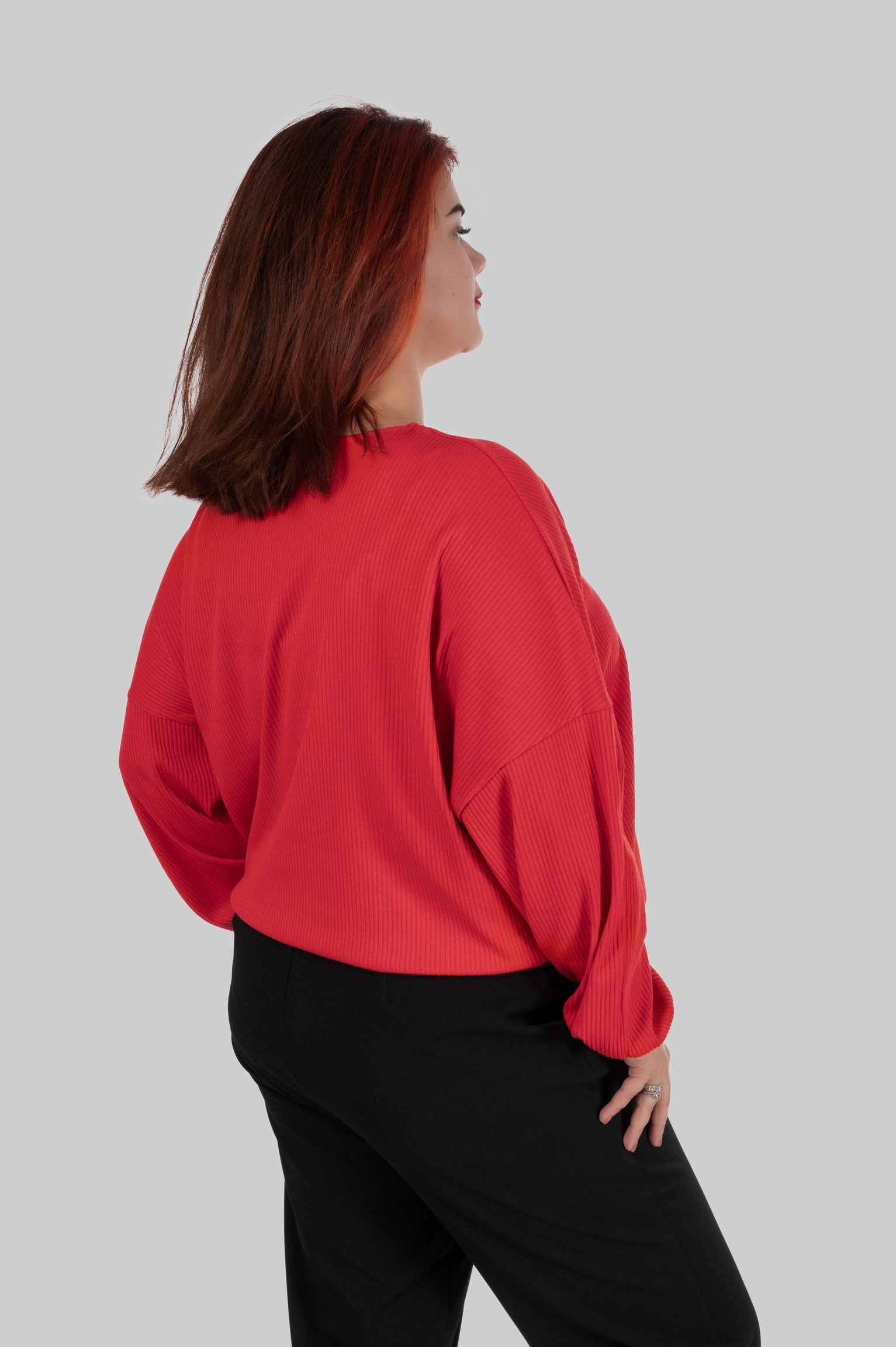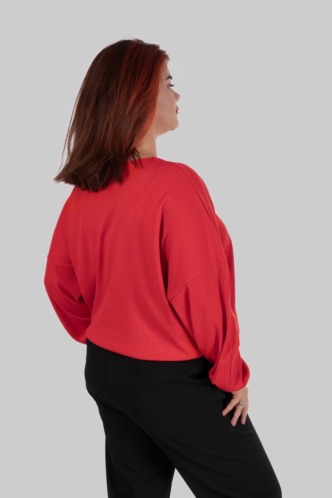 Джемпер має вільний силует із рукавом типу «летюча мишка», тому модель комфортно сідає в зоні плечей та рук і не обмежує рухи. М’який трикотаж у рубчик добре адаптується до фігури та не обтягує активні зони.