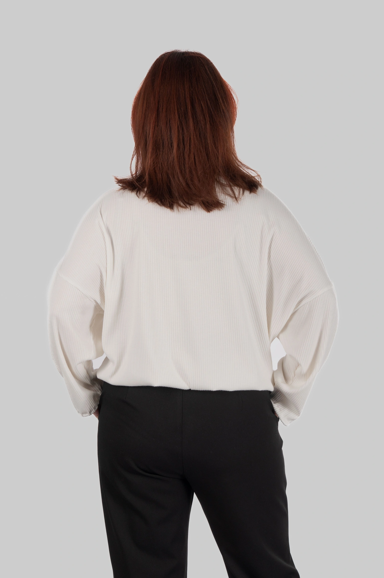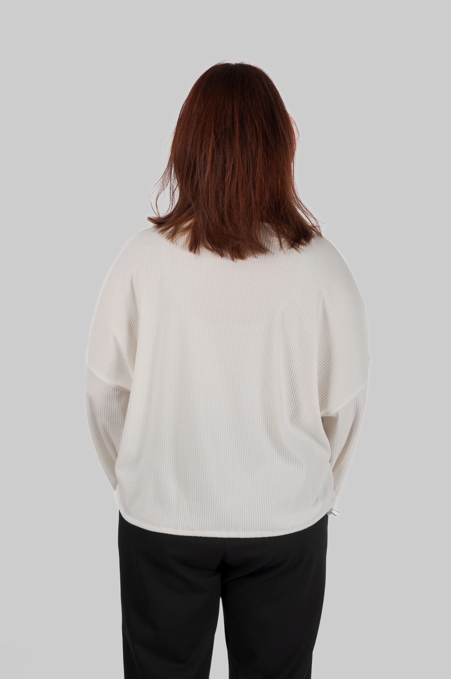 Модель виконана з трикотажу в рубчик з вертикальною орієнтацією фактури. Структура полотна формує чіткий силует без надлишкового об’єму.