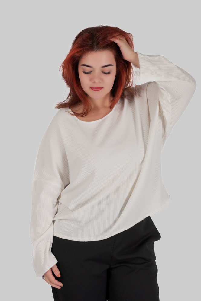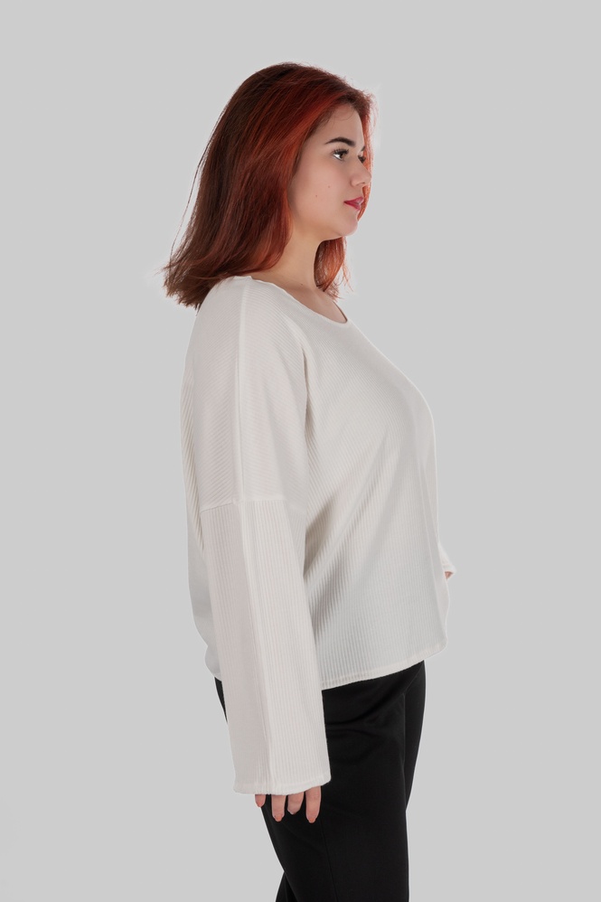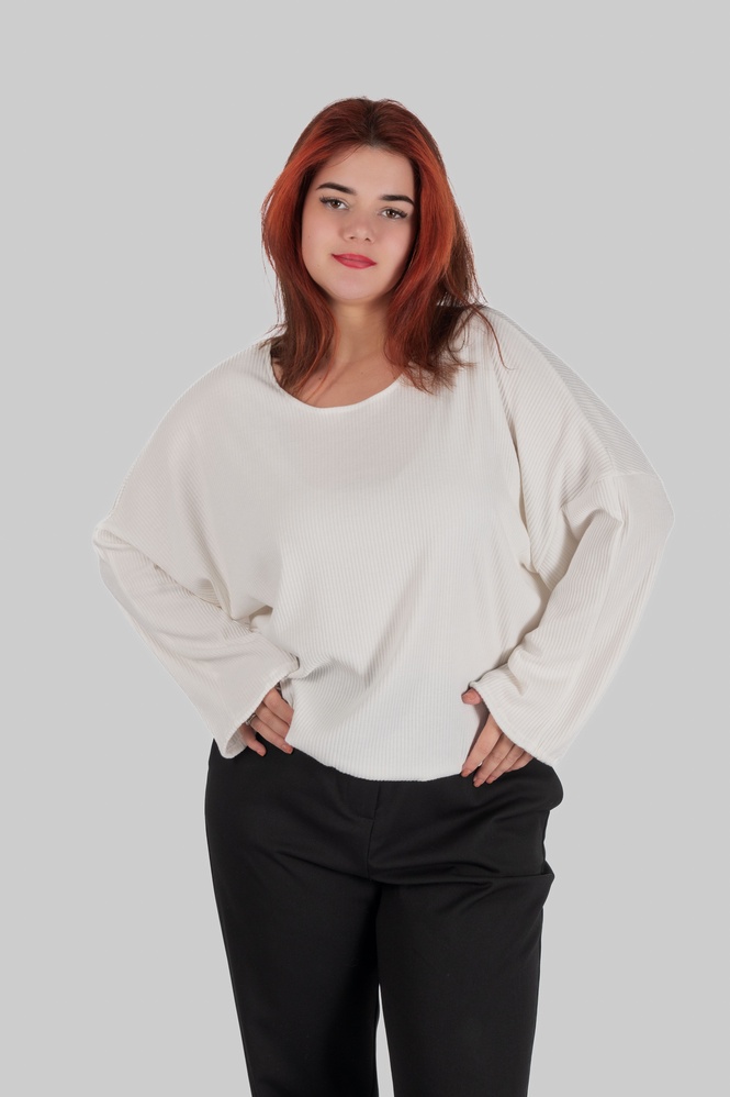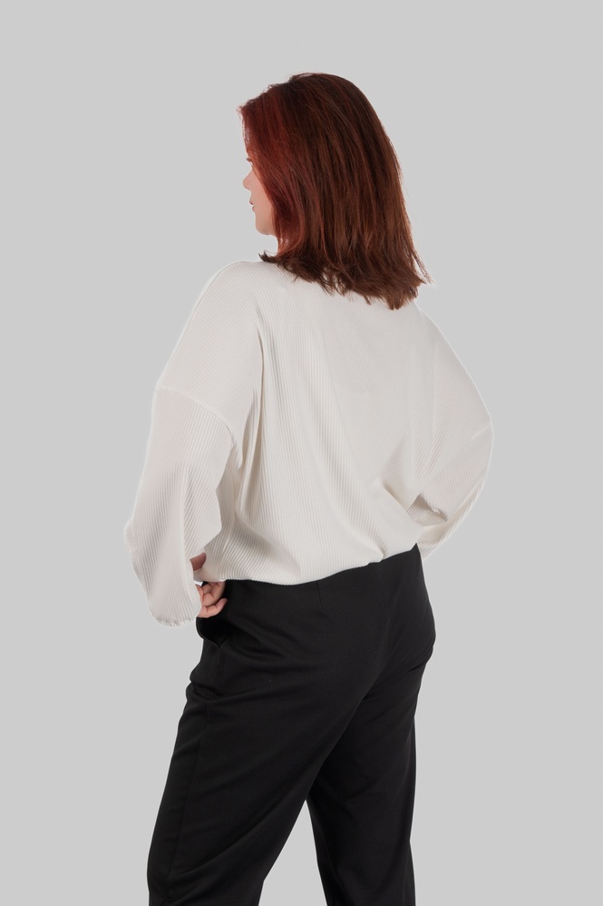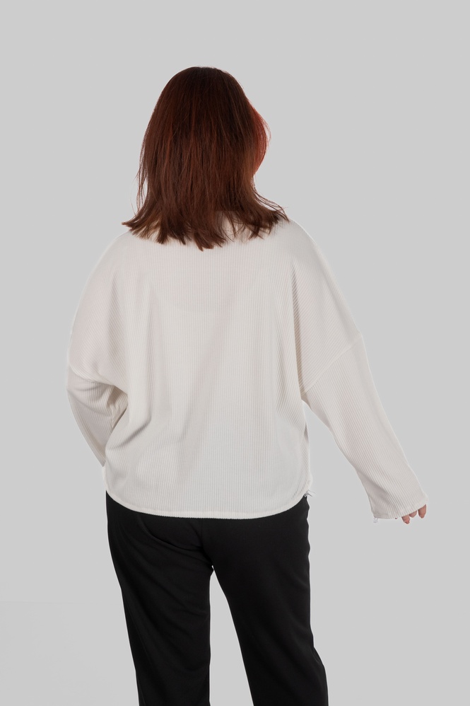 Джемпер має вільний силует із рукавом типу «летюча мишка», тому модель комфортно сідає в зоні плечей та рук і не обмежує рухи. М’який трикотаж у рубчик добре адаптується до фігури та не обтягує активні зони.