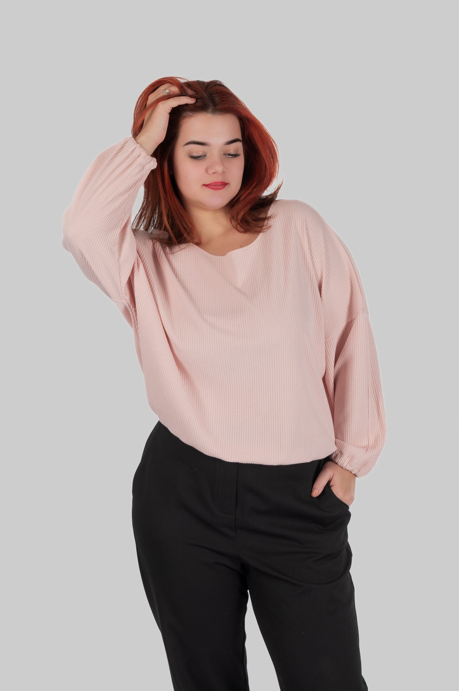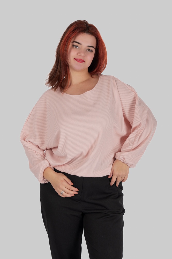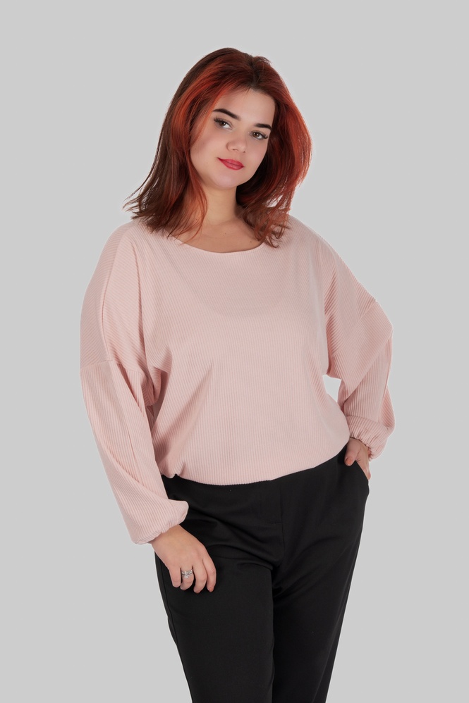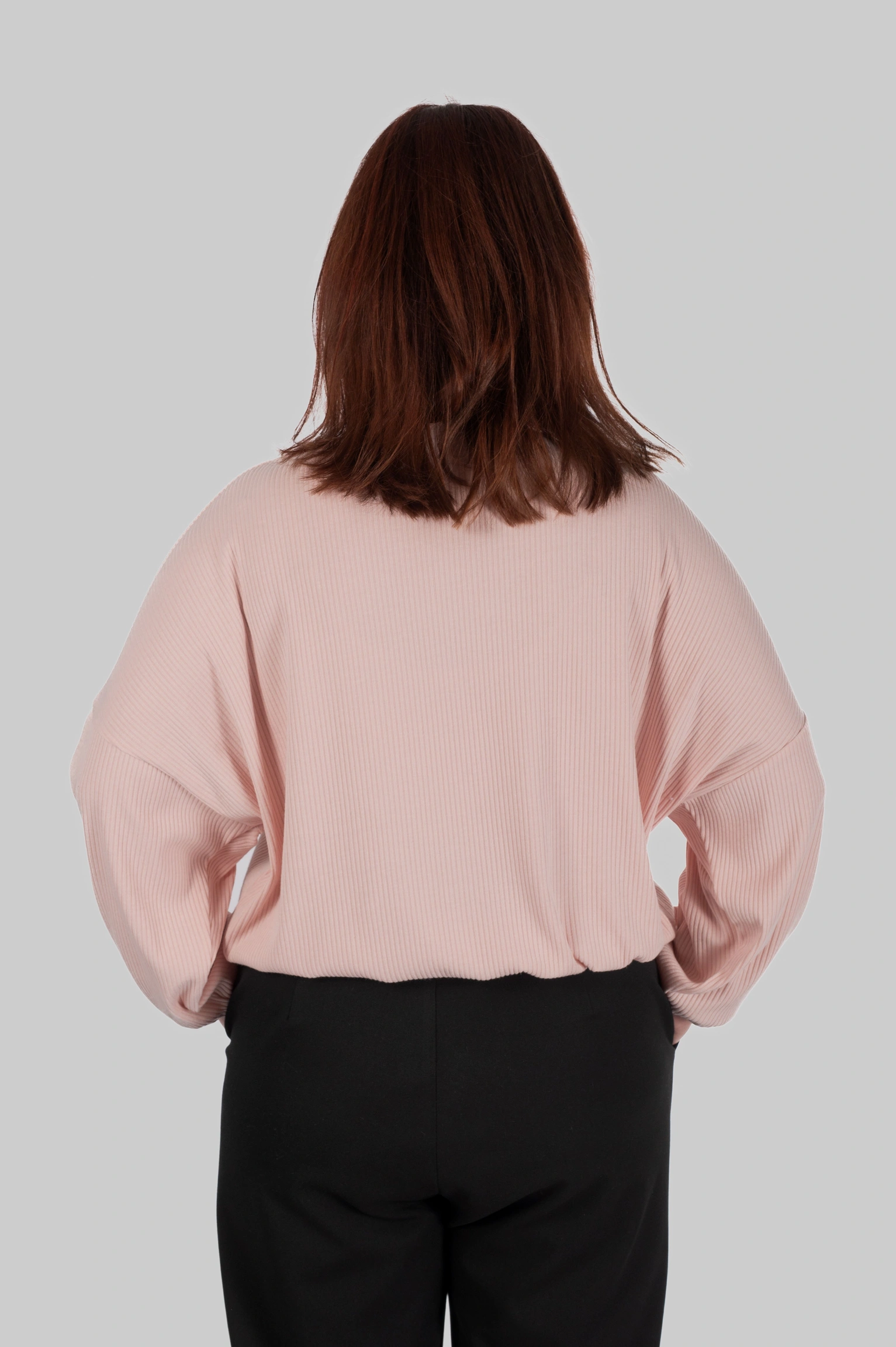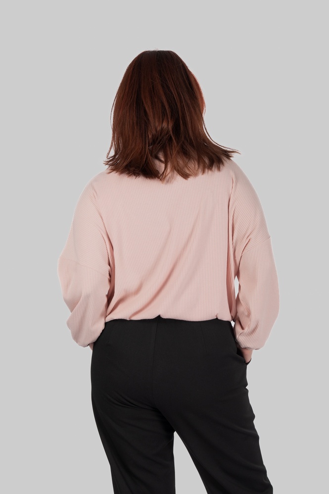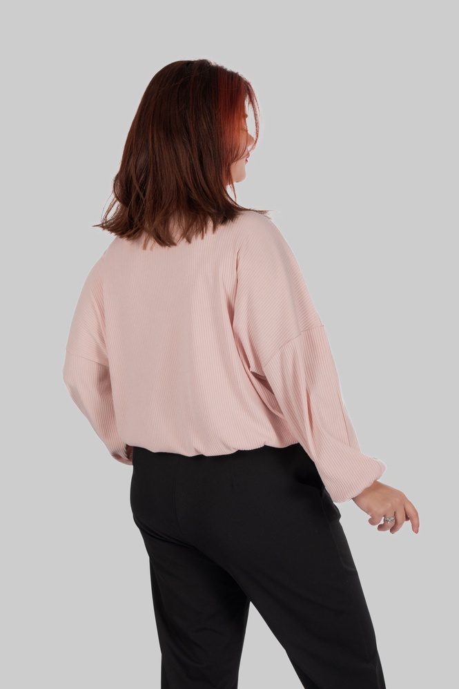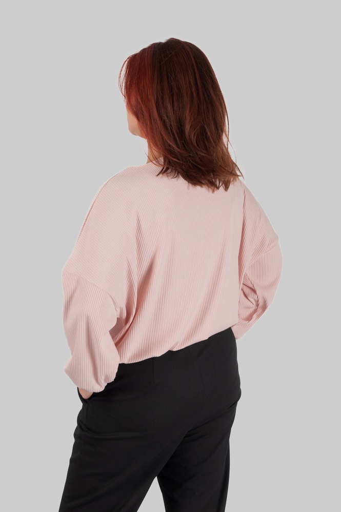 Джемпер має вільний силует із рукавом типу «летюча мишка», тому модель комфортно сідає в зоні плечей та рук і не обмежує рухи. М’який трикотаж у рубчик добре адаптується до фігури та не обтягує активні зони.