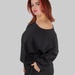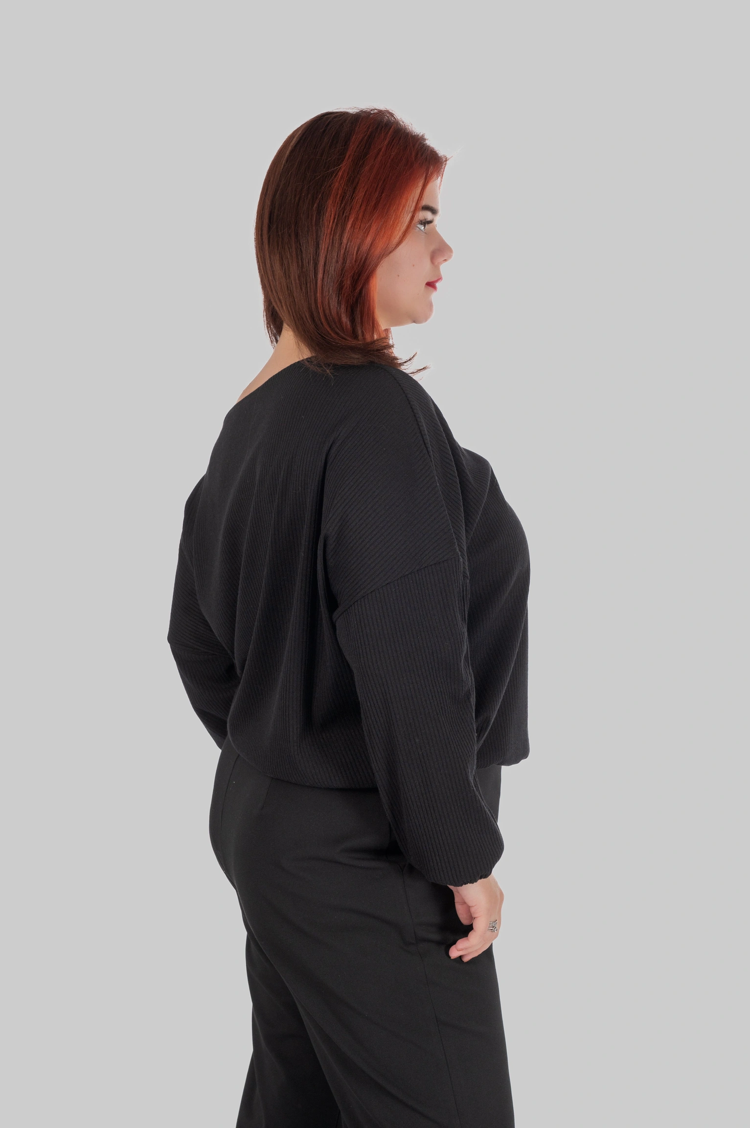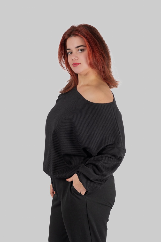 Джемпер має вільний силует із рукавом типу «летюча мишка», тому модель комфортно сідає в зоні плечей та рук і не обмежує рухи. М’який трикотаж у рубчик добре адаптується до фігури та не обтягує активні зони.