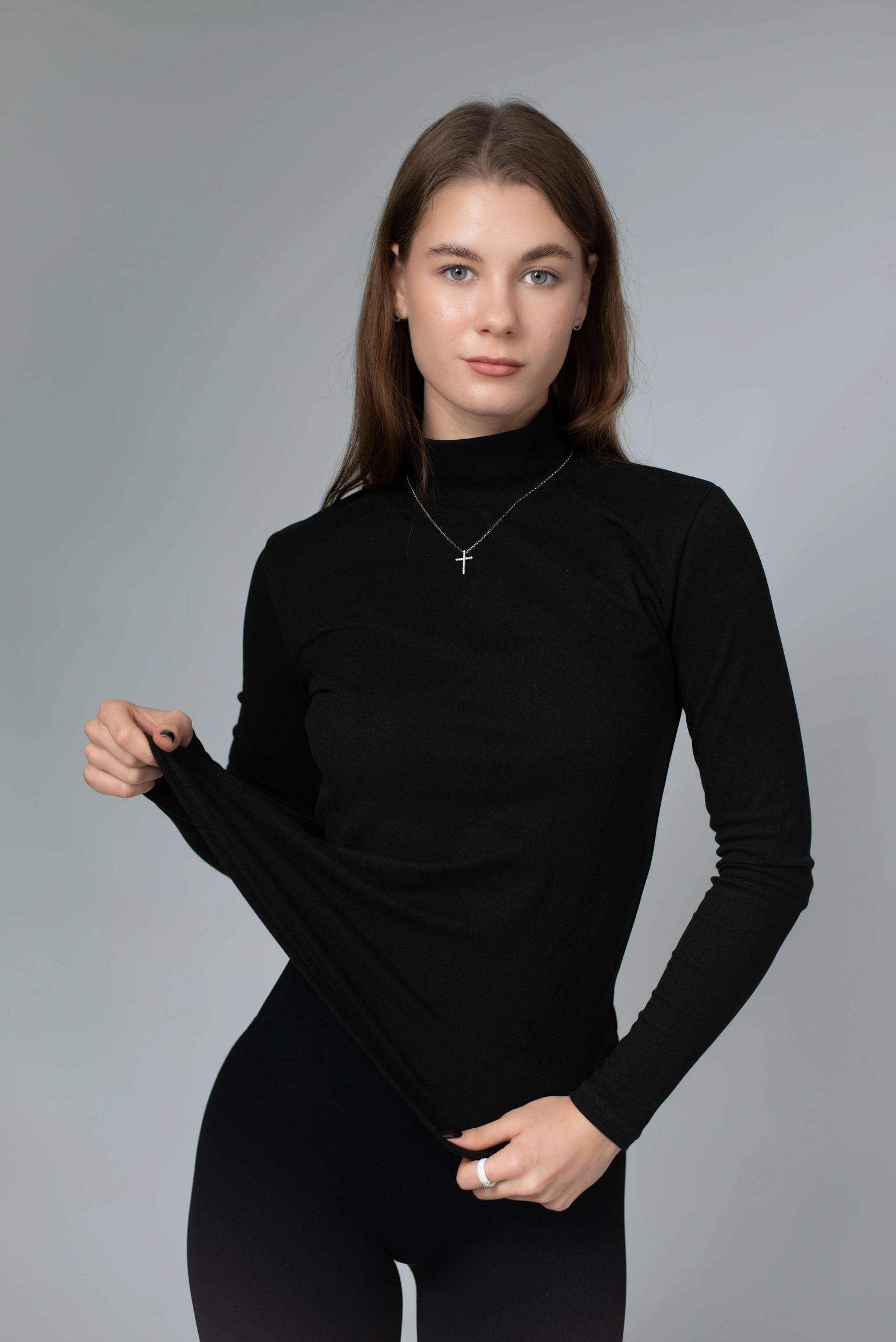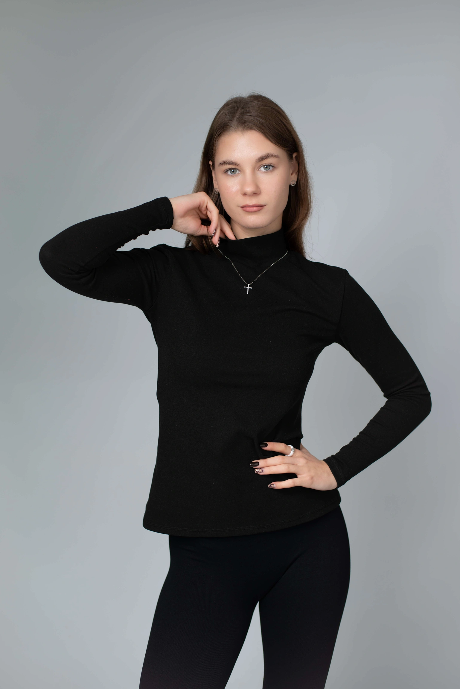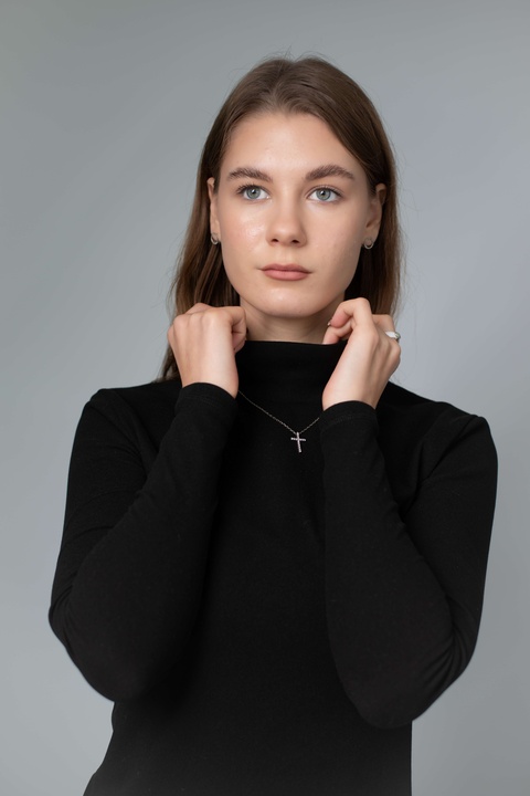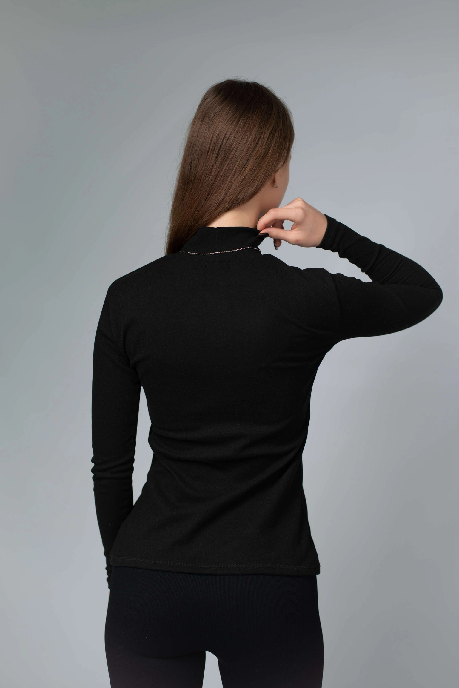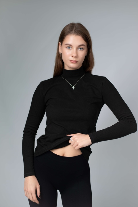 Висока горловина щільно, але делікатно облягає шию — не подразнює, не тисне, зберігає тепло й створює акуратний силует. Гольф ідеально працює як перший шар: під жакет, тренч, пальто, жилет чи светр. Але водночас виглядає самодостатньо й може бути основою образу — з джинсами, штанами, палаццо або спідницею.