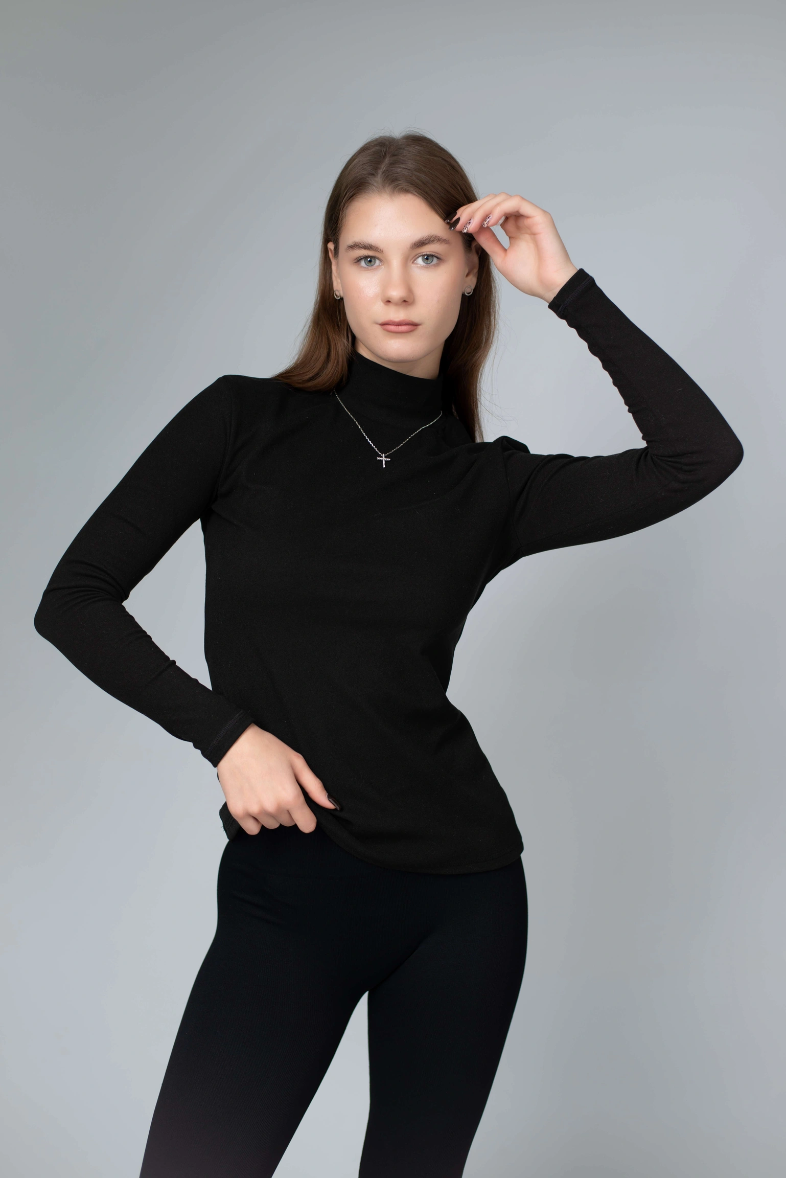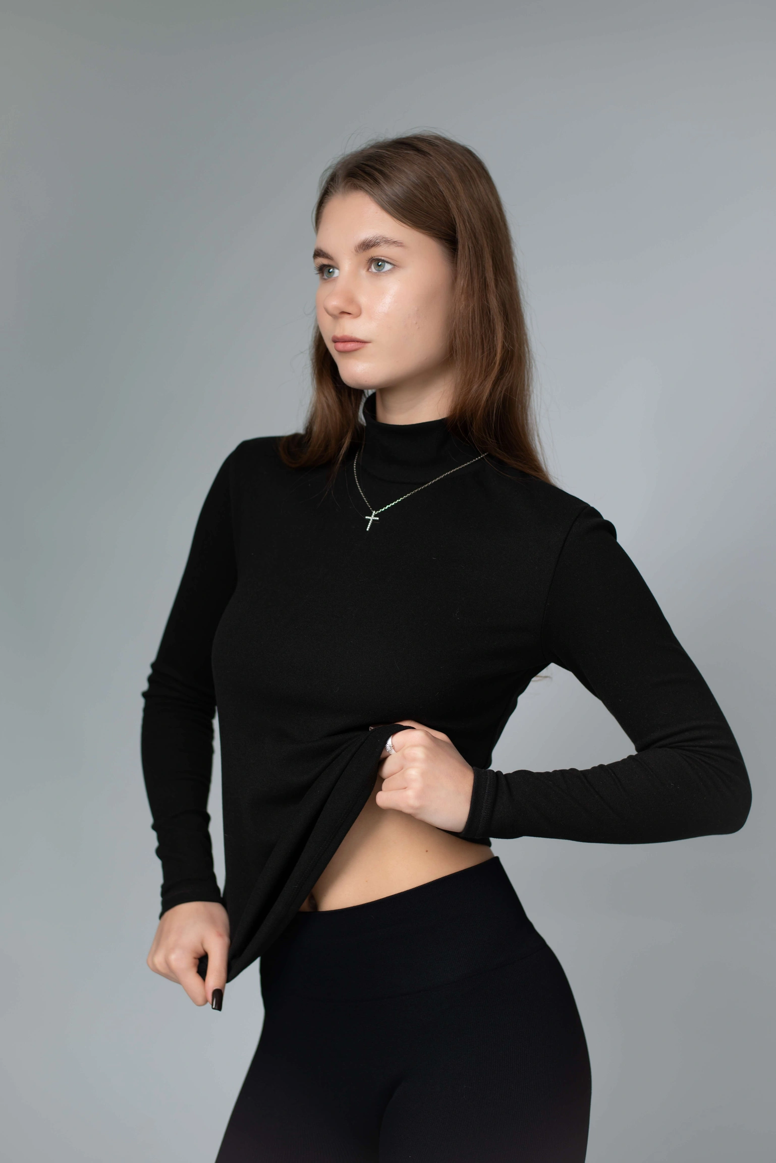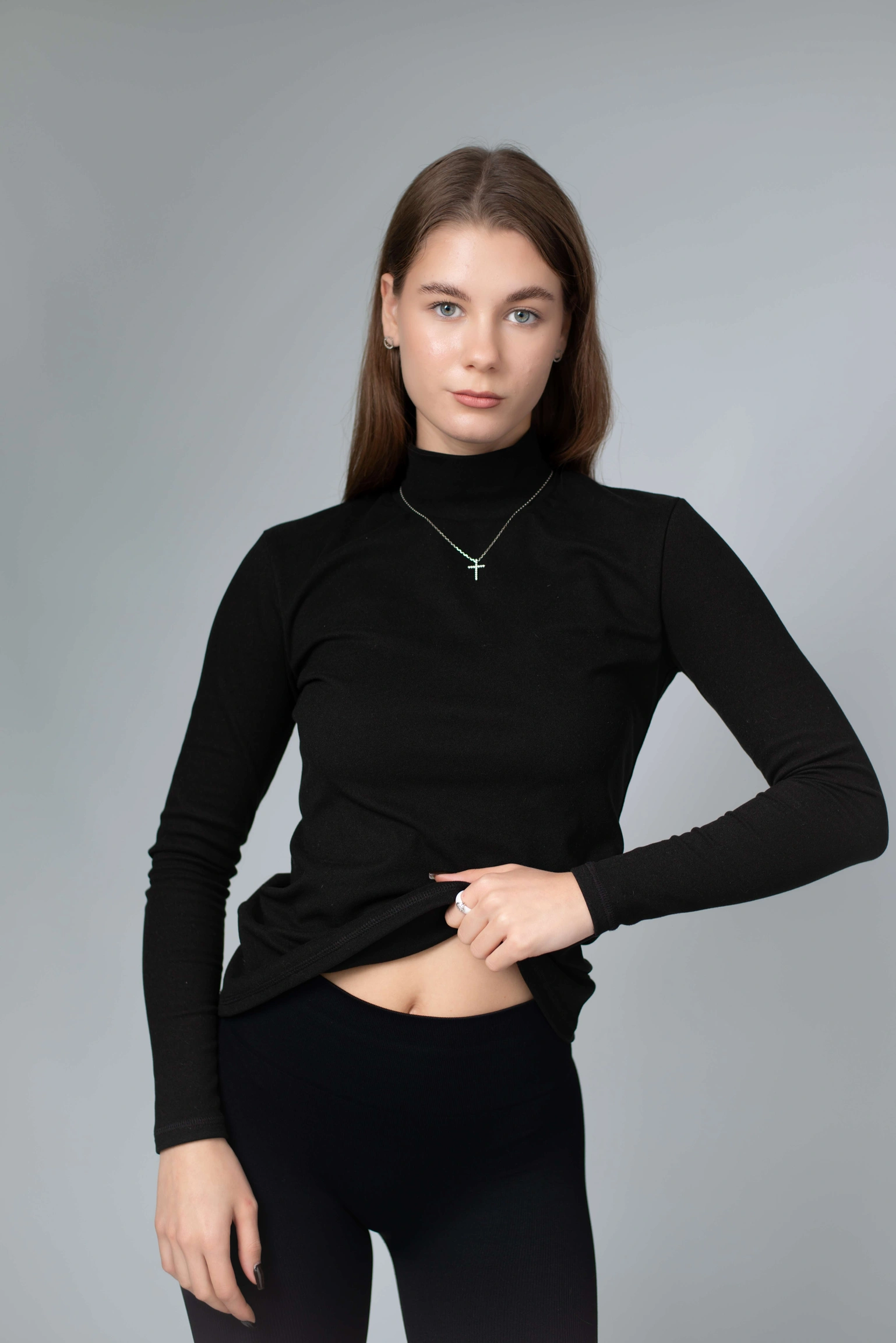 Висока горловина щільно, але делікатно облягає шию — не подразнює, не тисне, зберігає тепло й створює акуратний силует. Гольф ідеально працює як перший шар: під жакет, тренч, пальто, жилет чи светр. Але водночас виглядає самодостатньо й може бути основою образу — з джинсами, штанами, палаццо або спідницею.