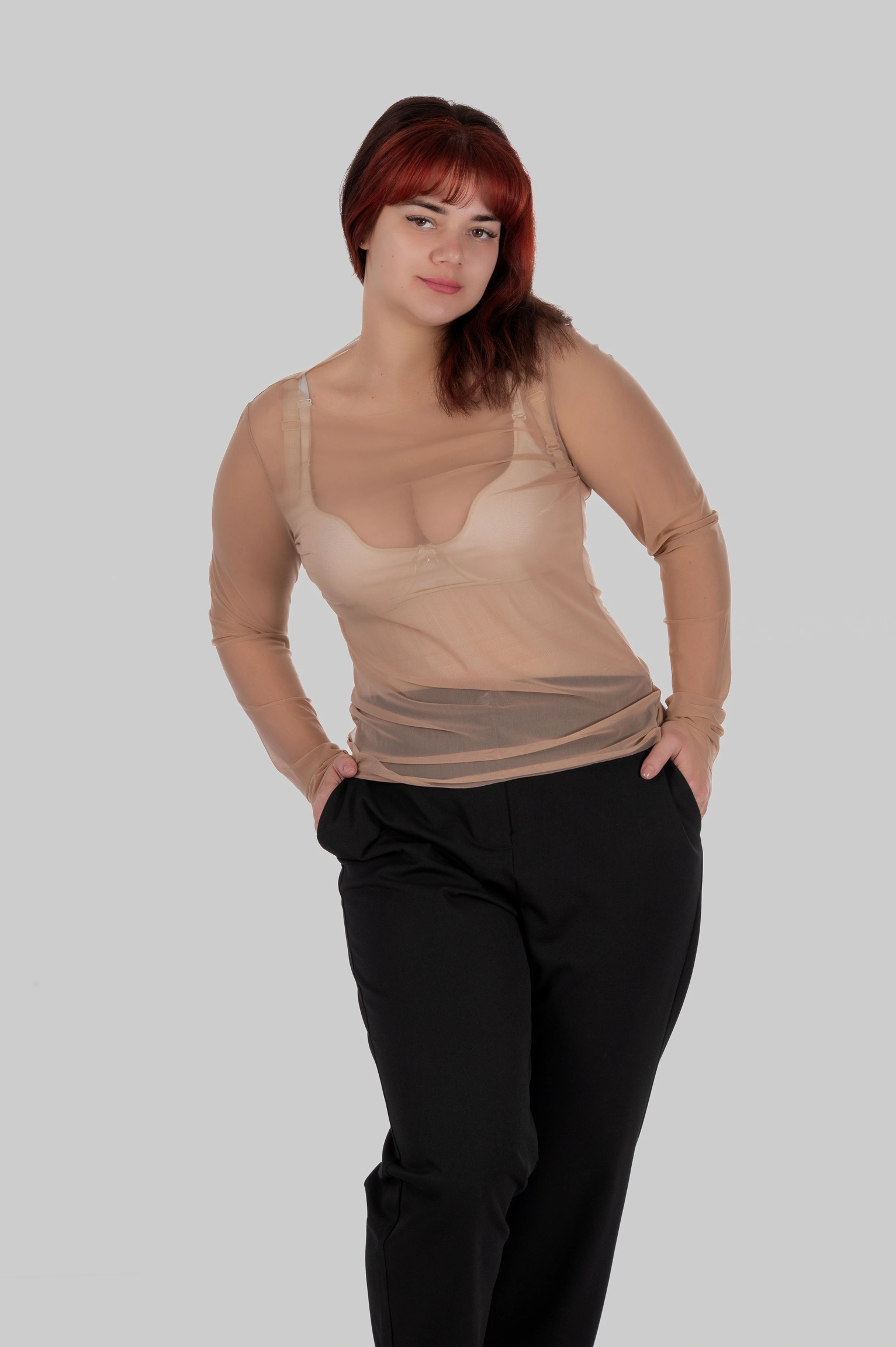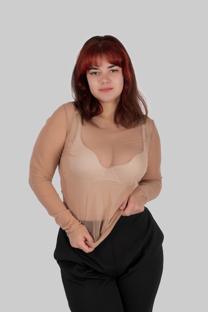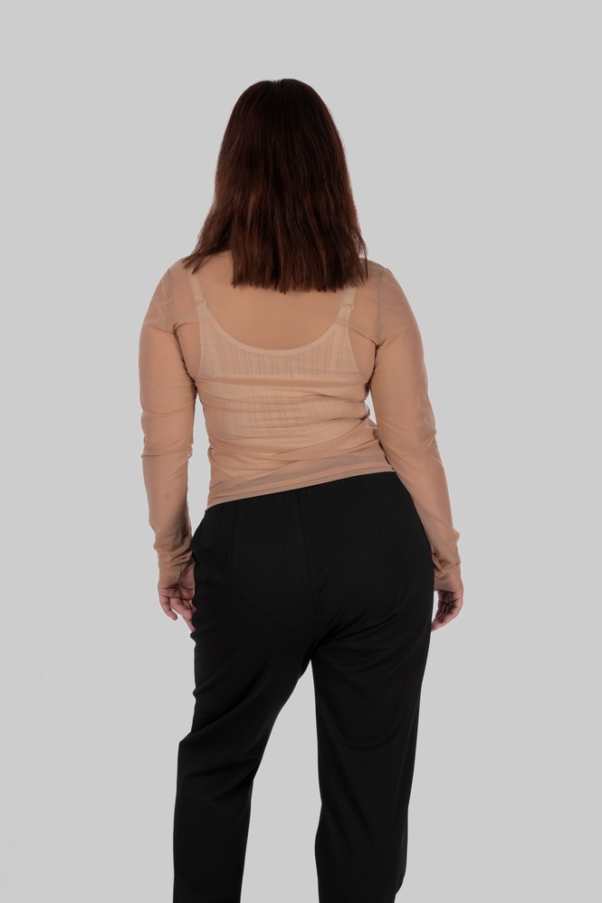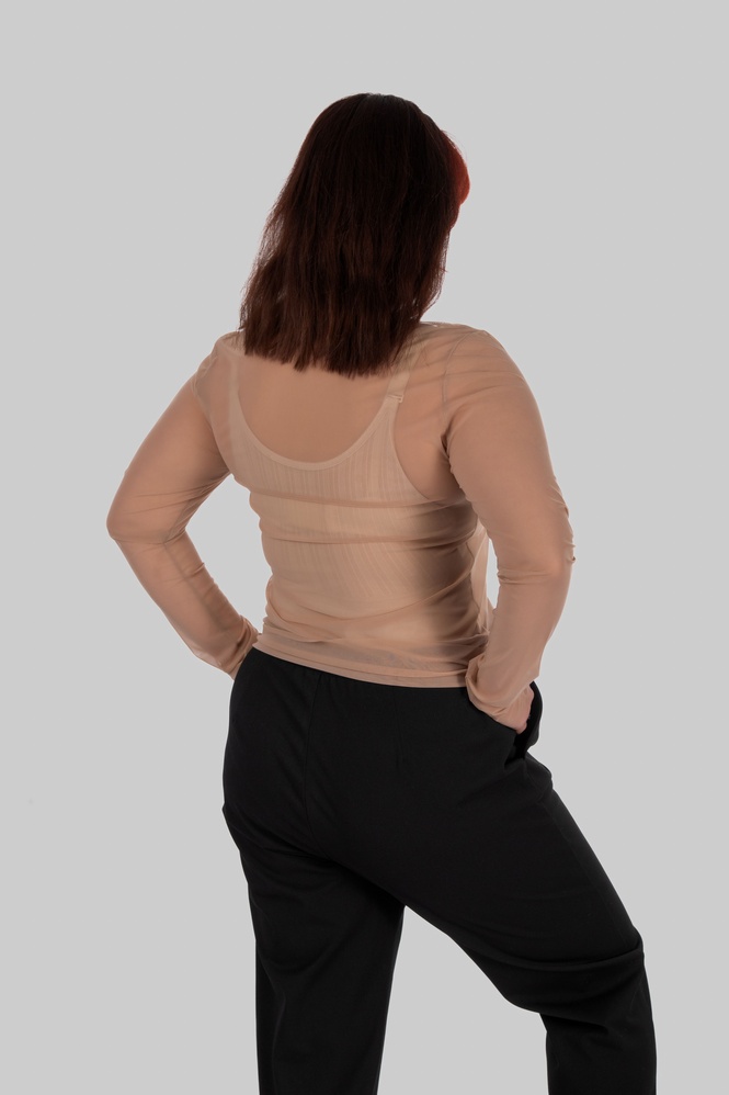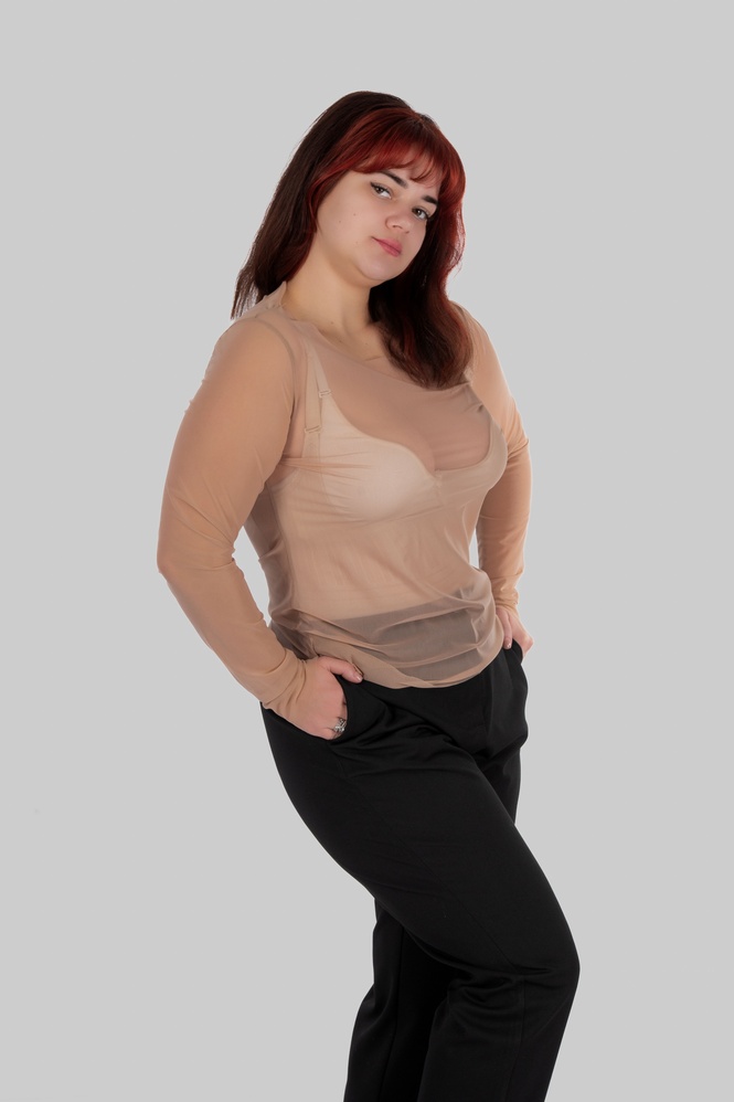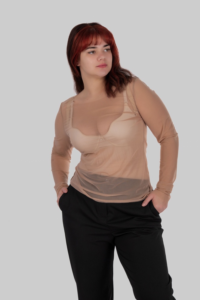 Модель розроблена спеціально для носіння під сорочки, жакети, жилети та сукні, коли важливо зберегти легкість силуету й водночас додати образу завершеності. Сітка м’яко повторює лінії тіла, не створюючи об’єму і не обмежуючи рухів.