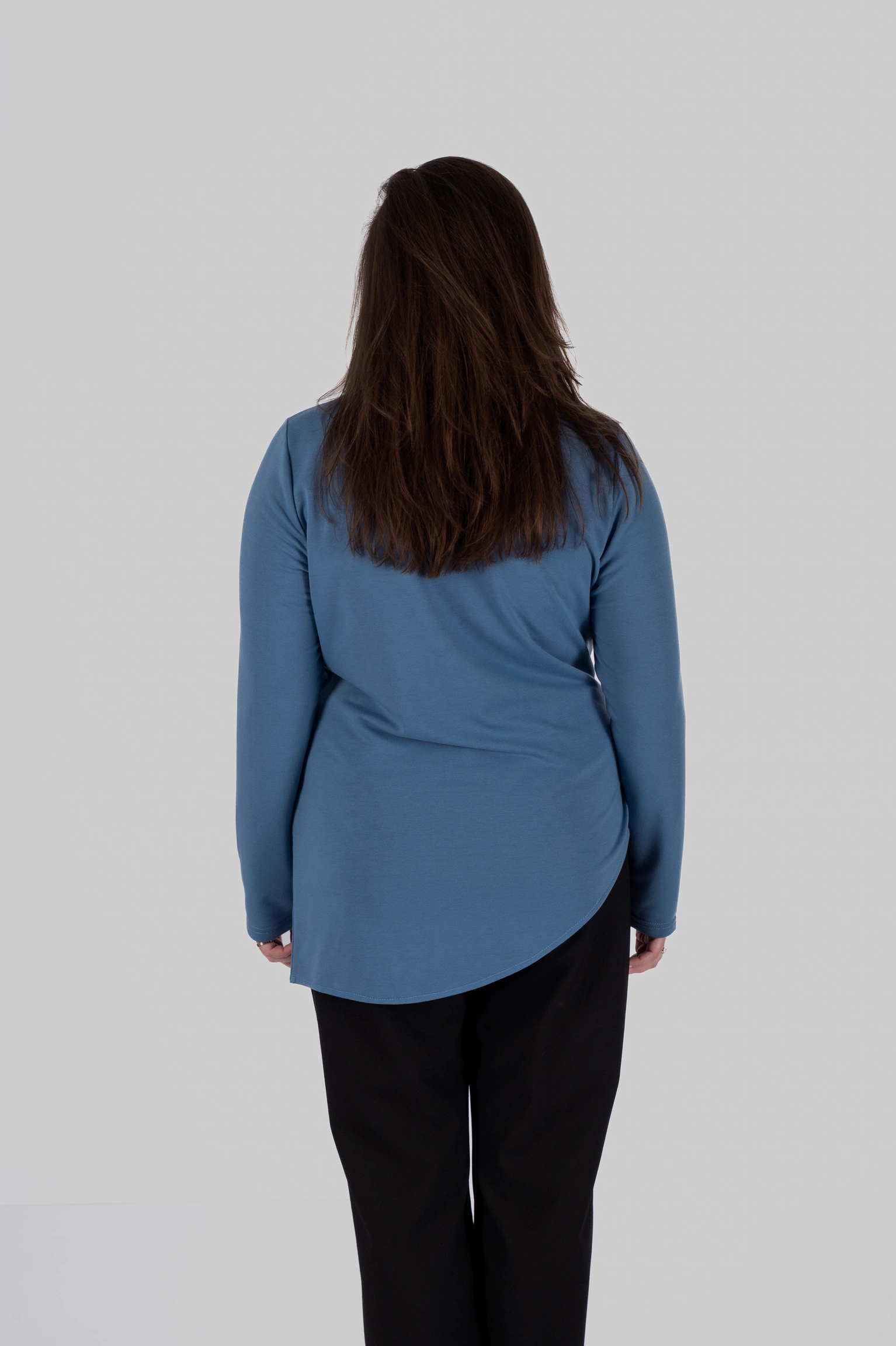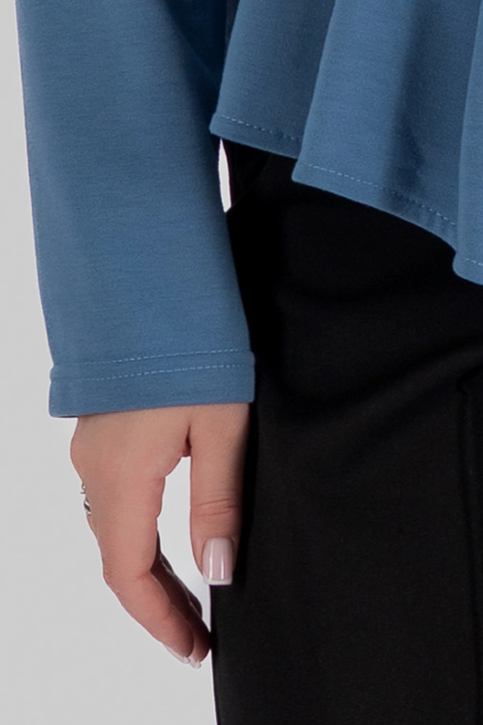 Двохнитка забезпечує стабільність форми: лонгслів тримає задану геометрію, не «пливе» в носінні та виглядає охайно протягом дня. Довгі рукави врівноважують асиметрію й додають моделі універсальності.