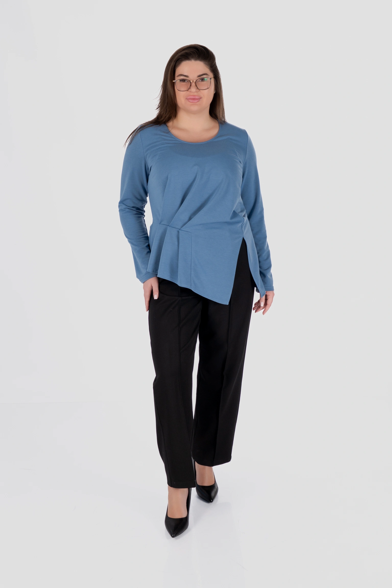 Конструкція побудована так, щоб тканина мʼяко лягала по корпусу, не обтягувавши його. Драпіровка не додає обʼєму, а навпаки — формує напрямок руху погляду зверху вниз, що особливо виграшно працює у щільному матеріалі.