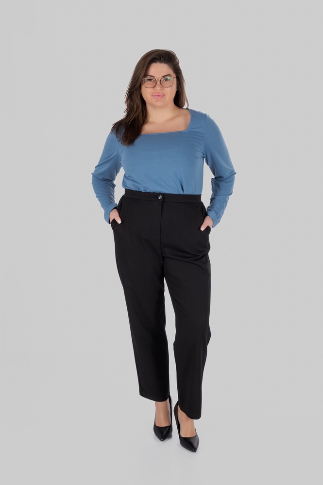 Квадратний виріз є ключовою конструктивною деталлю моделі та формує її характер. Він додає образу графічності та чітко працює з верхньою частиною силуету.