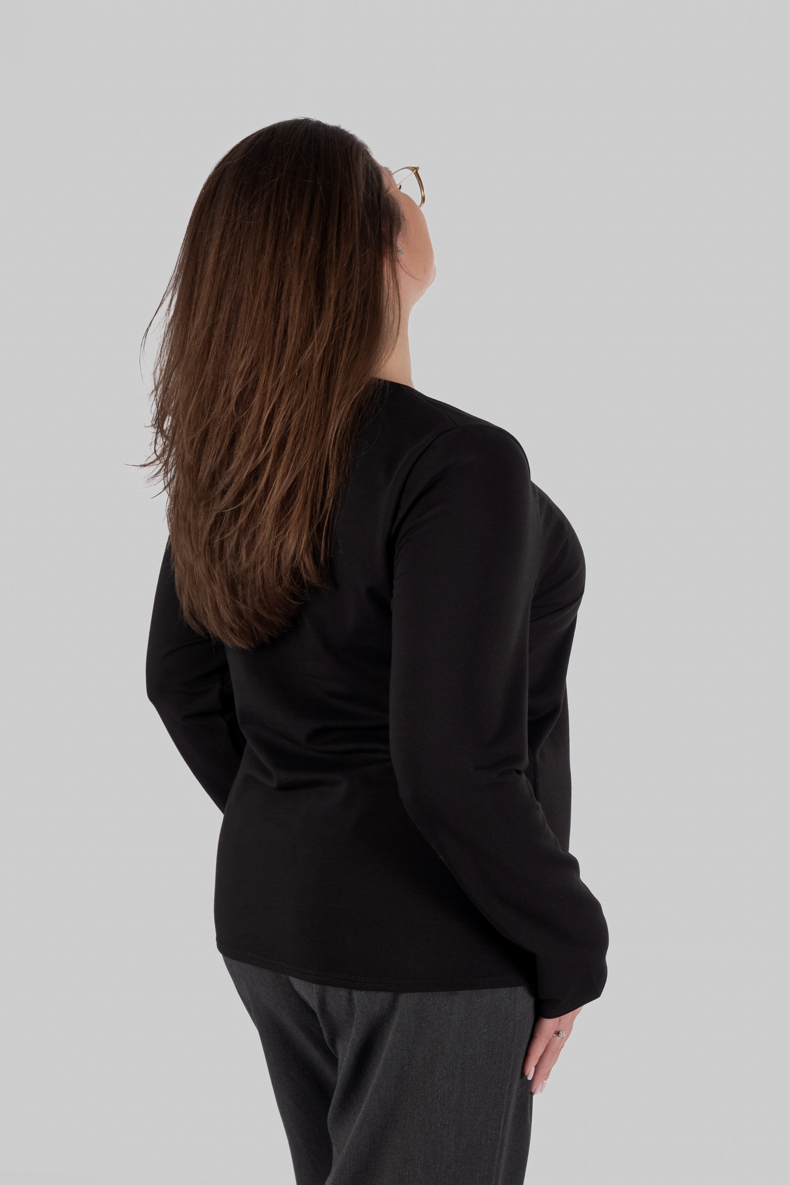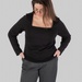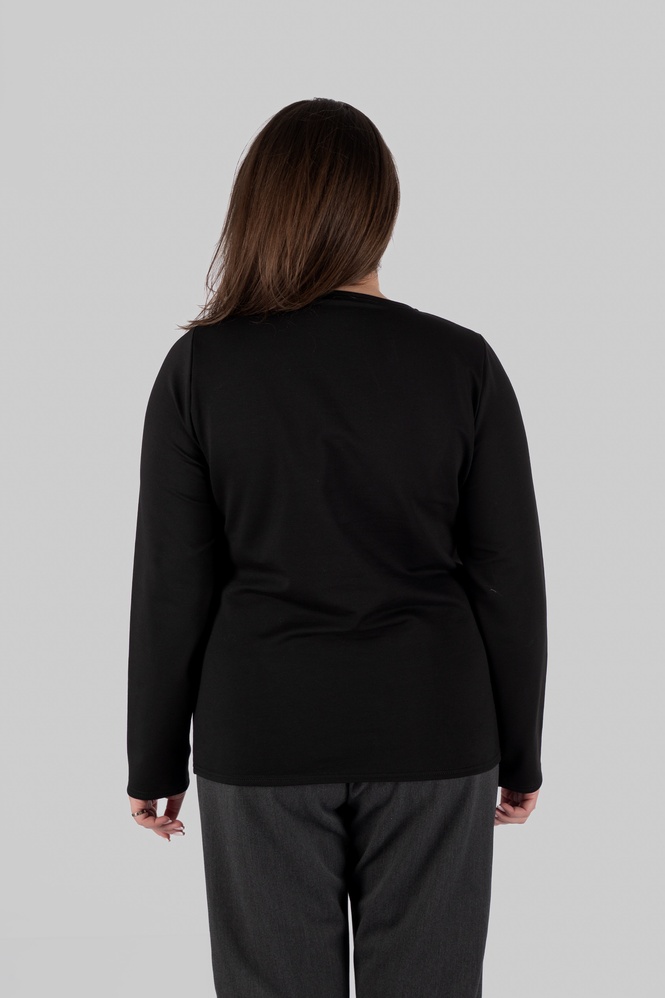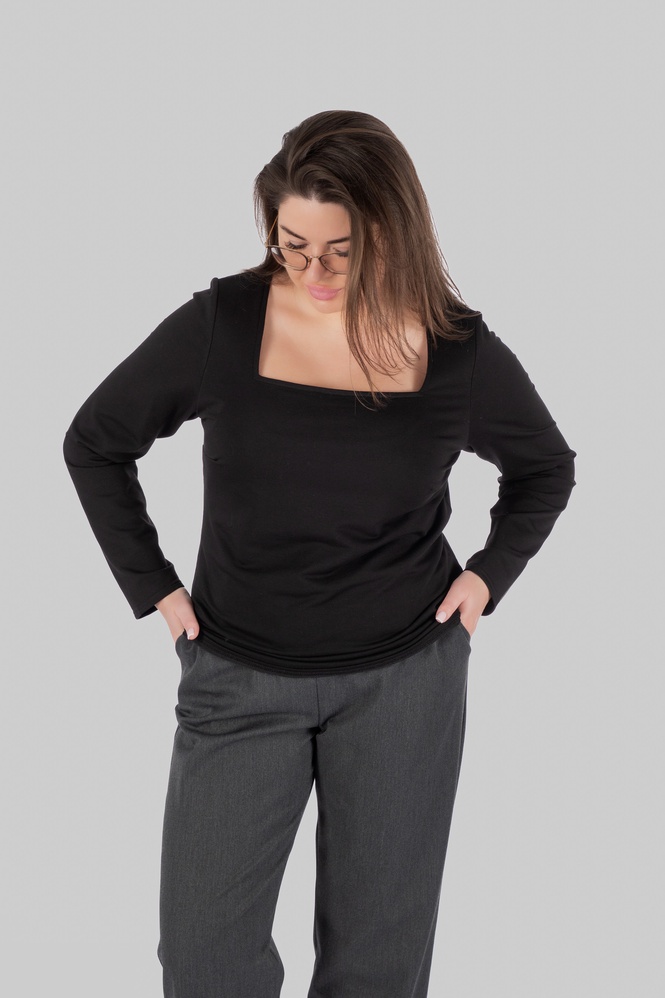 Лонгслів SIRA D — це базова модель у щільному виконанні з чітким архітектурним акцентом. Квадратний виріз формує графічну лінію у верхній частині силуету й додає образу сучасної зібраності.