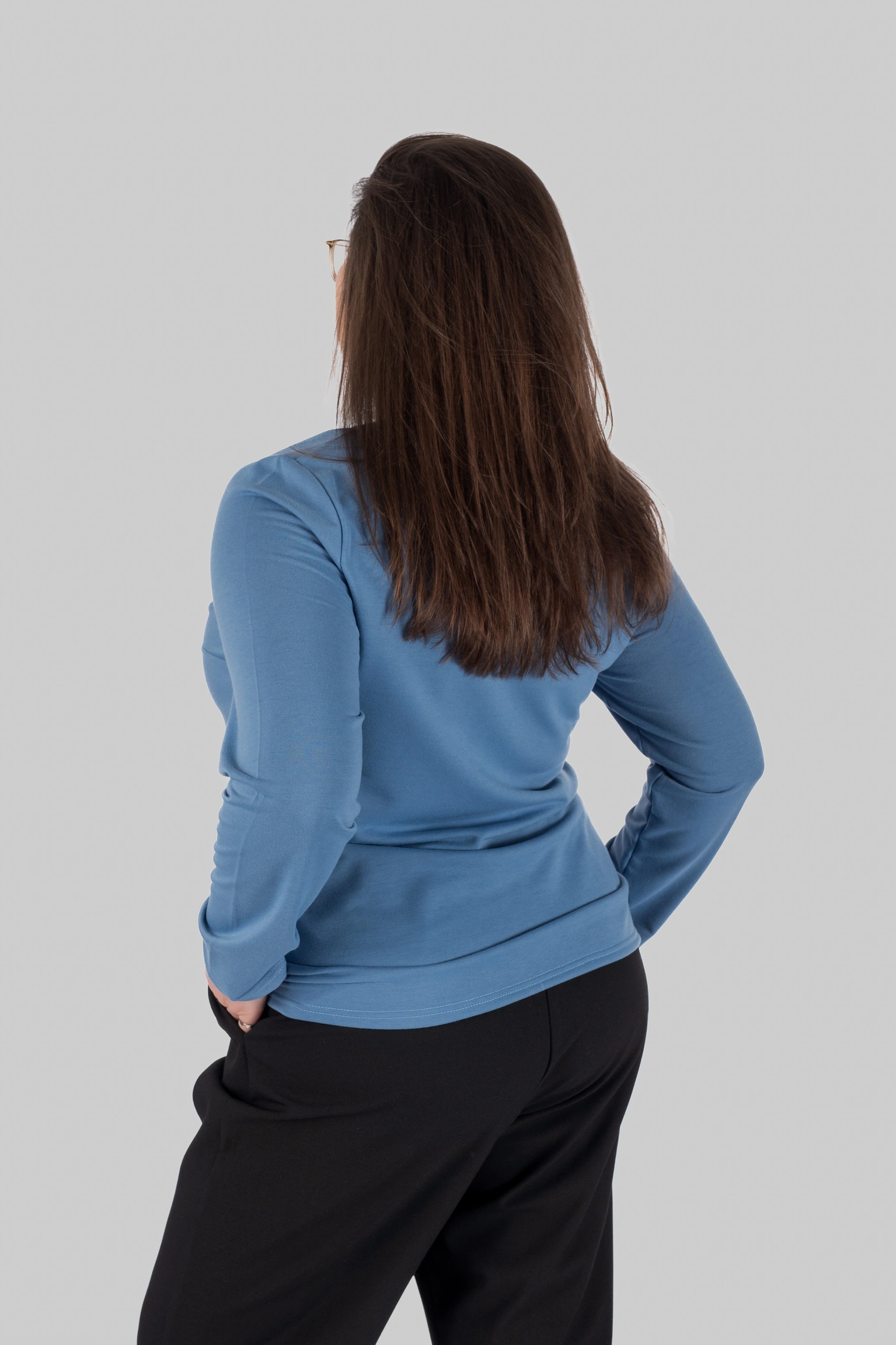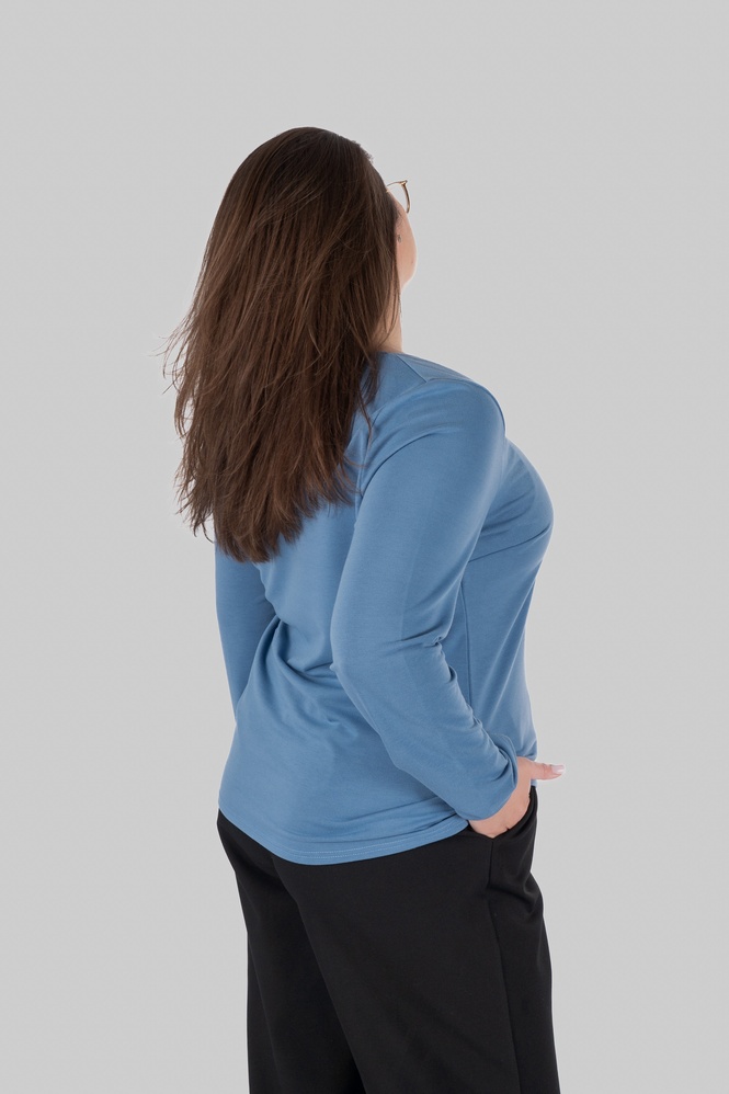 Лонгслів KIRA D — це базова модель у щільному виконанні з більш відкритим, мʼяким характером. Низька кругла горловина формує делікатний акцент у верхній частині силуету, зберігаючи баланс між стриманістю та жіночністю.