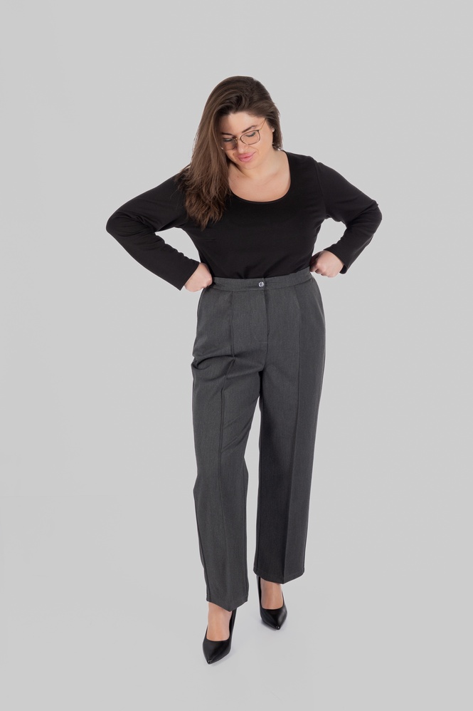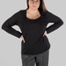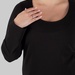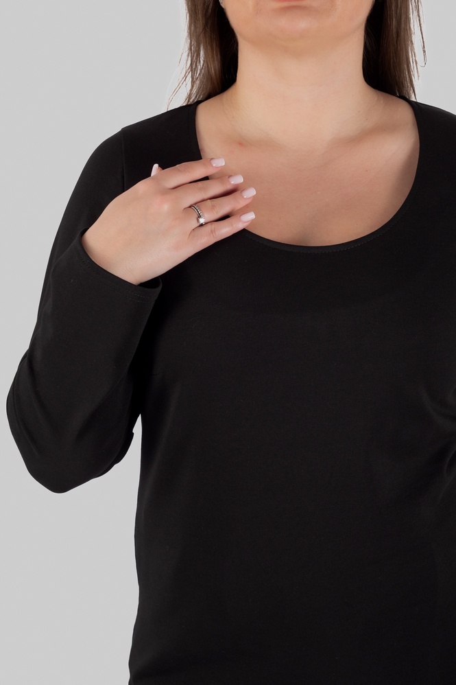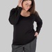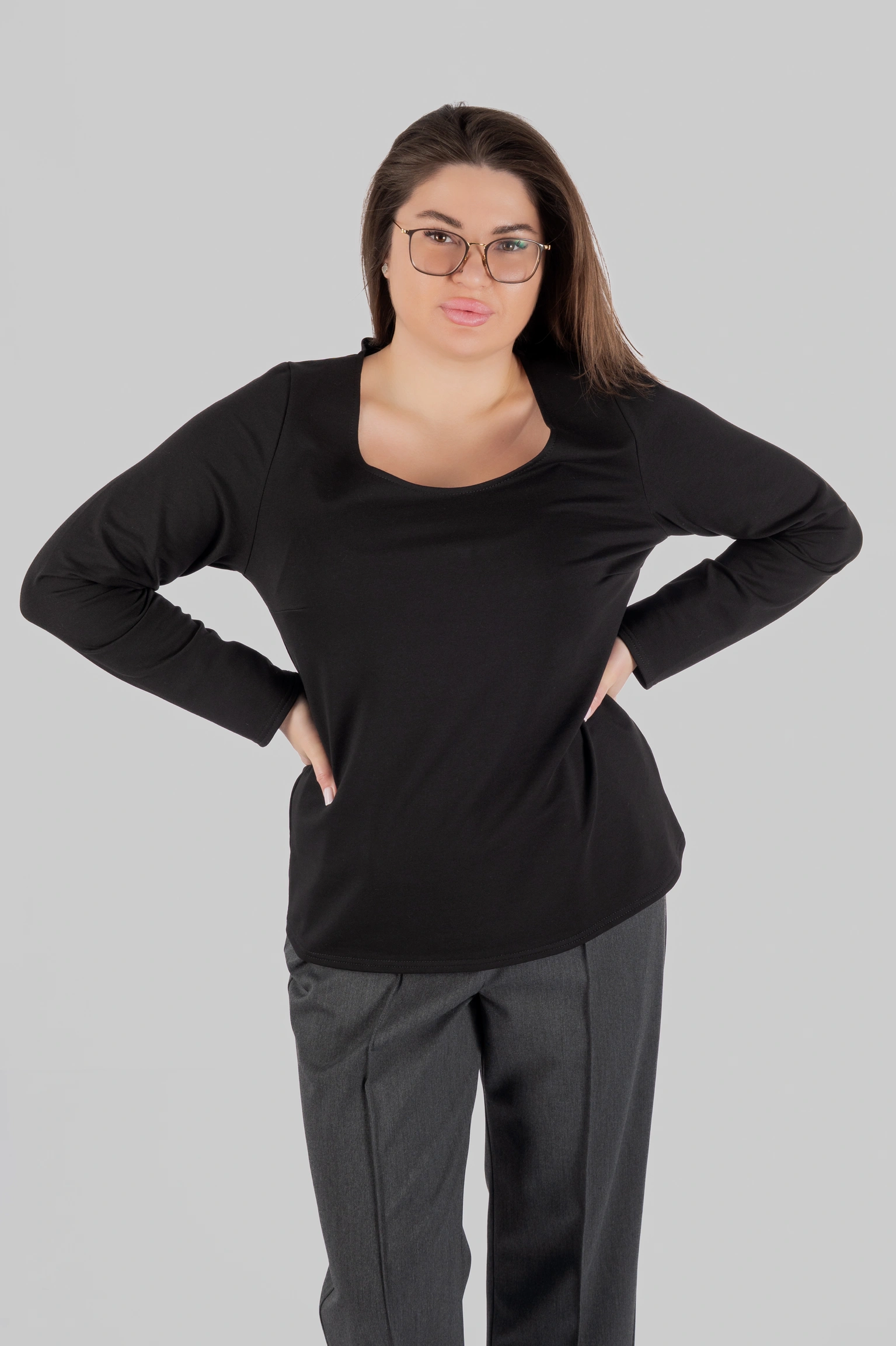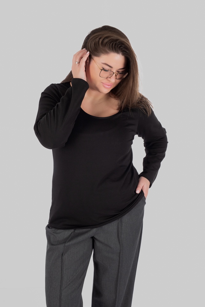 Низька кругла горловина додає образу мʼякості та відкритості, не порушуючи базового характеру моделі.