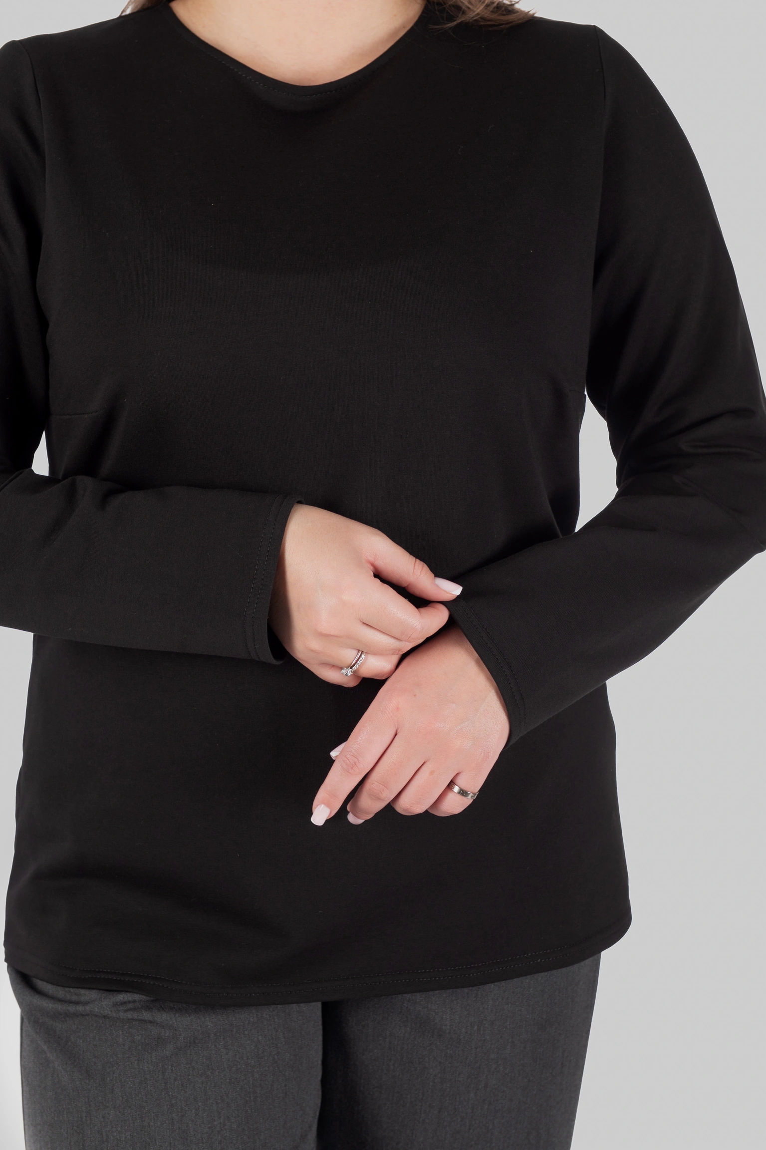 Лонгслів виготовлений з двохнитки — щільного трикотажу, який добре тримає форму та створює відчуття стабільності в носінні.