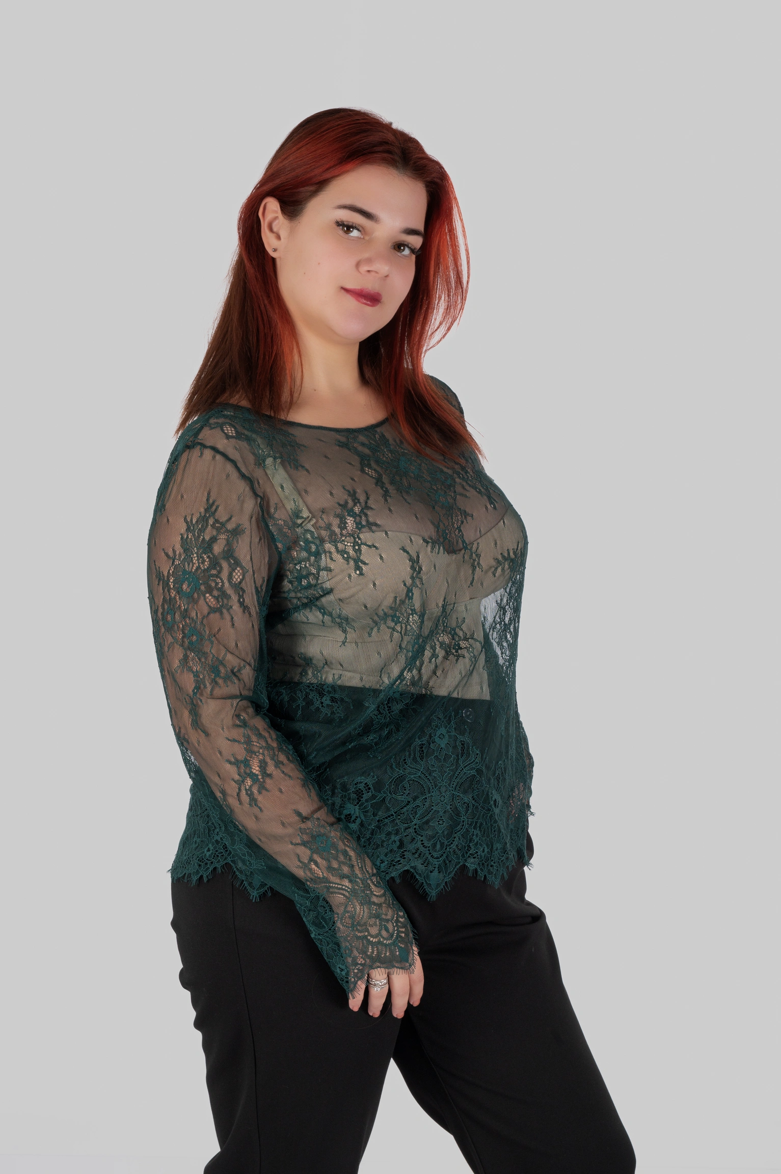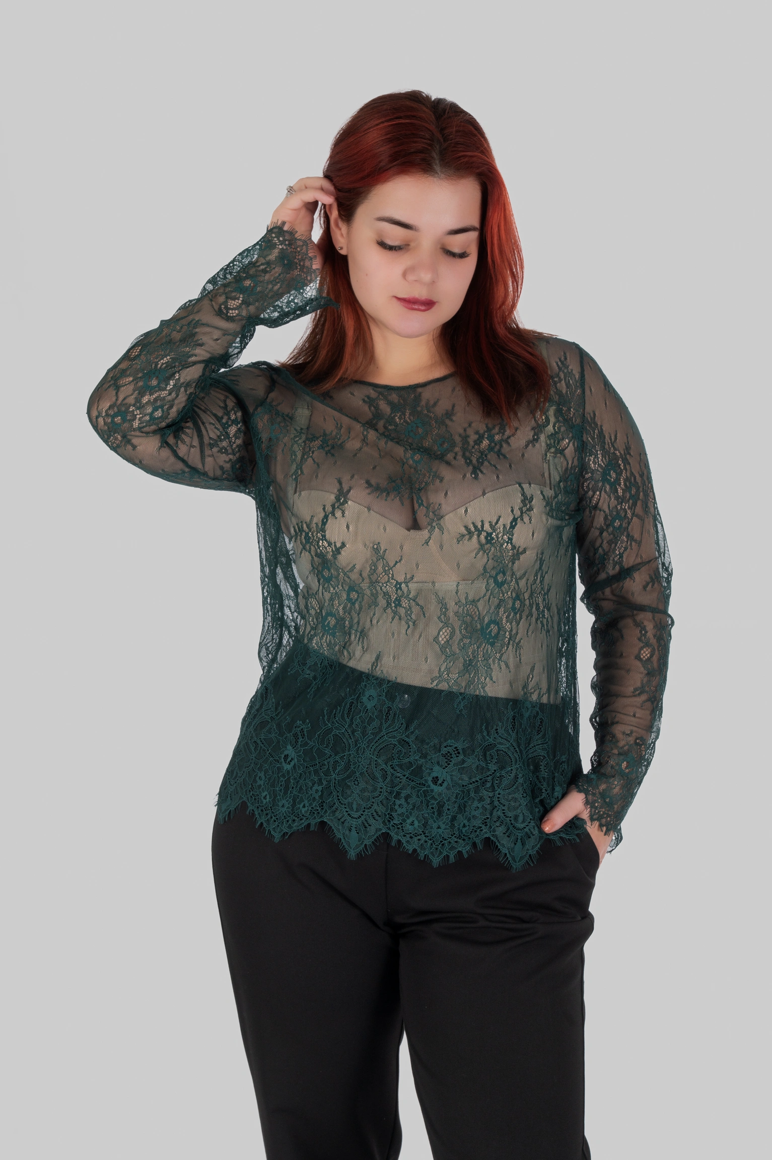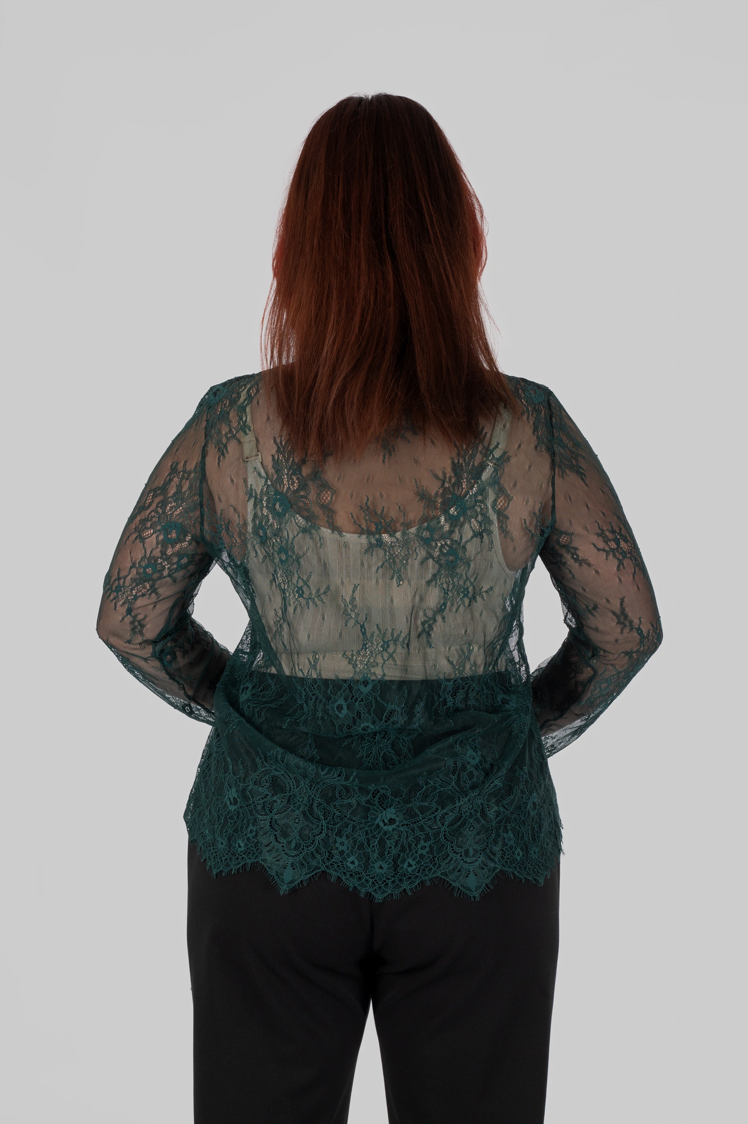 • Крій побудований з урахуванням напрямку візерунка мережива.