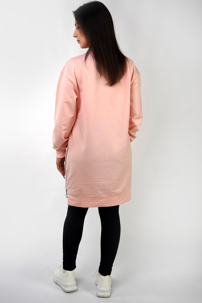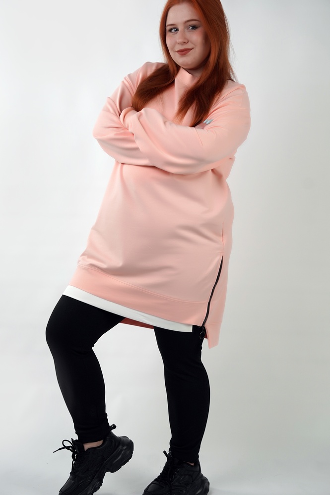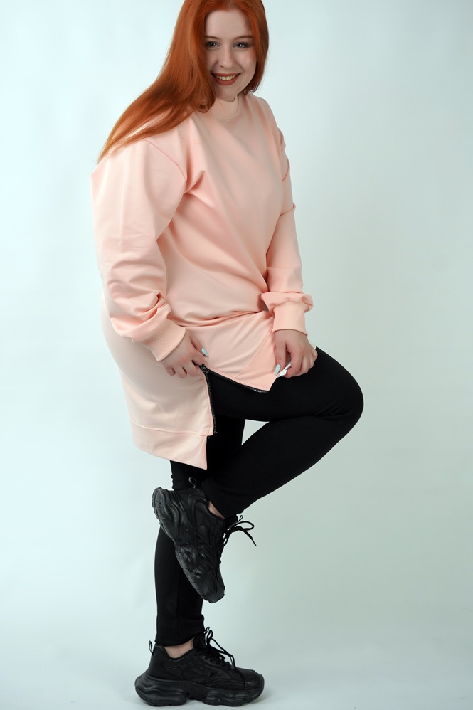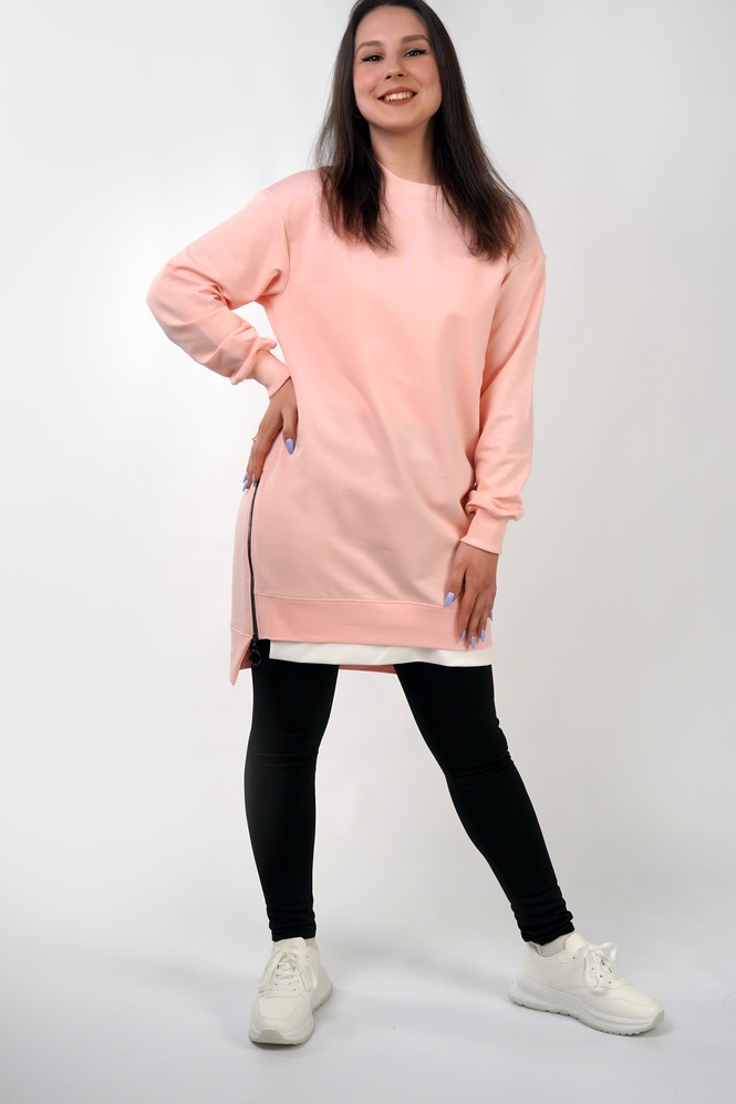 FreshMood — подовжена туніка-світшот, яка закриває питання “що швидко вдягнути і виглядати нормально”. Вільний крій дає комфорт у русі, а контрастна нижня вставка створює ефект двошаровості — образ виглядає зібрано навіть без складних комбінацій. Бічні розрізи на блискавках — не просто декор: вони додають свободи кроку і дозволяють регулювати посадку по стегнах.