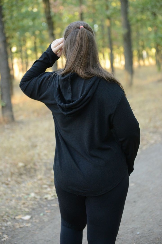 Довжина: подовжена, закриває стегна — ідеально під легінси/вузькі штани.