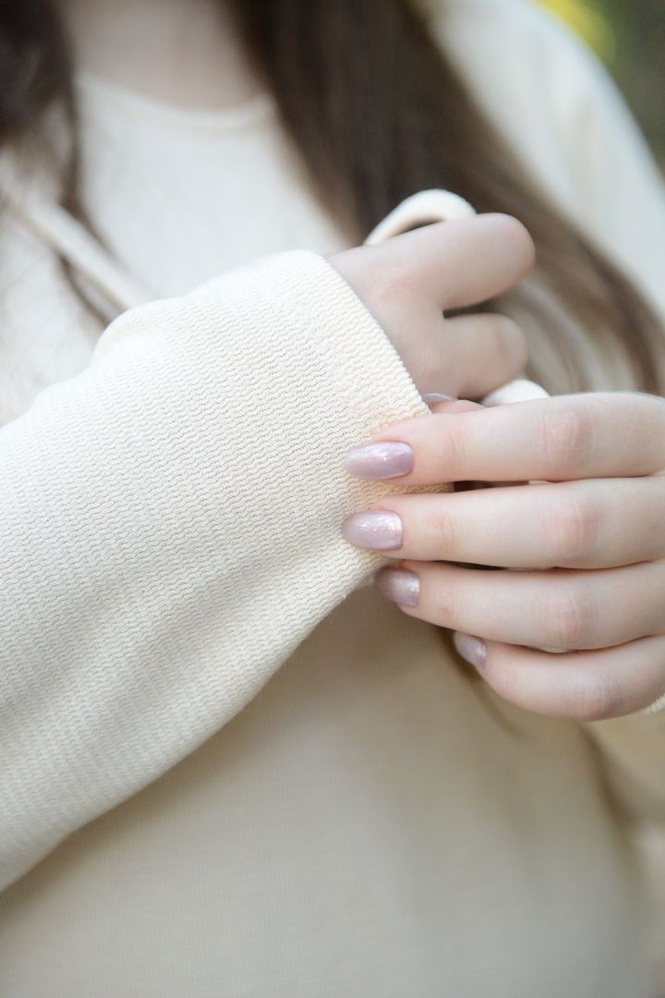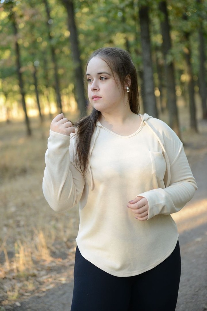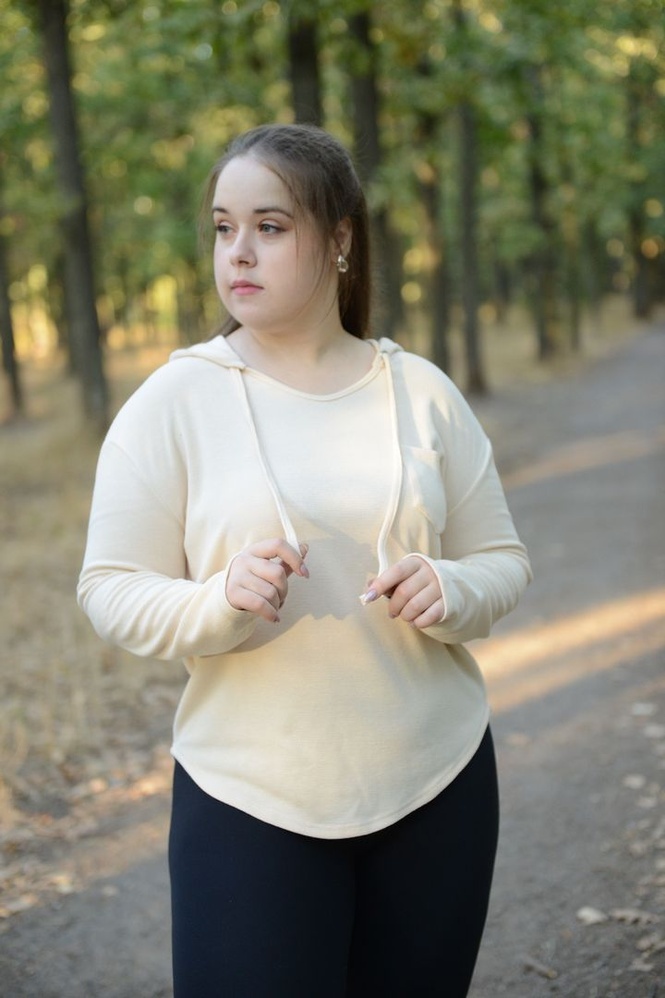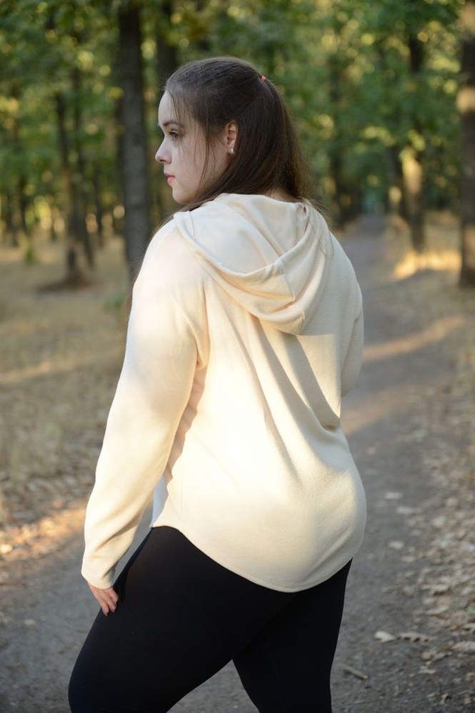 Фішка моделі — фактурний трикотаж (з вираженою текстурою), який виглядає дорожче за “звичайний гладкий”. V-подібний виріз відкриває шию, а аккуратний капюшон зі шнурками додає сучасний casual-настрій без спортивного перекосу. Є накладна кишеня на грудях — маленька деталь, яка робить річ “живою”.