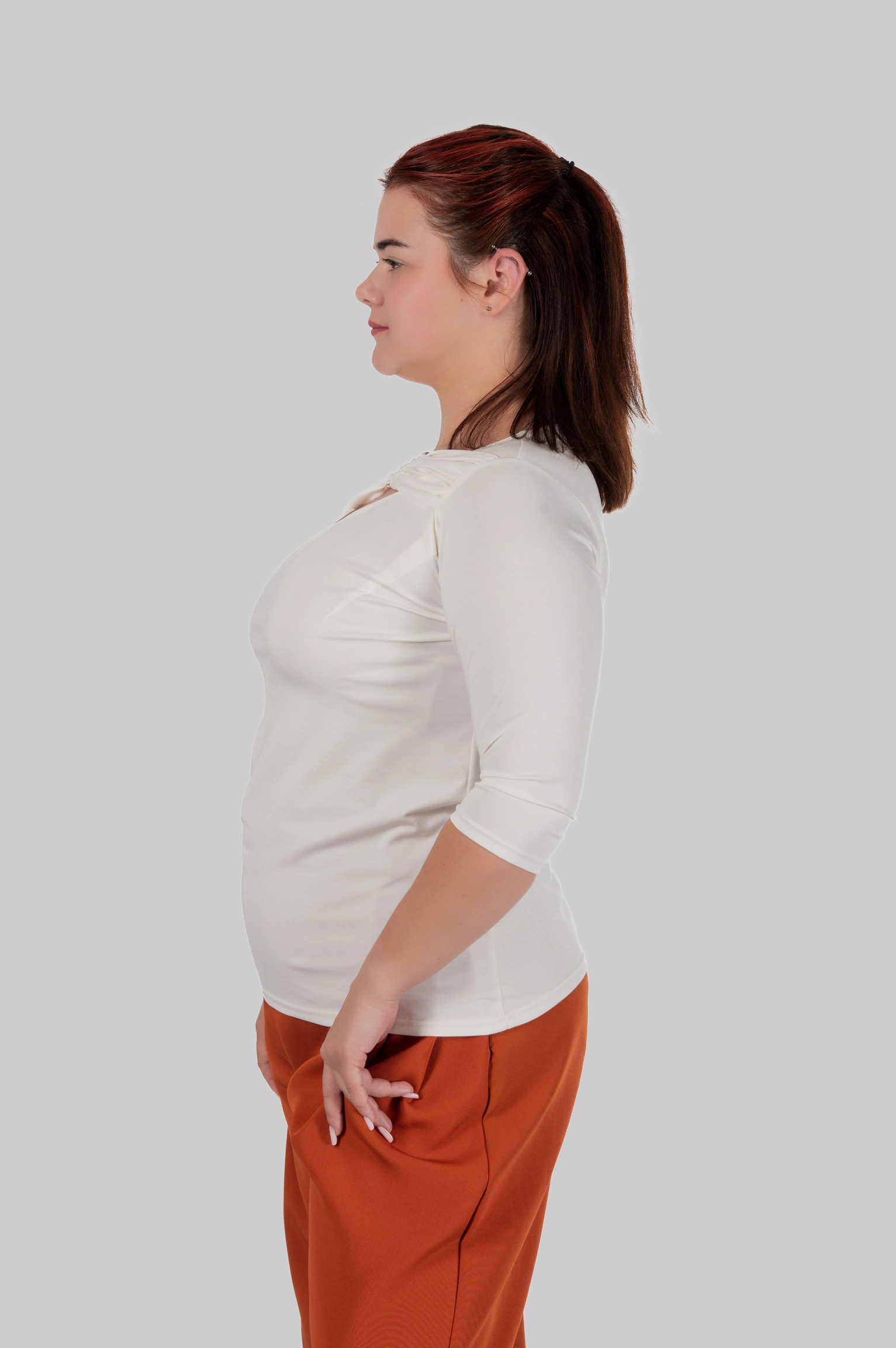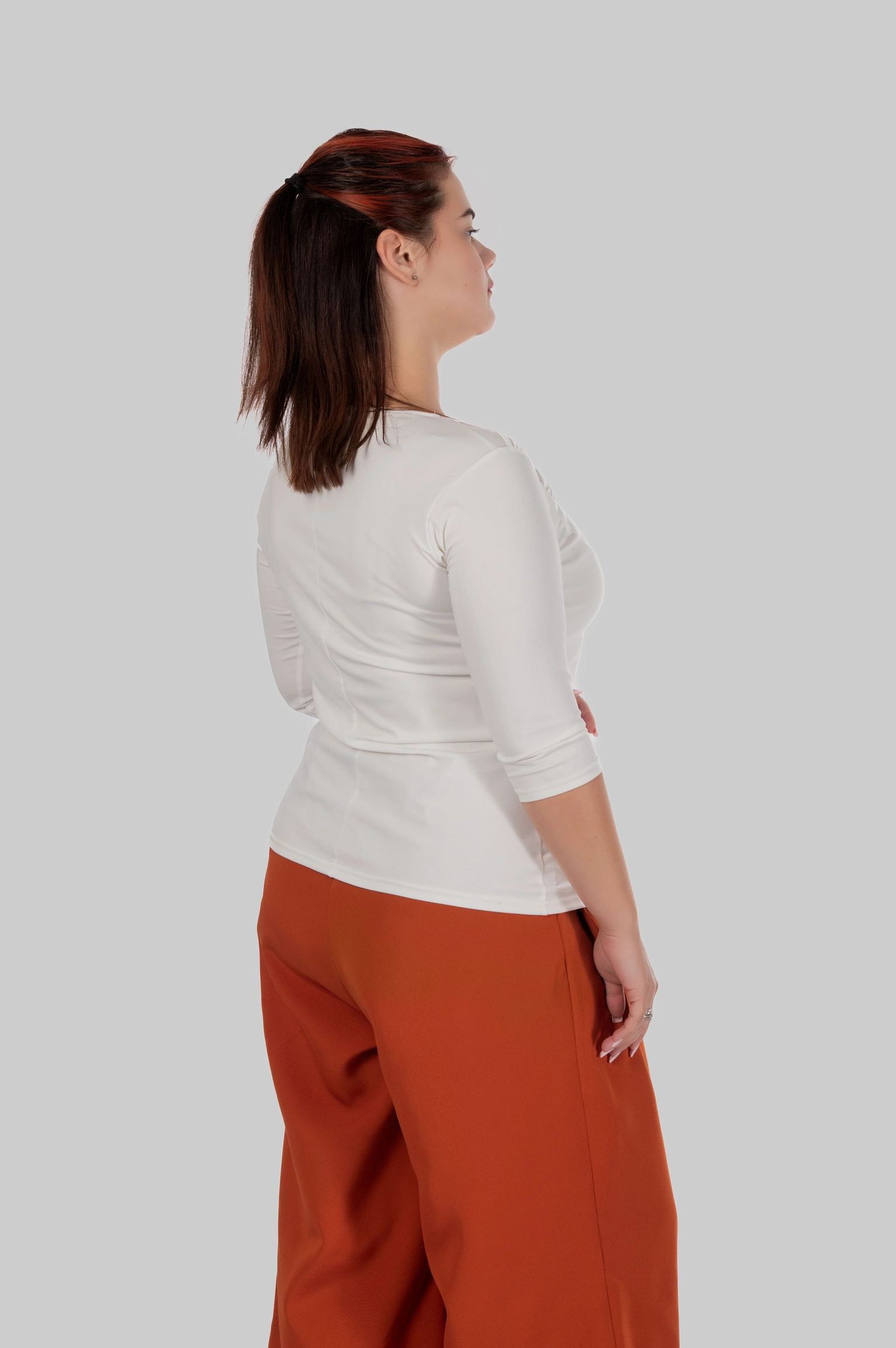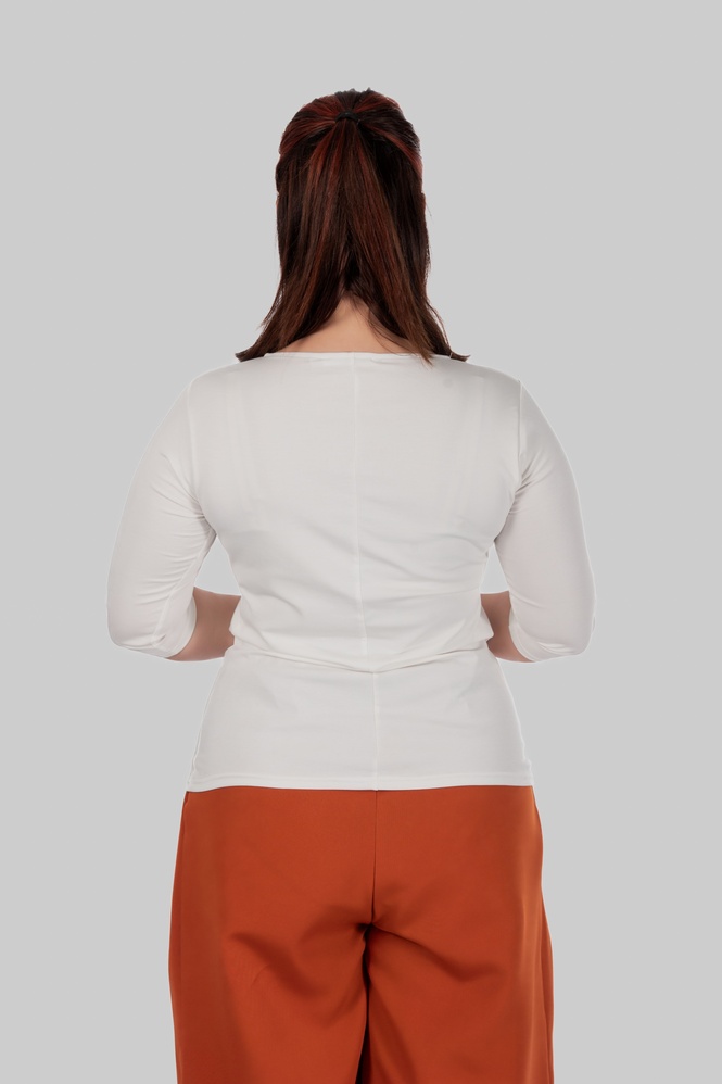 Рукав 3/4 відкриває найтоншу частину руки, додаючи легкості образу. Це універсальне рішення для щоденного гардеробу, роботи або зустрічей.