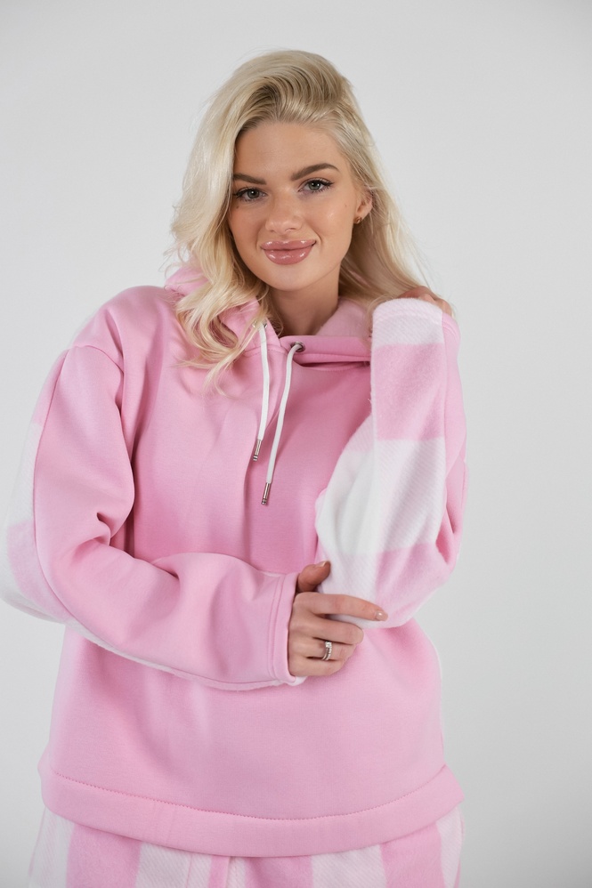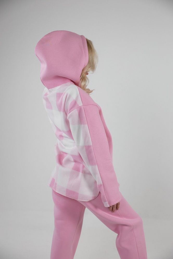 ✔ Контрастні деталі – спинка, половина рукавів і низ худі оформлені тканиною в клітинку, що гармонійно поєднується з основним кольором.