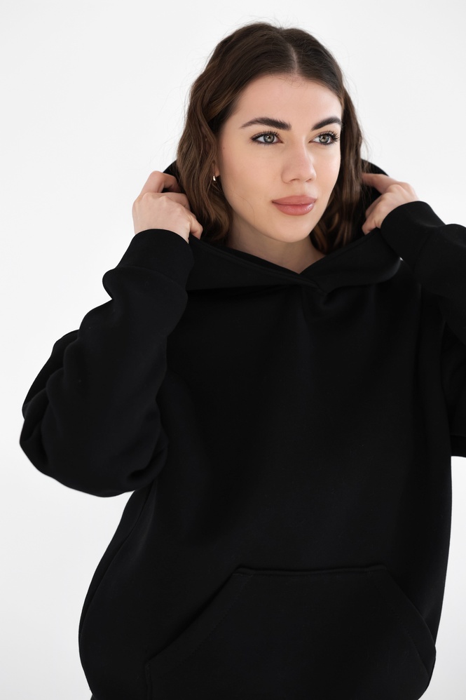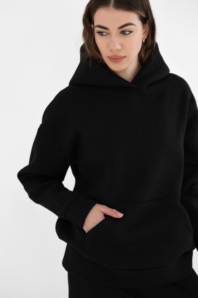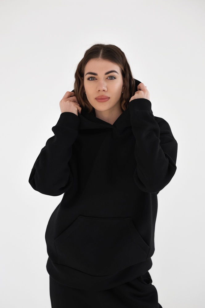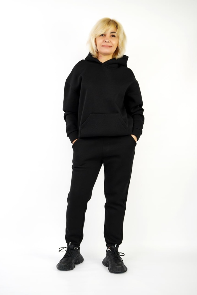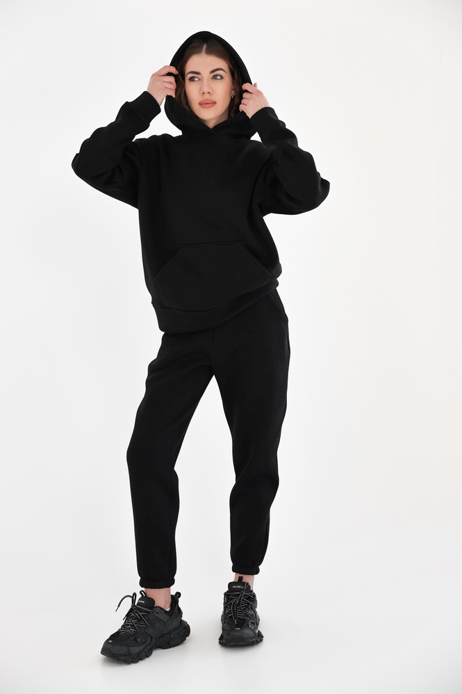 Тканина — трьохнитка з начосом: тепла, приємна до тіла, з відчуттям “обіймає”, але без громіздкості. Костюм добре працює як комплект і так само легко розбивається на окремі речі — худі з джинсами, штани з базовою футболкою або гольфом.