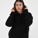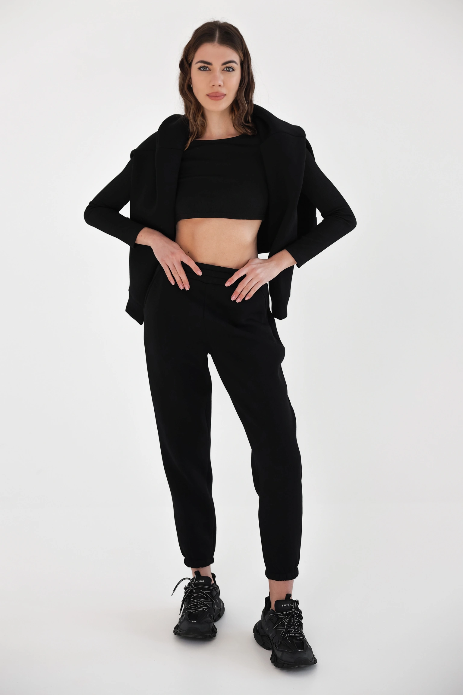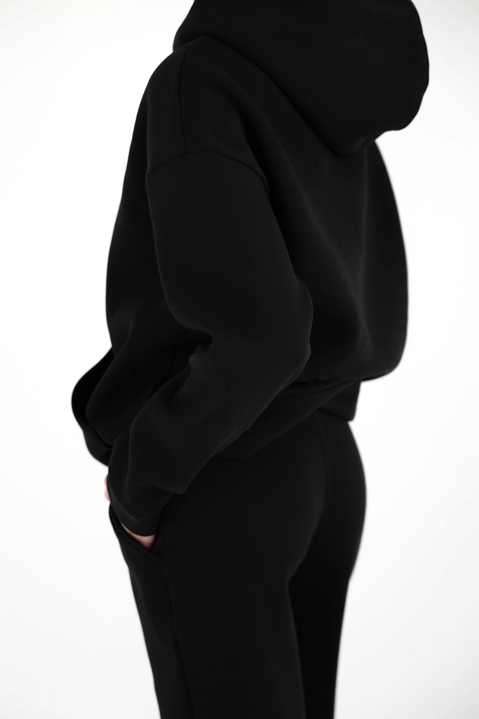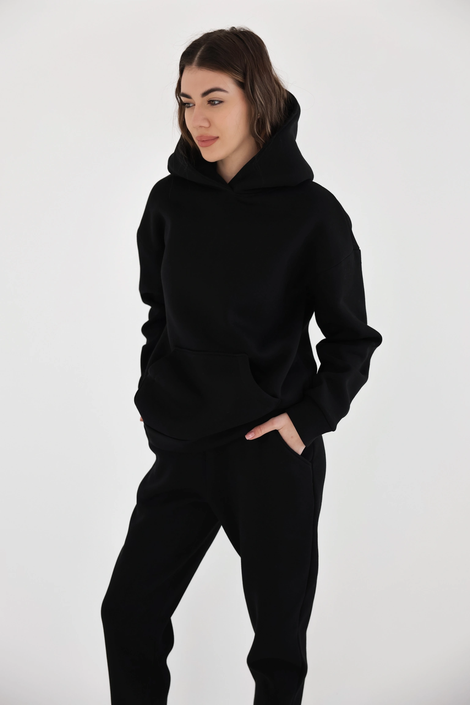 Тканина — трьохнитка з начосом: тепла, приємна до тіла, з відчуттям “обіймає”, але без громіздкості. Костюм добре працює як комплект і так само легко розбивається на окремі речі — худі з джинсами, штани з базовою футболкою або гольфом.
