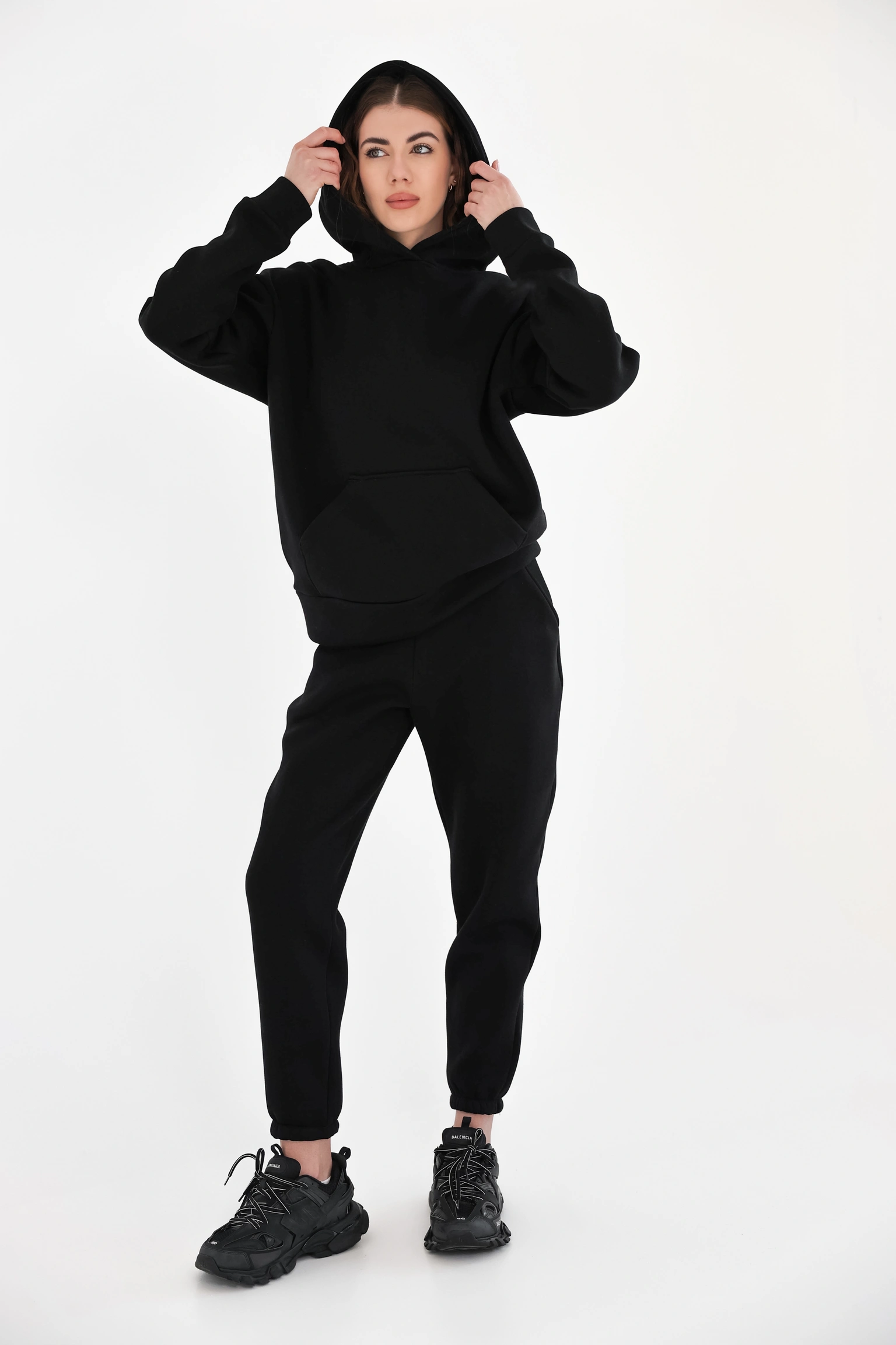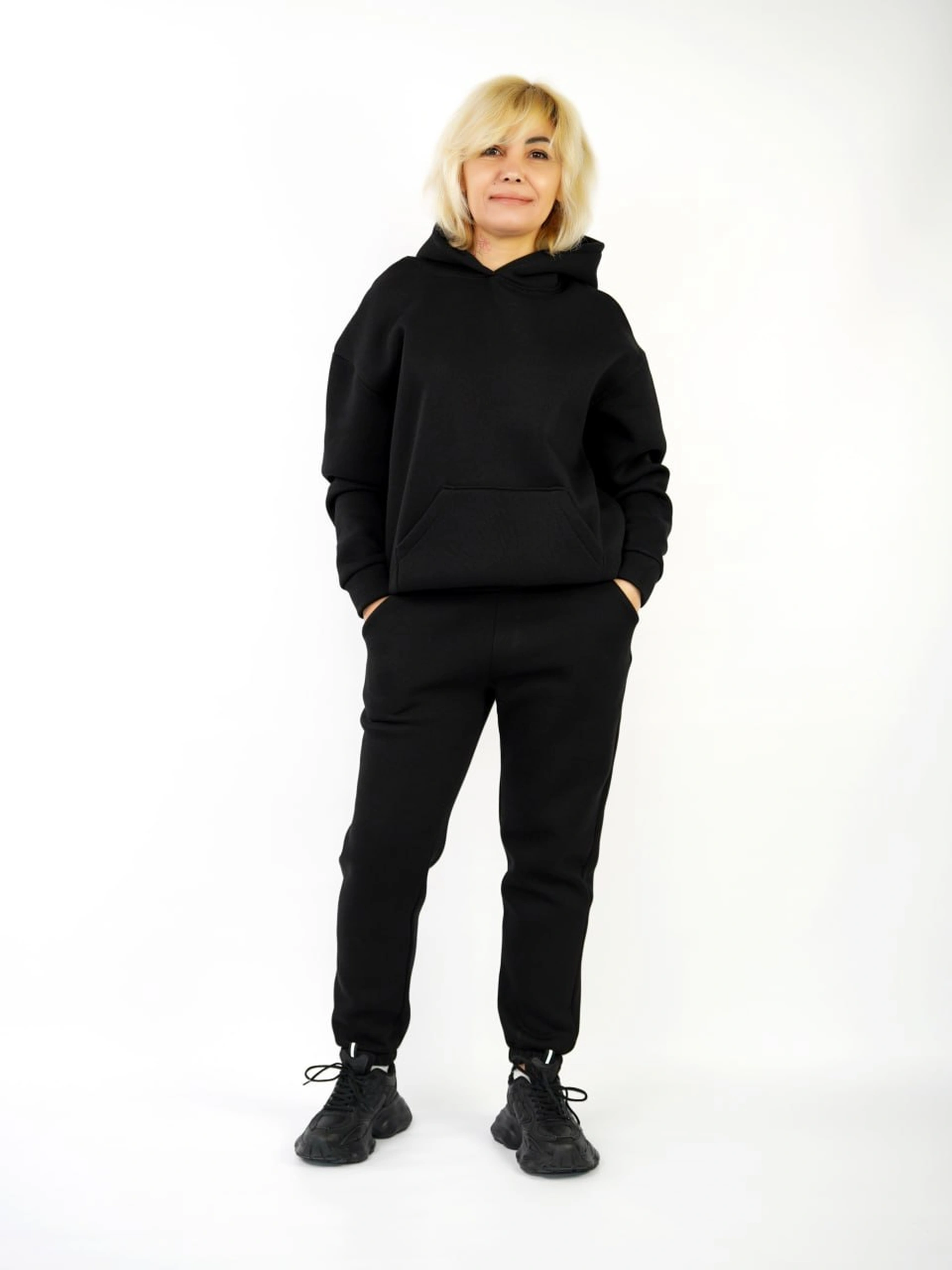 Худі має подвійний капюшон, який краще лягає по голові та виглядає щільніше, а кишеня-кенгуру додає практичності — для рук або дрібниць. Штани — зручні, з м’якою посадкою, які не сковують рухів і комфортні для активного дня: поїздки, прогулянки, справи, робота в динаміці.