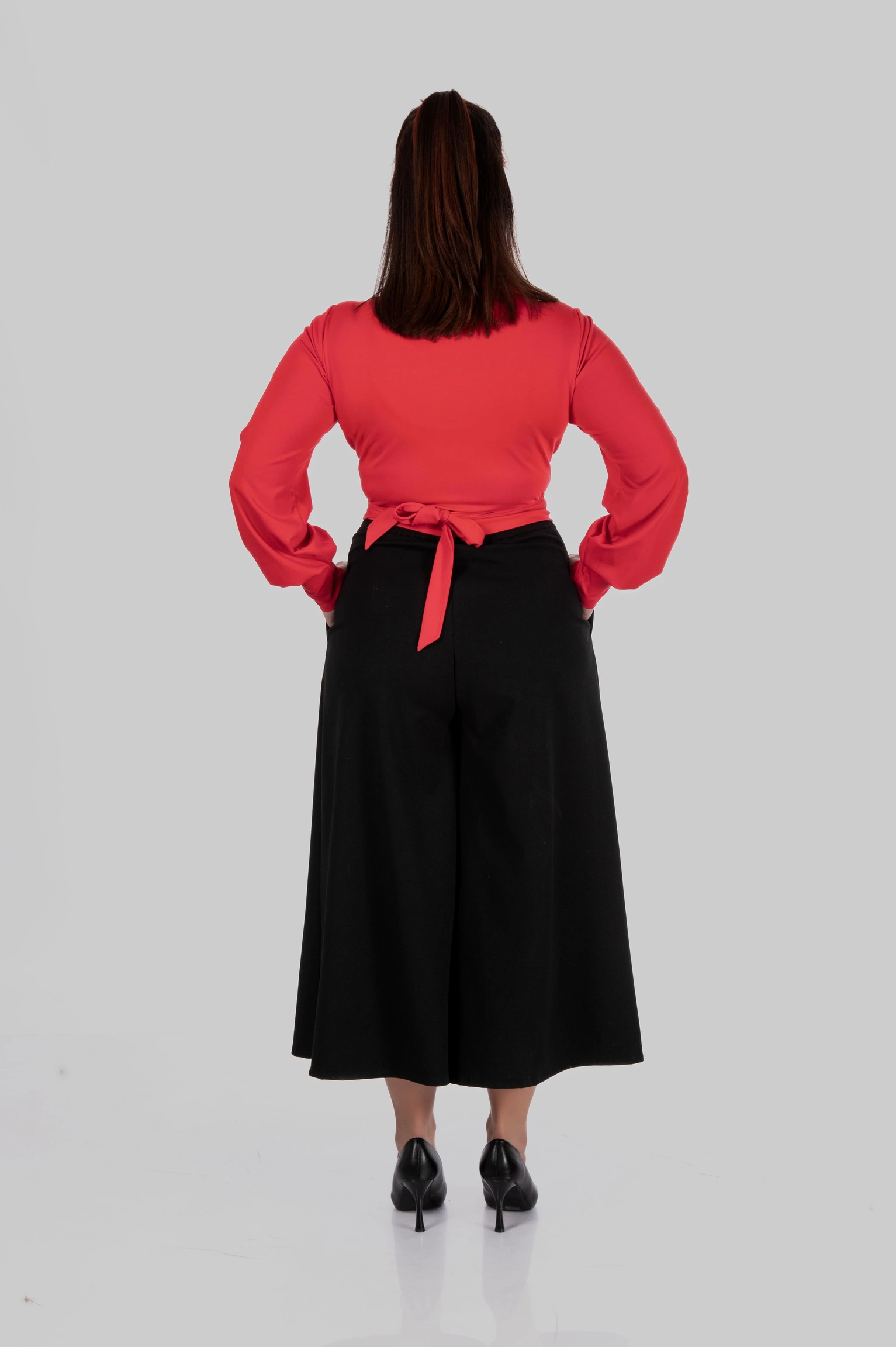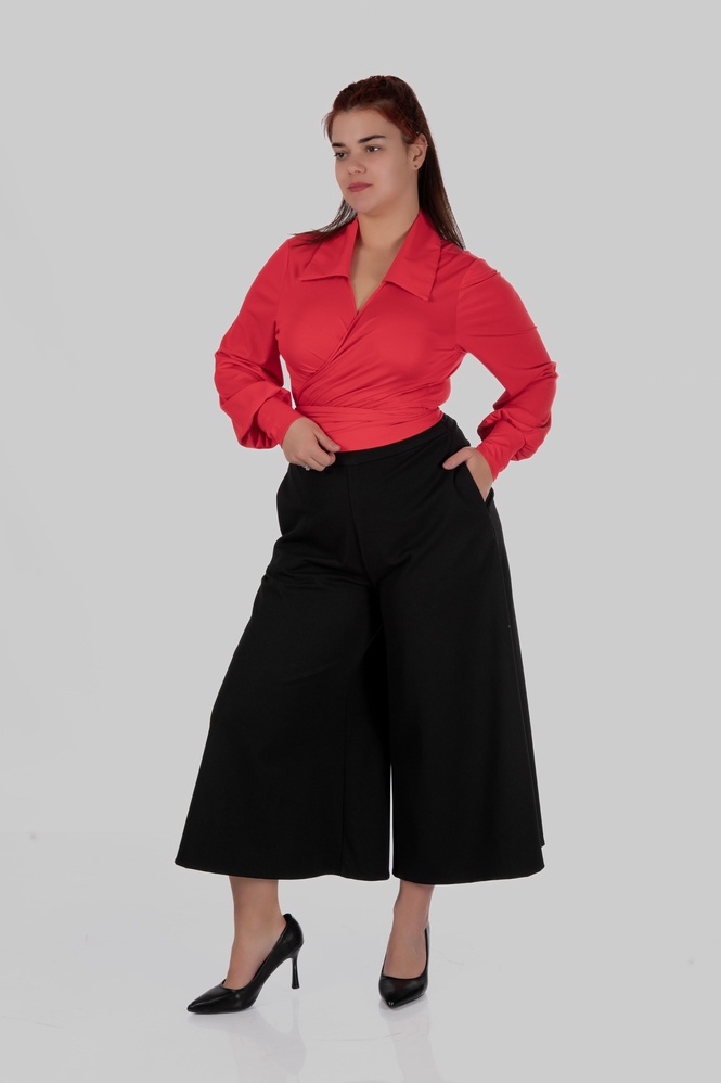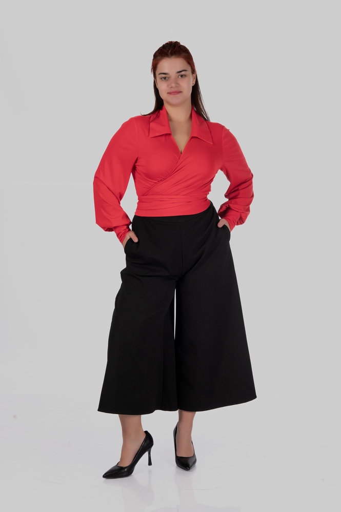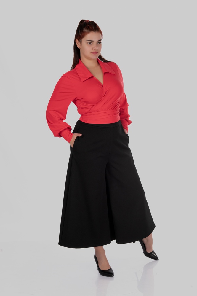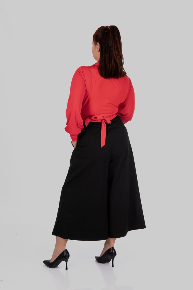 Кюлоти мають вільний крій і високу посадку, що дозволяє комфортно адаптувати їх під різні типи фігур. Орієнтуйтесь на обхват талії та стегон.