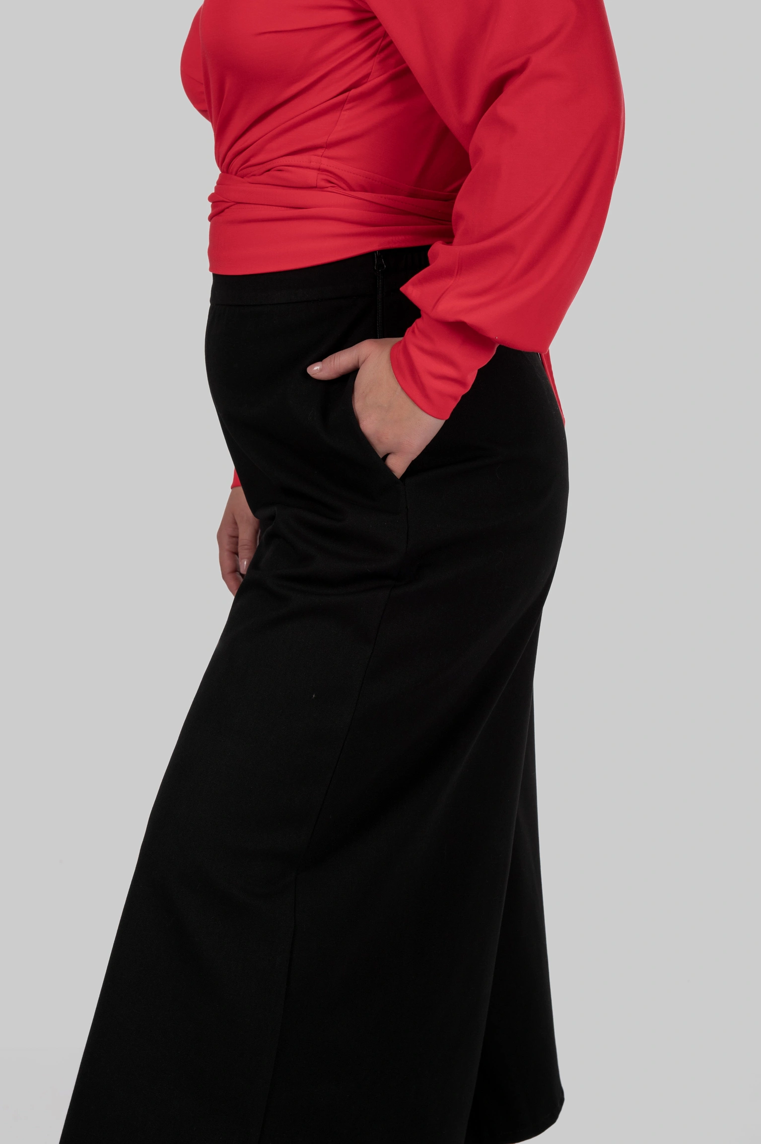 Висока посадка формує лінію талії і візуально витягує ноги. Пояс не перетискає живіт, а м’яко адаптується завдяки резинці ззаду — ти виглядаєш зібрано, але відчуваєш комфорт протягом усього дня.