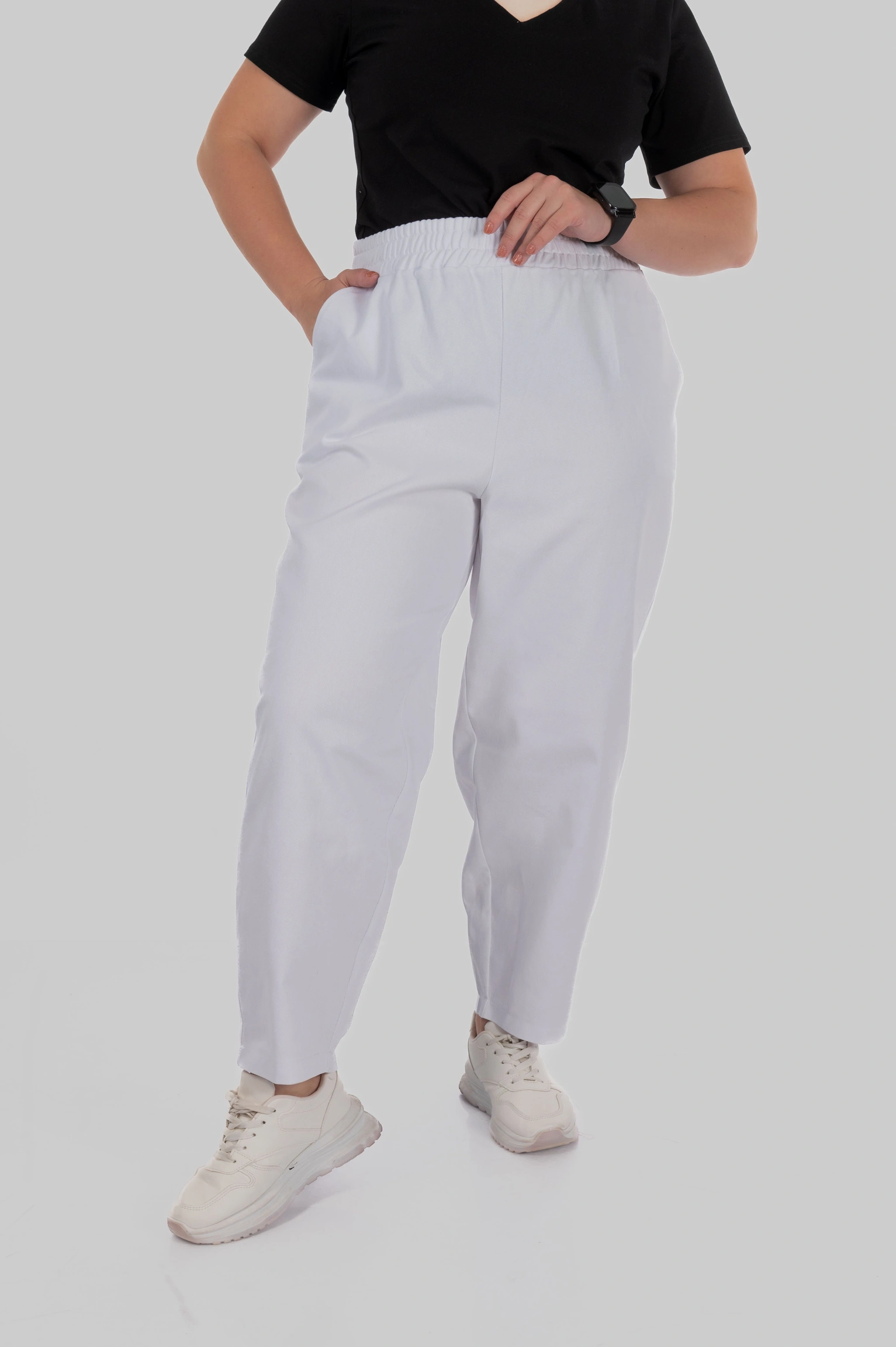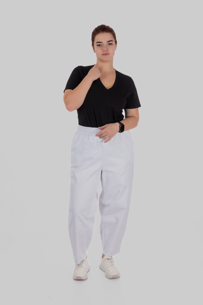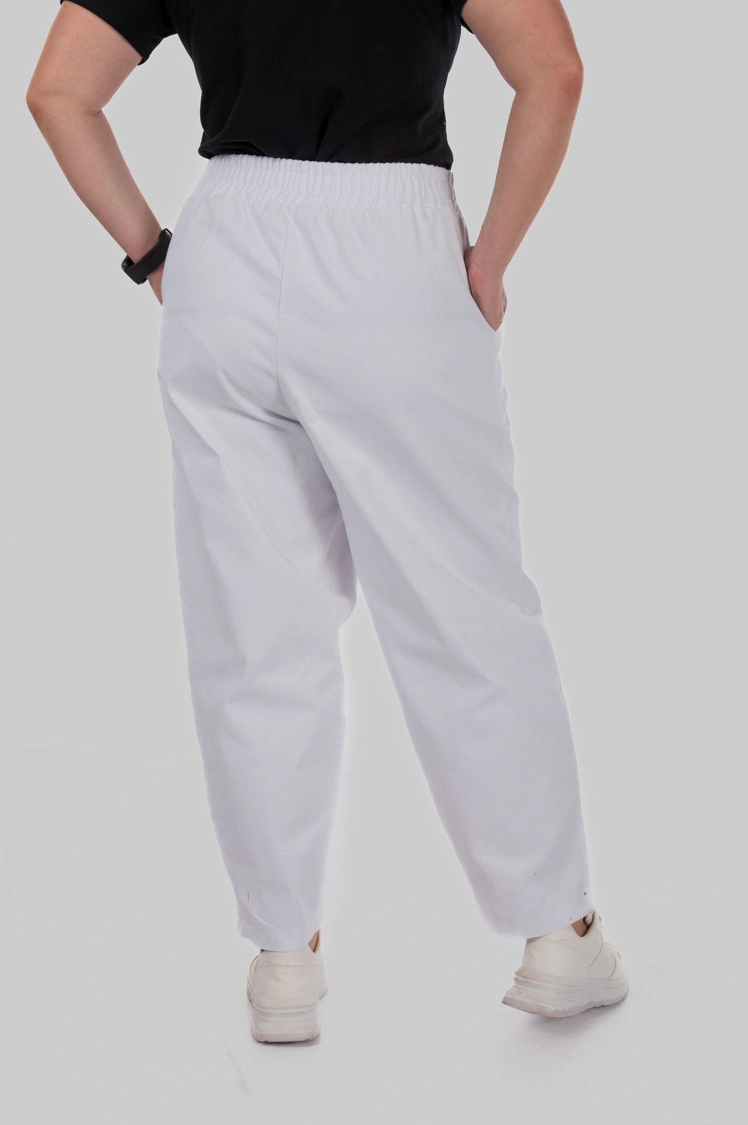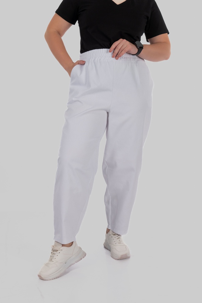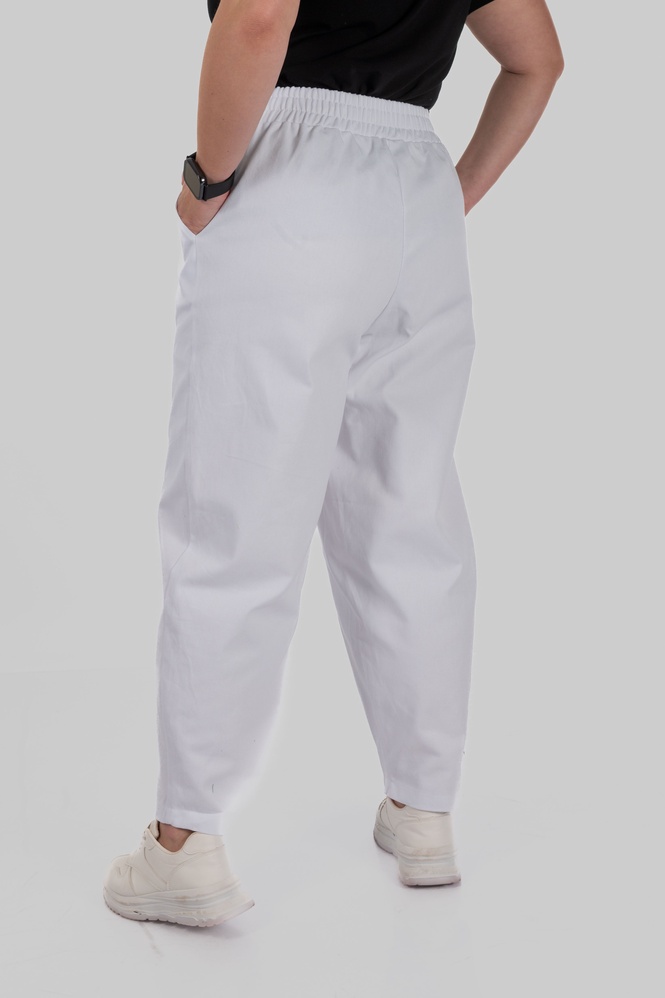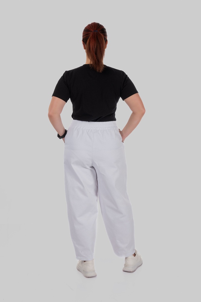 Штани мають комфортну посадку і пояс на м’якій еластичній резинці, завдяки чому модель добре адаптується до різних пропорцій фігури. Силует м’яко лягає по стегнах і злегка звужується донизу, формуючи сучасний баланс між комфортом і акуратною формою.