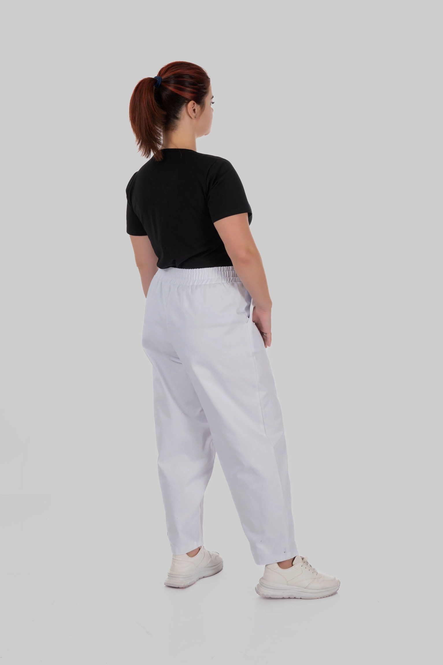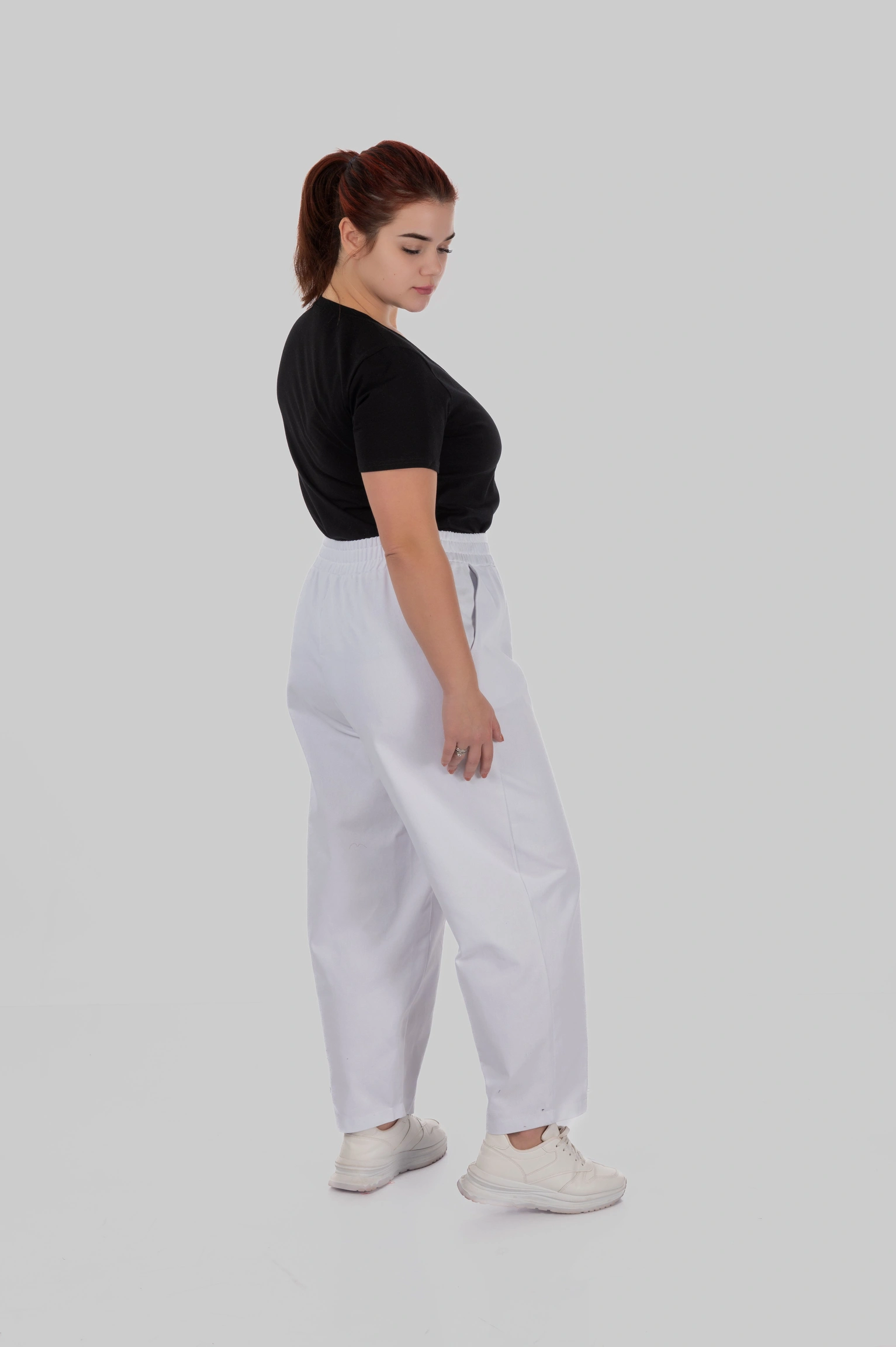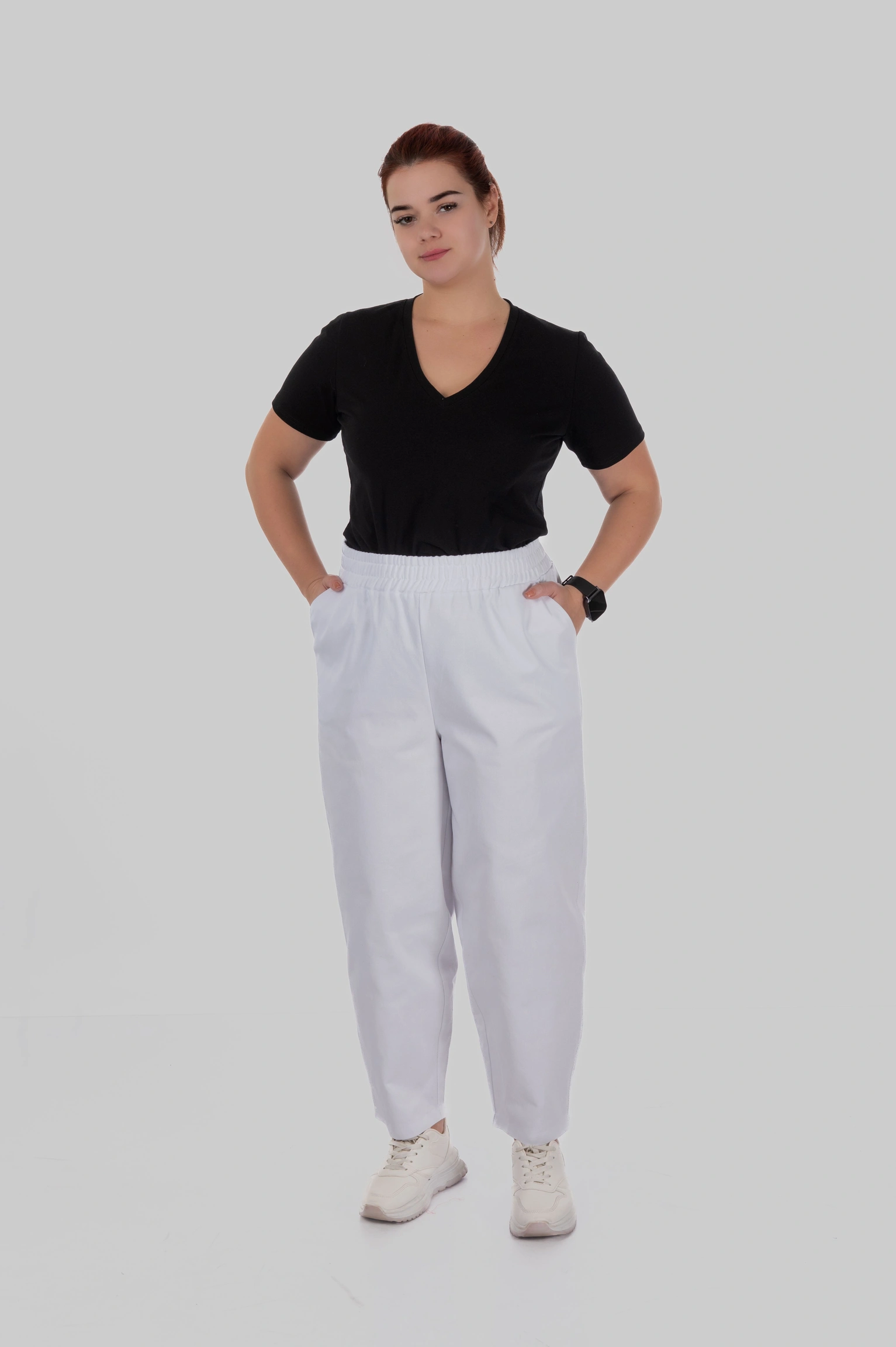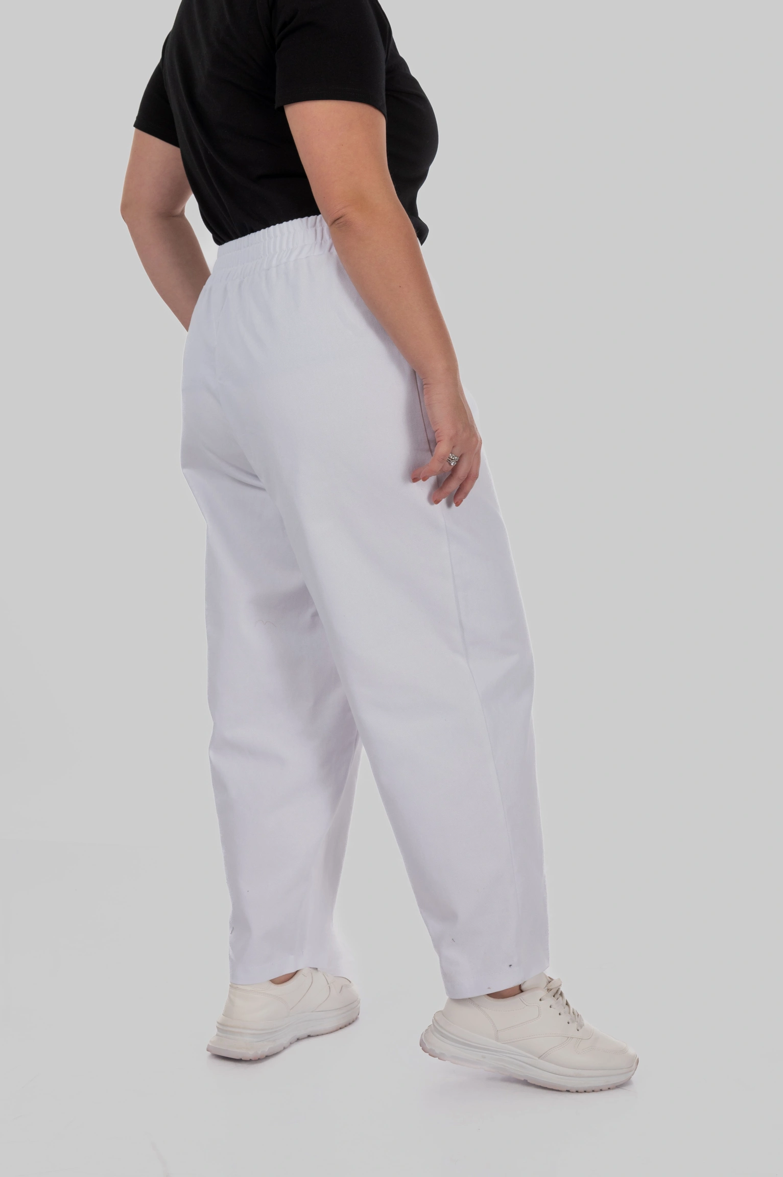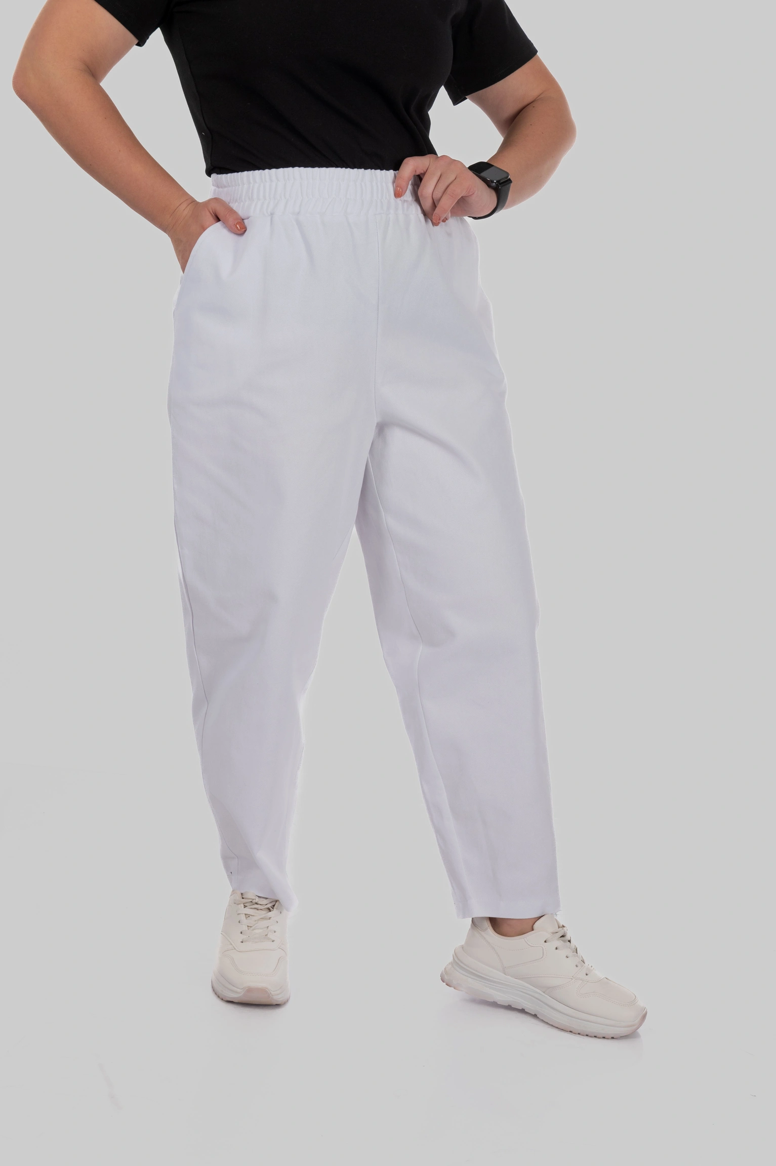Штани мають комфортну посадку і пояс на м’якій еластичній резинці, завдяки чому модель добре адаптується до різних пропорцій фігури. Силует м’яко лягає по стегнах і злегка звужується донизу, формуючи сучасний баланс між комфортом і акуратною формою.