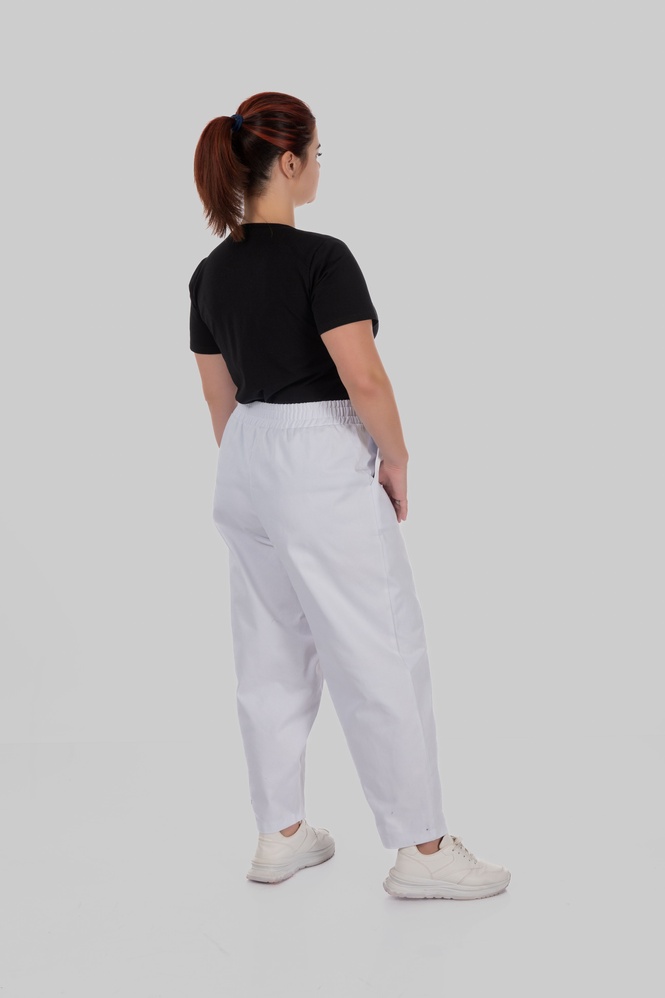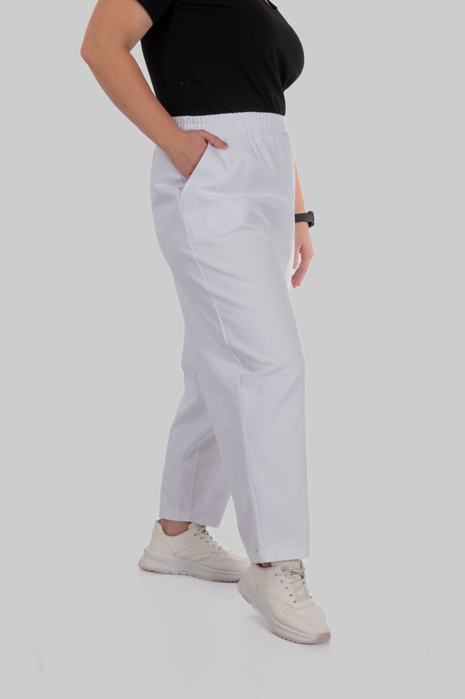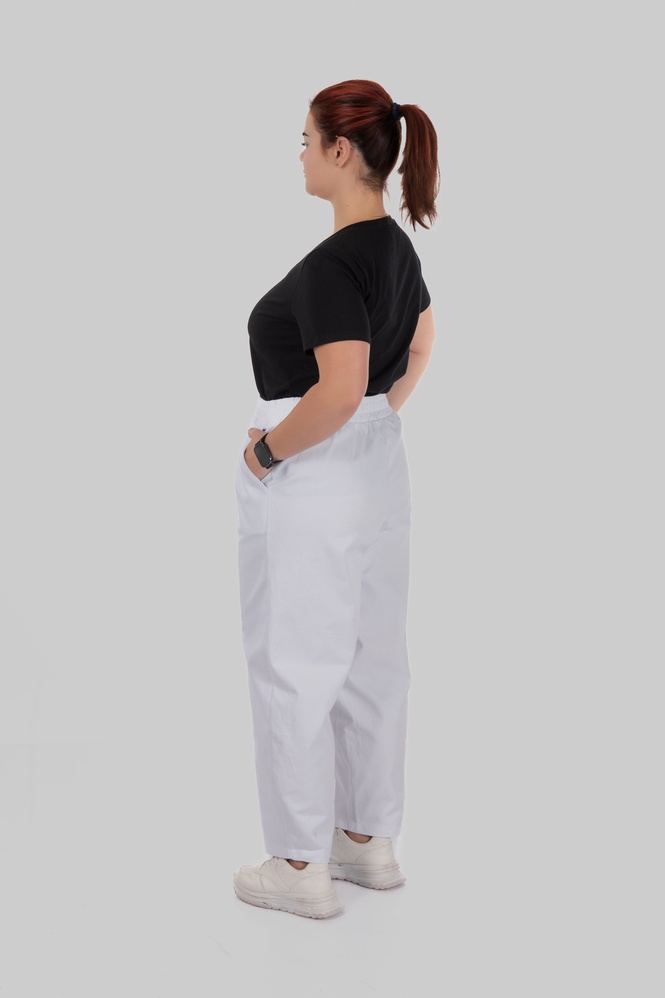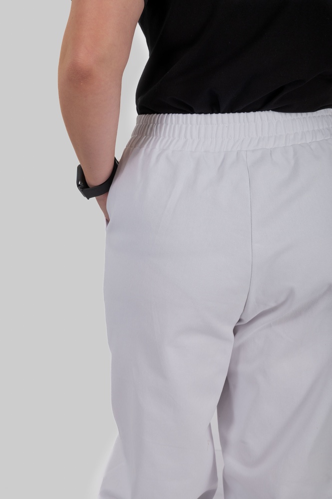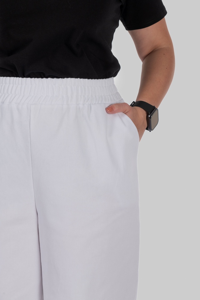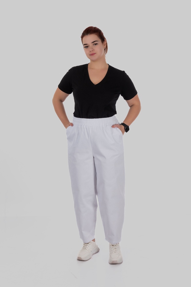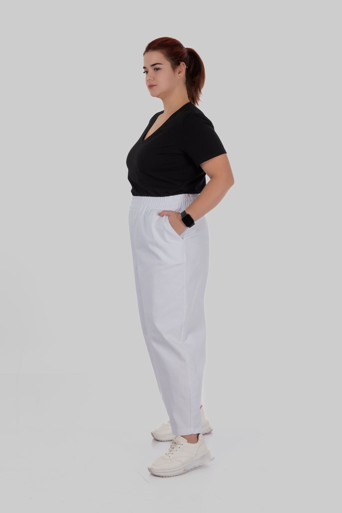 Пояс на еластичній резинці забезпечує комфортну посадку без тиску. Завдяки цьому штани легко адаптуються до різних пропорцій фігури і залишаються зручними протягом усього дня.