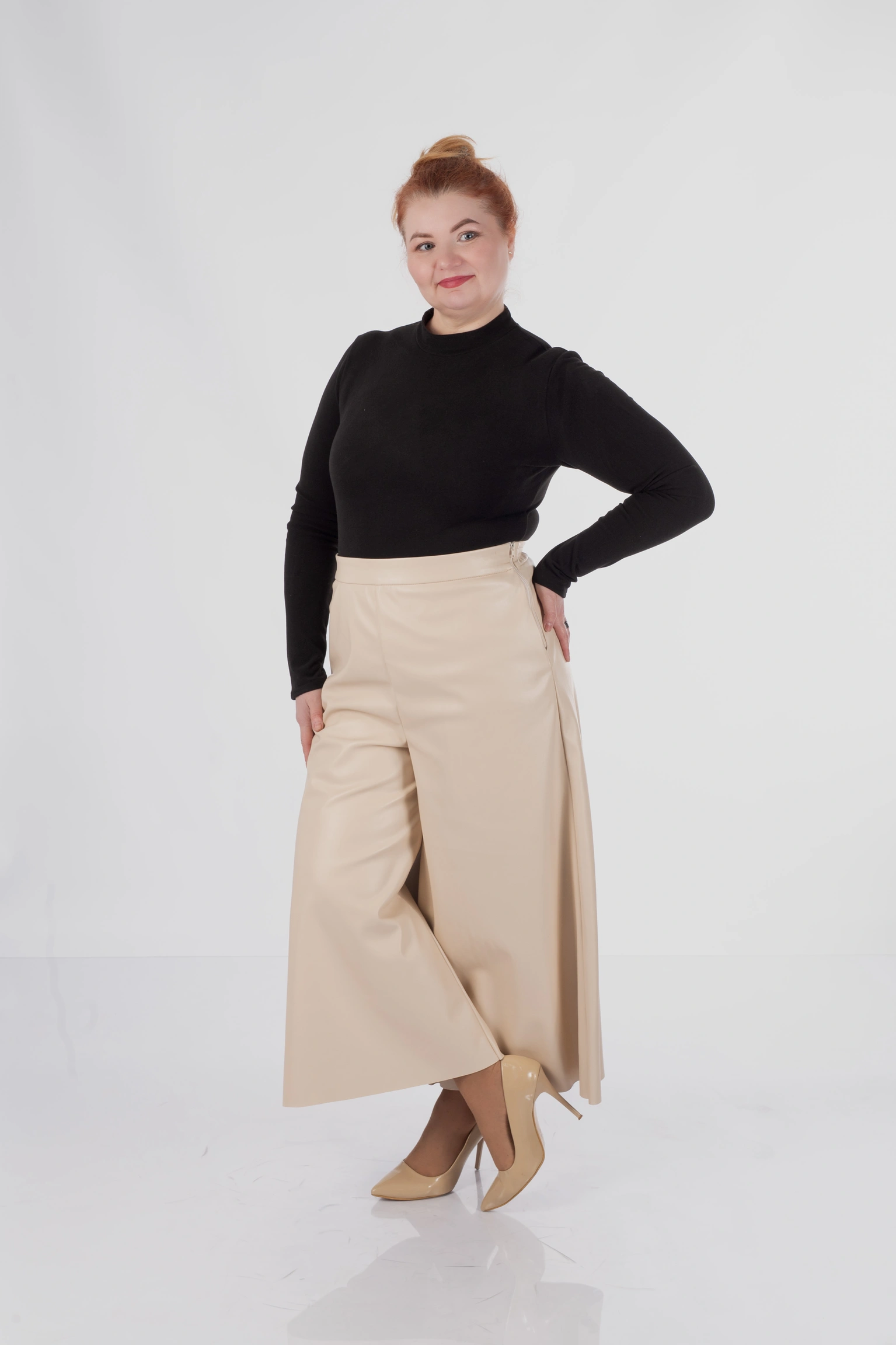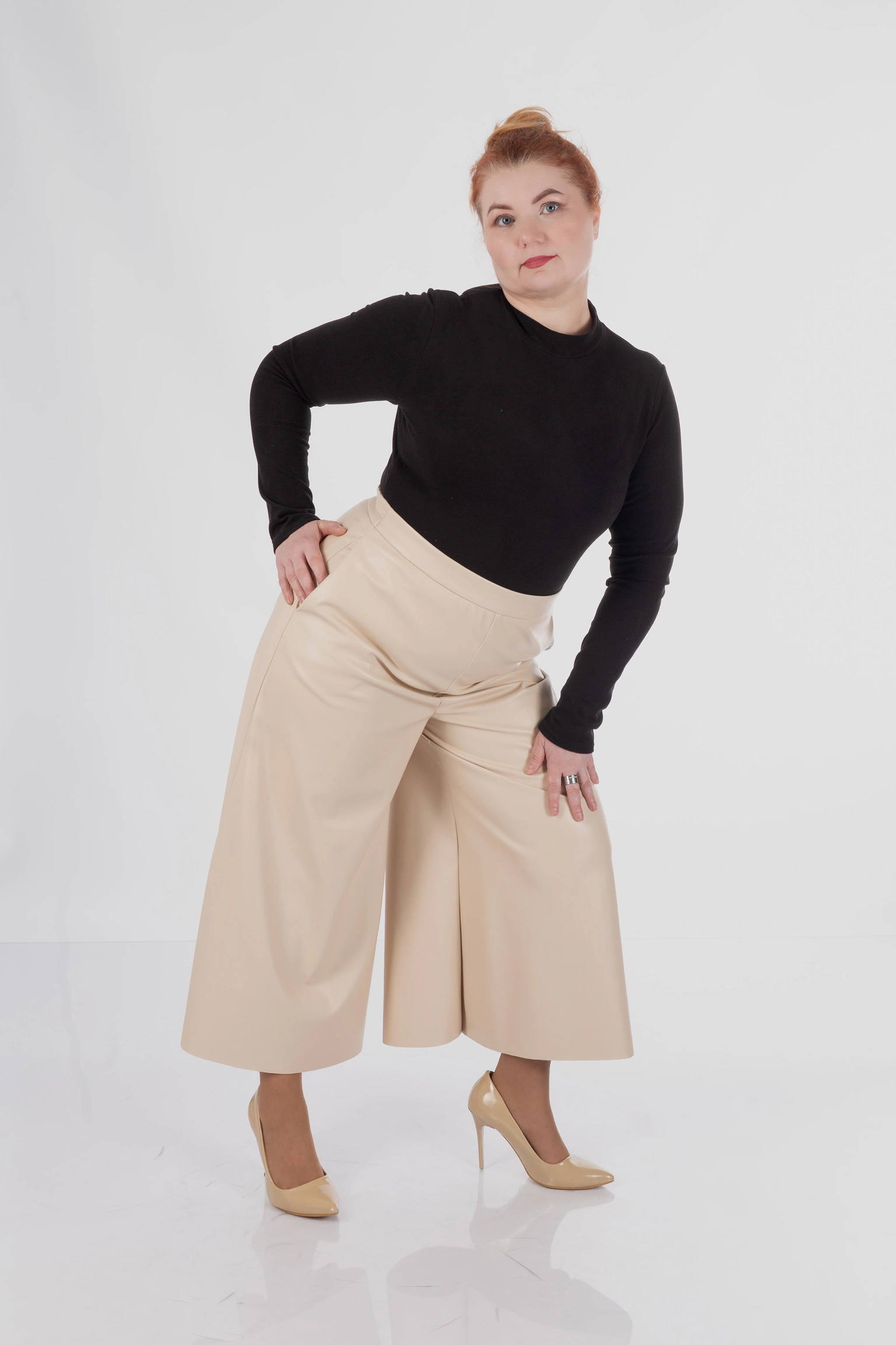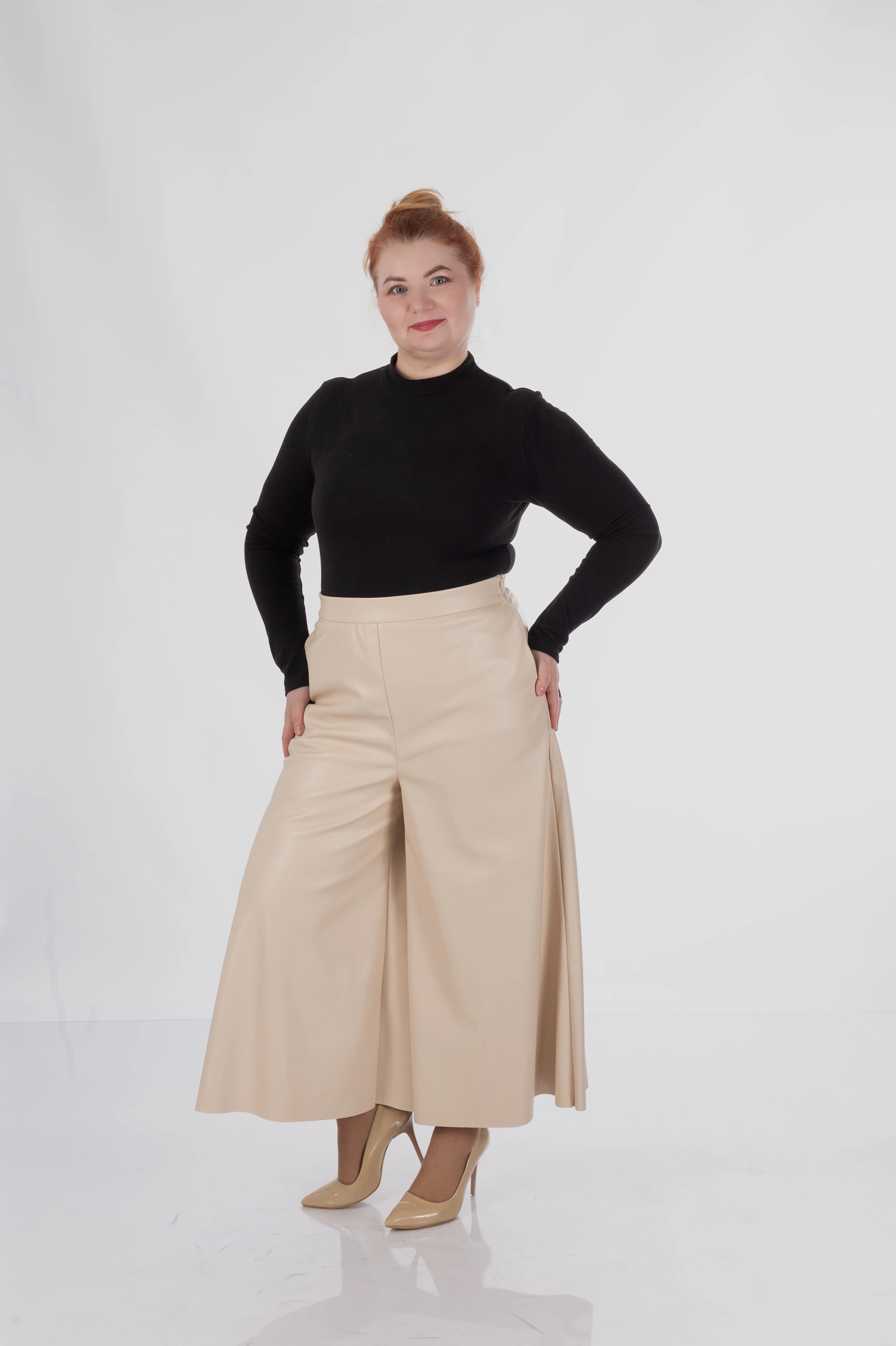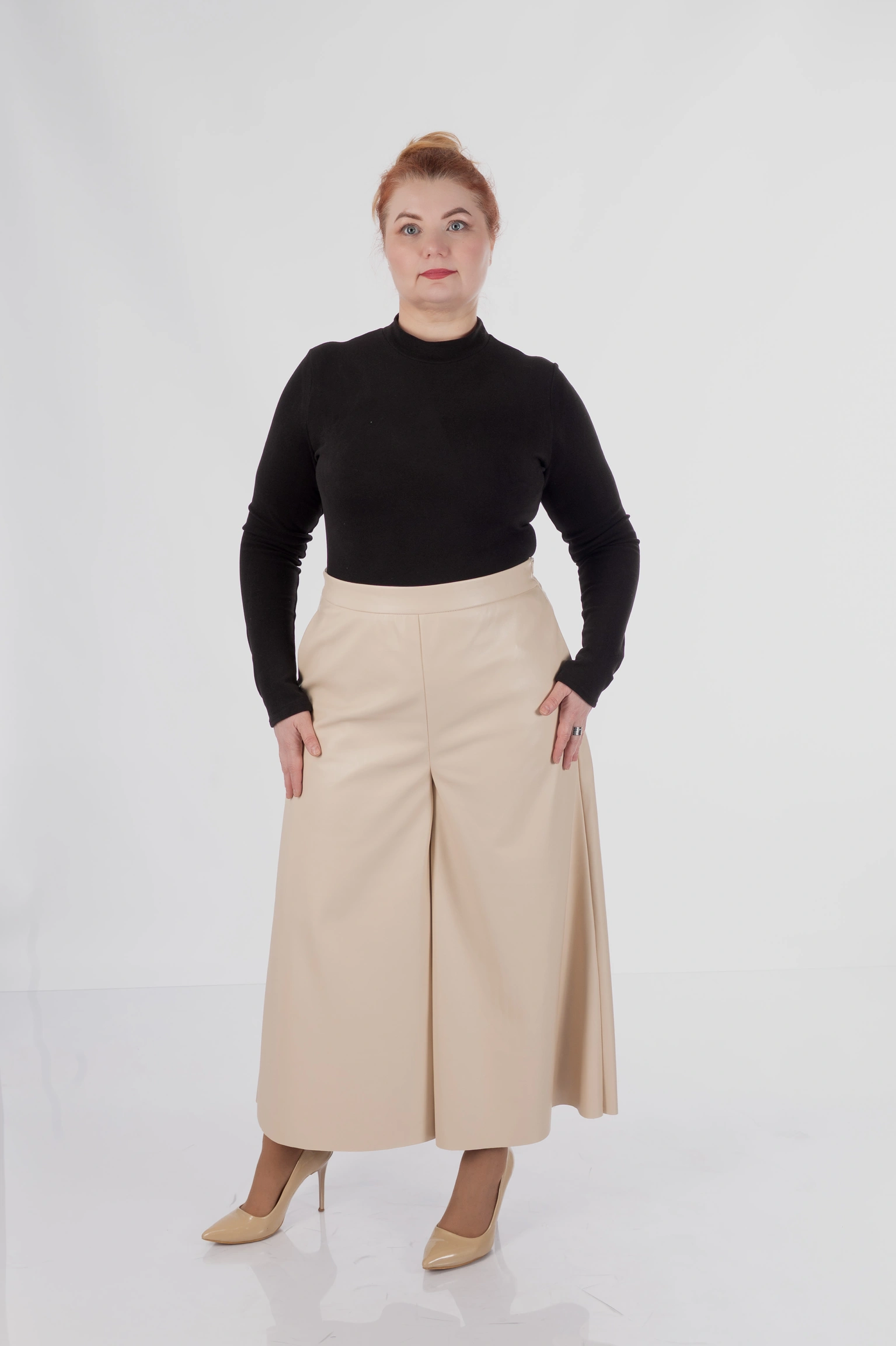 Для plus size у цій моделі особливо важлива конструкція верхньої частини: кюлоти не створюють зайвого натягу в зоні живота, не перетискають талію і дають комфортну посадку в стегнах. Саме це дозволяє силуету залишатися акуратним і зібраним, а не важким.