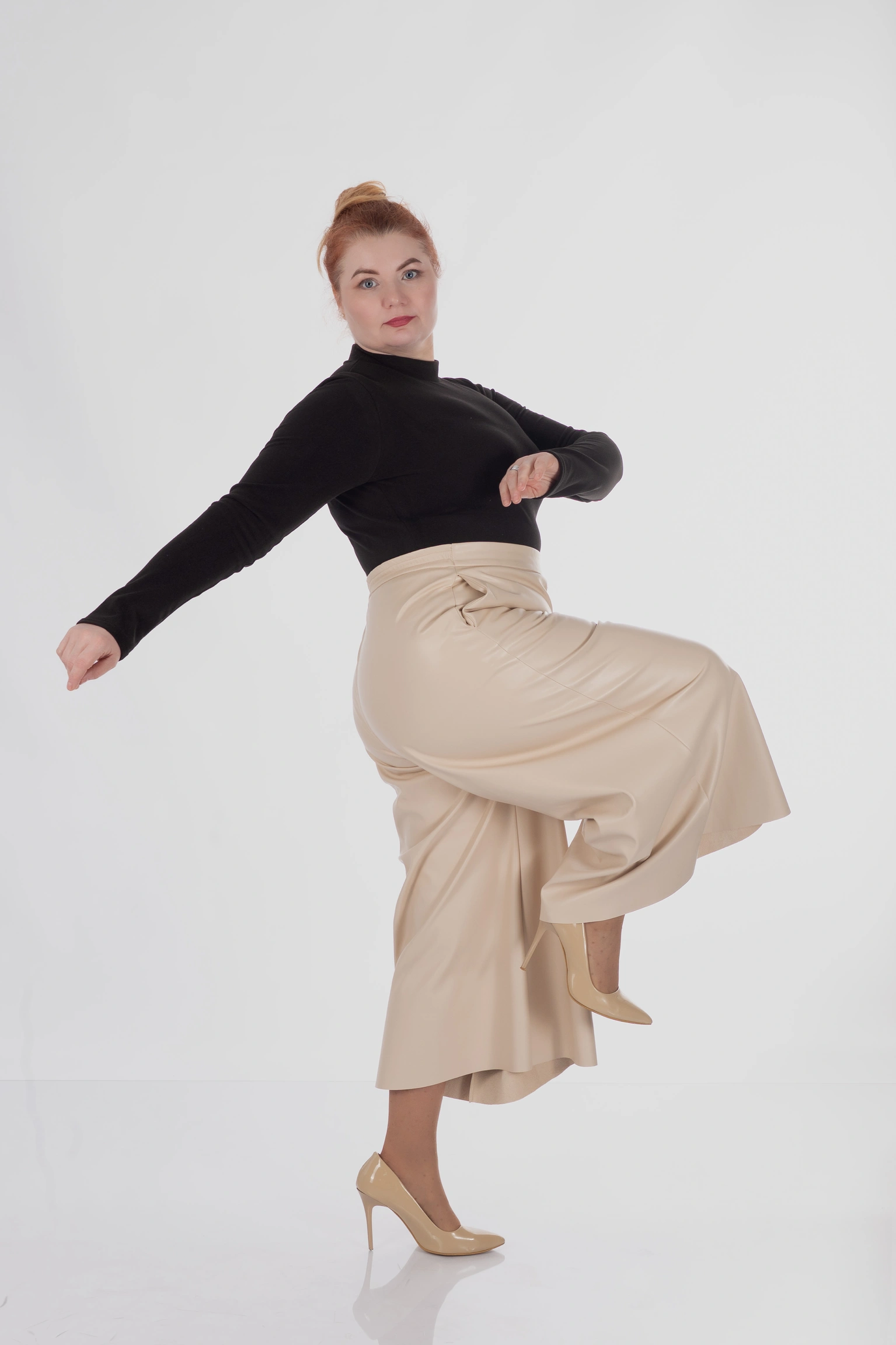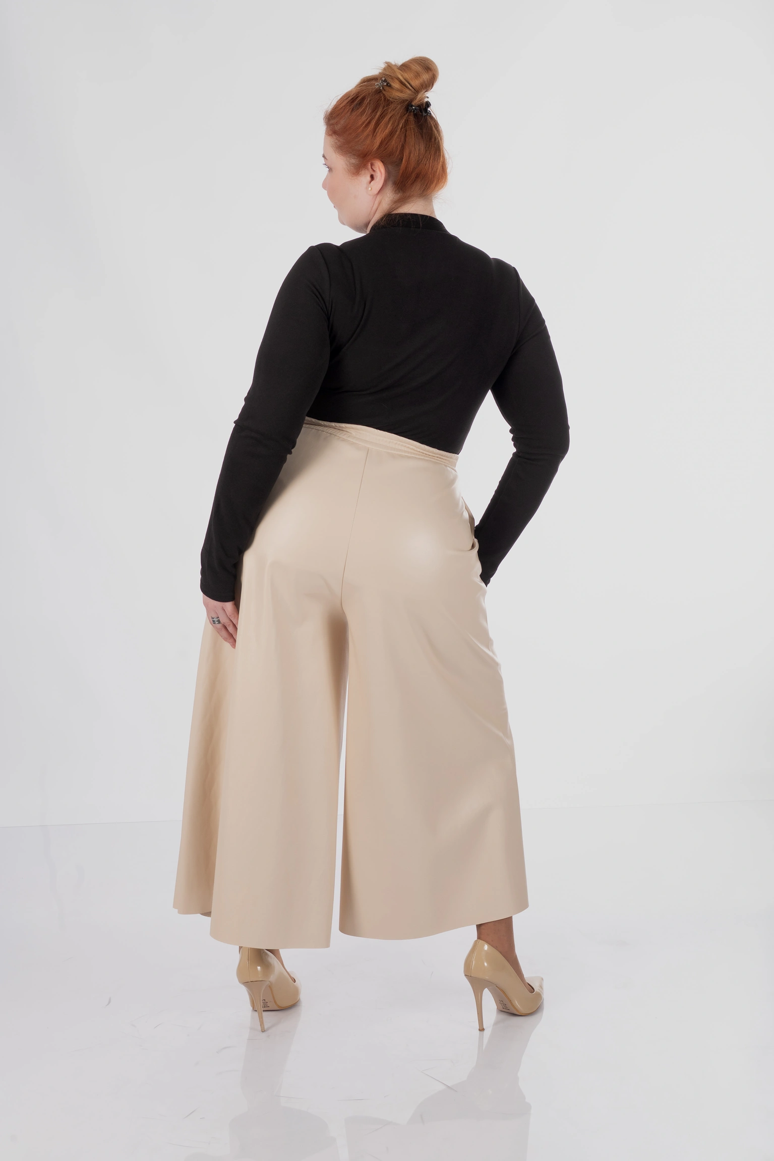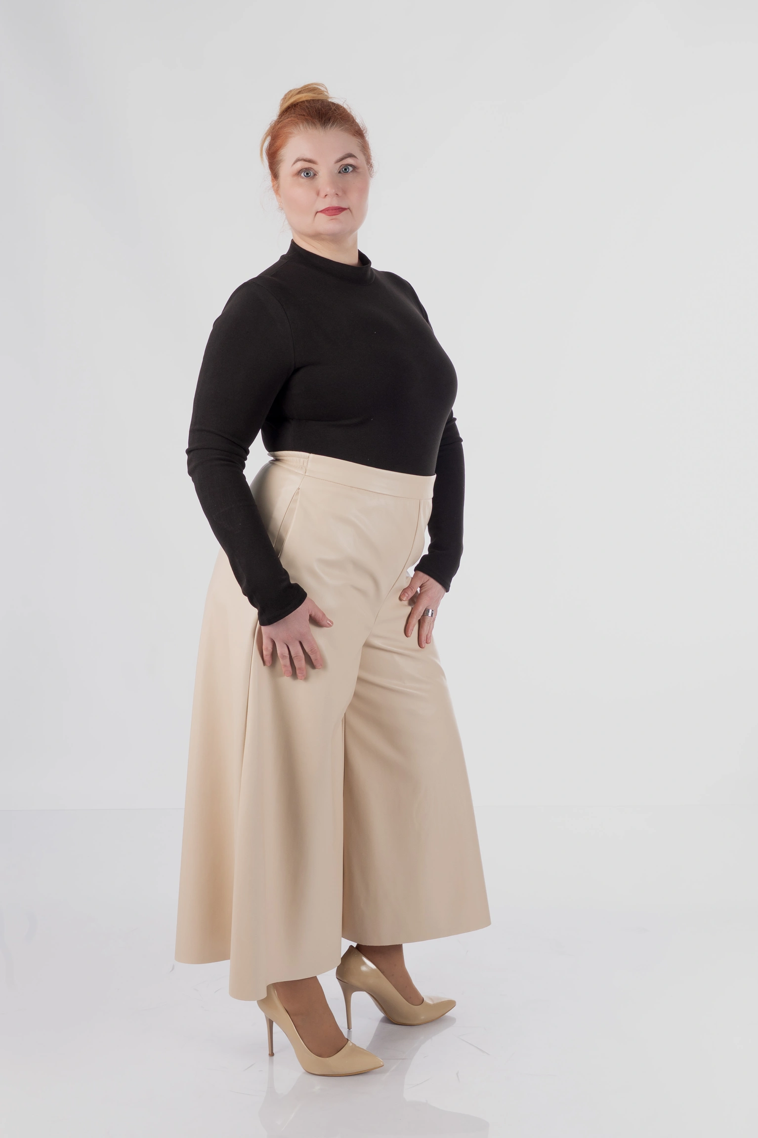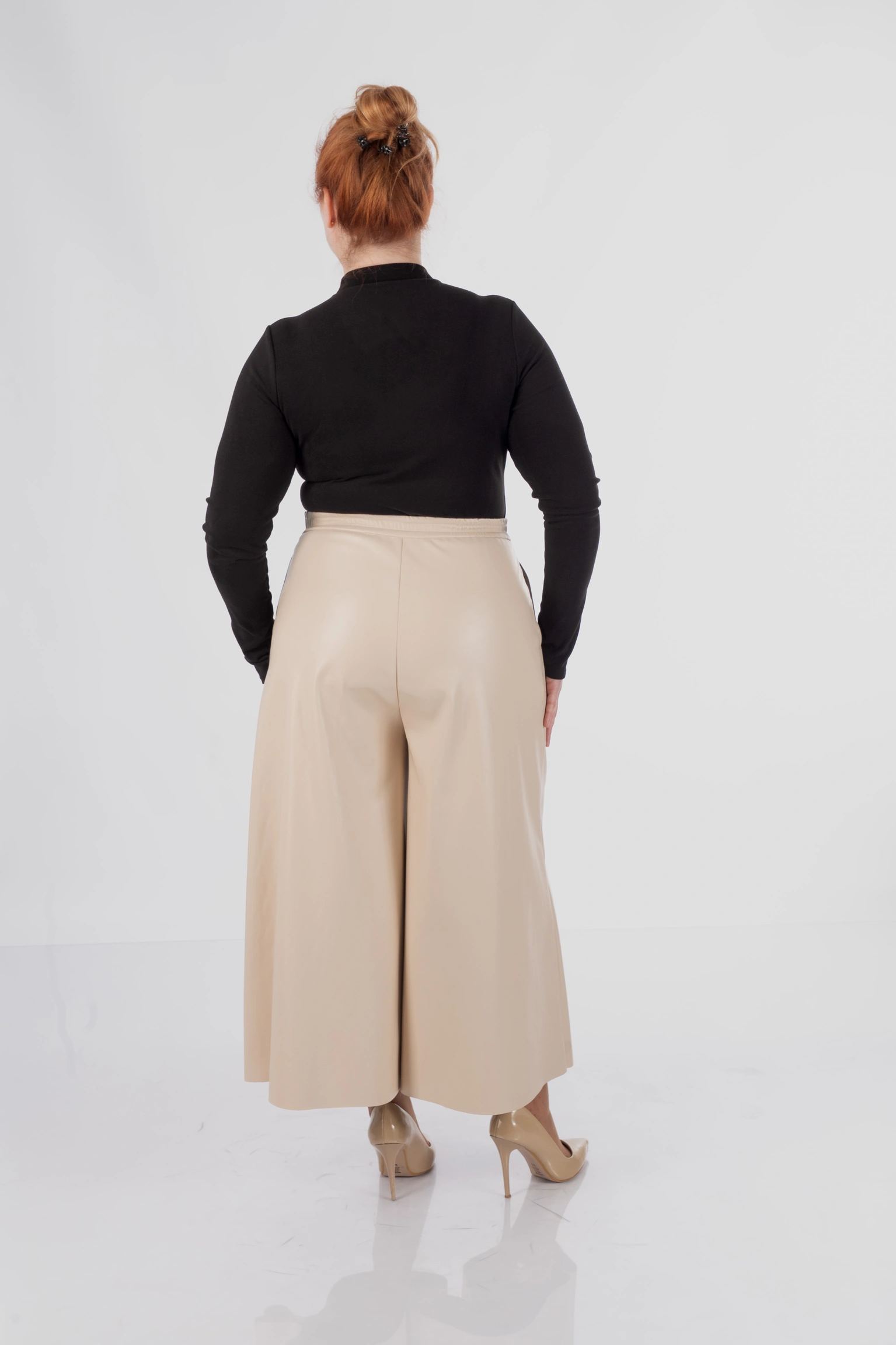 Для plus size у цій моделі особливо важлива конструкція верхньої частини: кюлоти не створюють зайвого натягу в зоні живота, не перетискають талію і дають комфортну посадку в стегнах. Саме це дозволяє силуету залишатися акуратним і зібраним, а не важким.