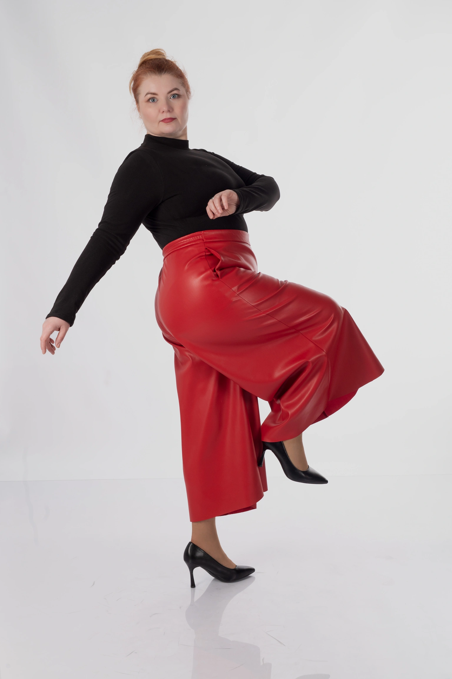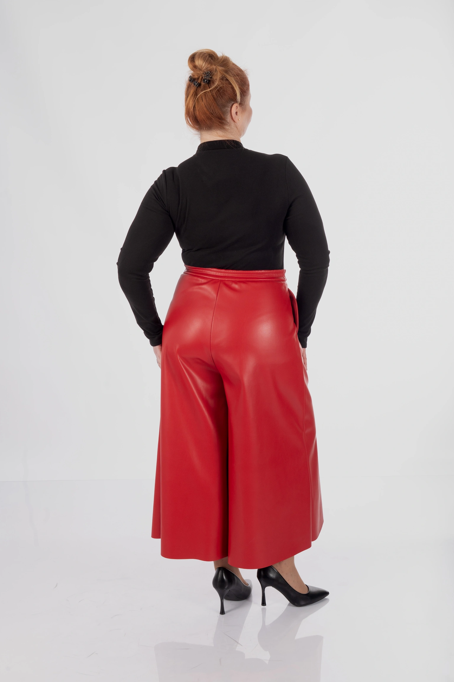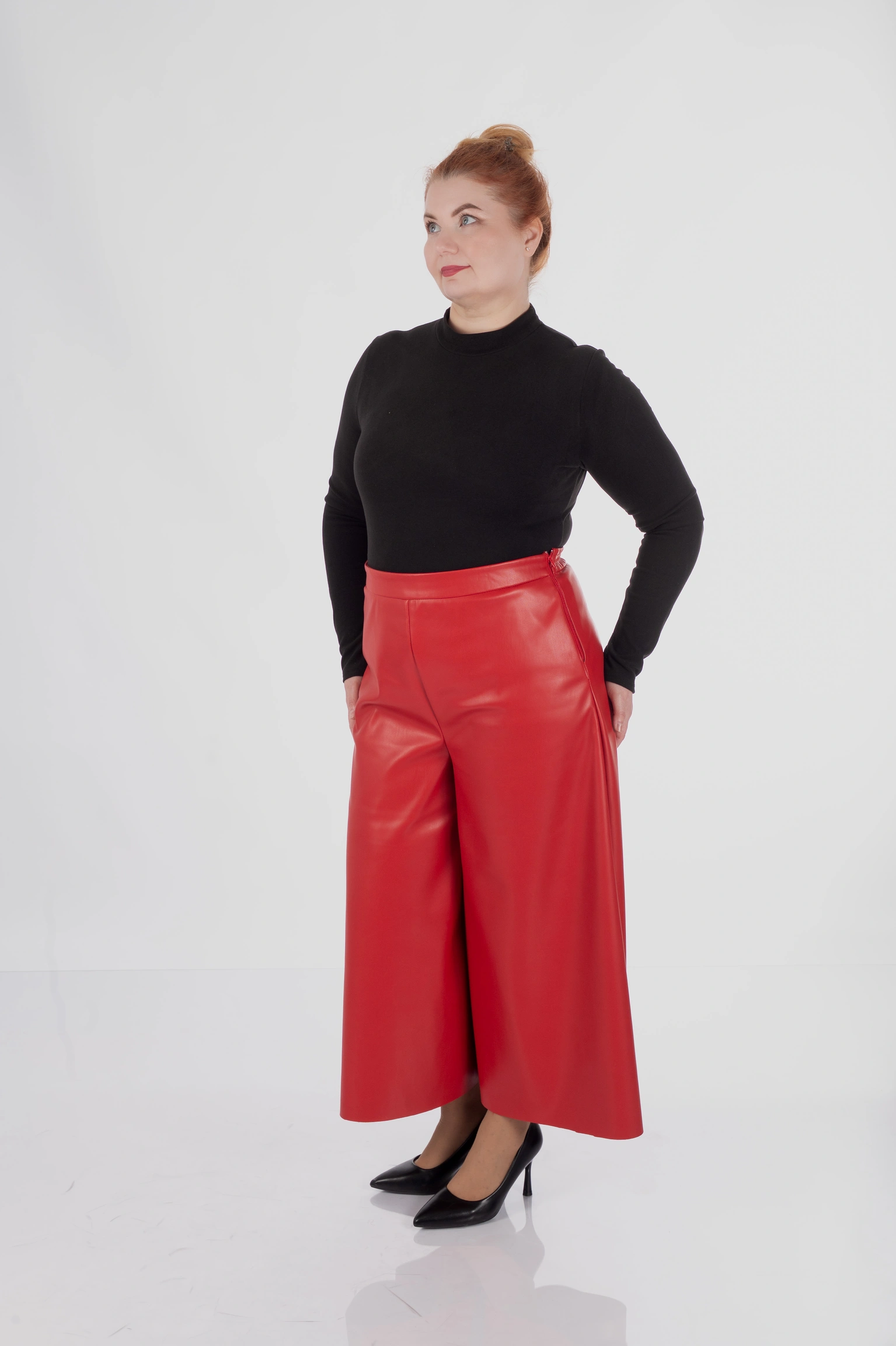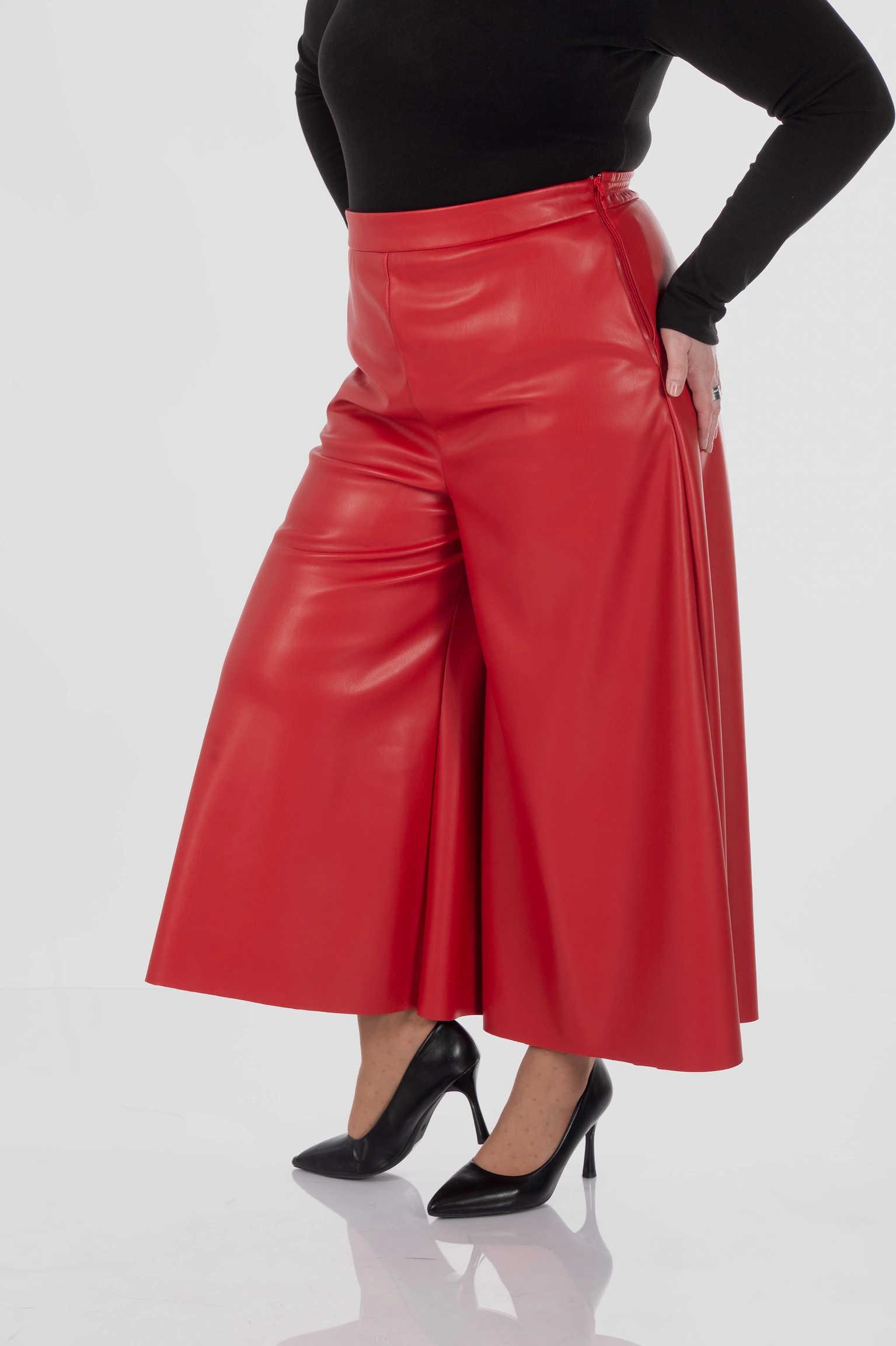 Для plus size у цій моделі особливо важлива конструкція верхньої частини: кюлоти не створюють зайвого натягу в зоні живота, не перетискають талію і дають комфортну посадку в стегнах. Саме це дозволяє силуету залишатися акуратним і зібраним, а не важким.