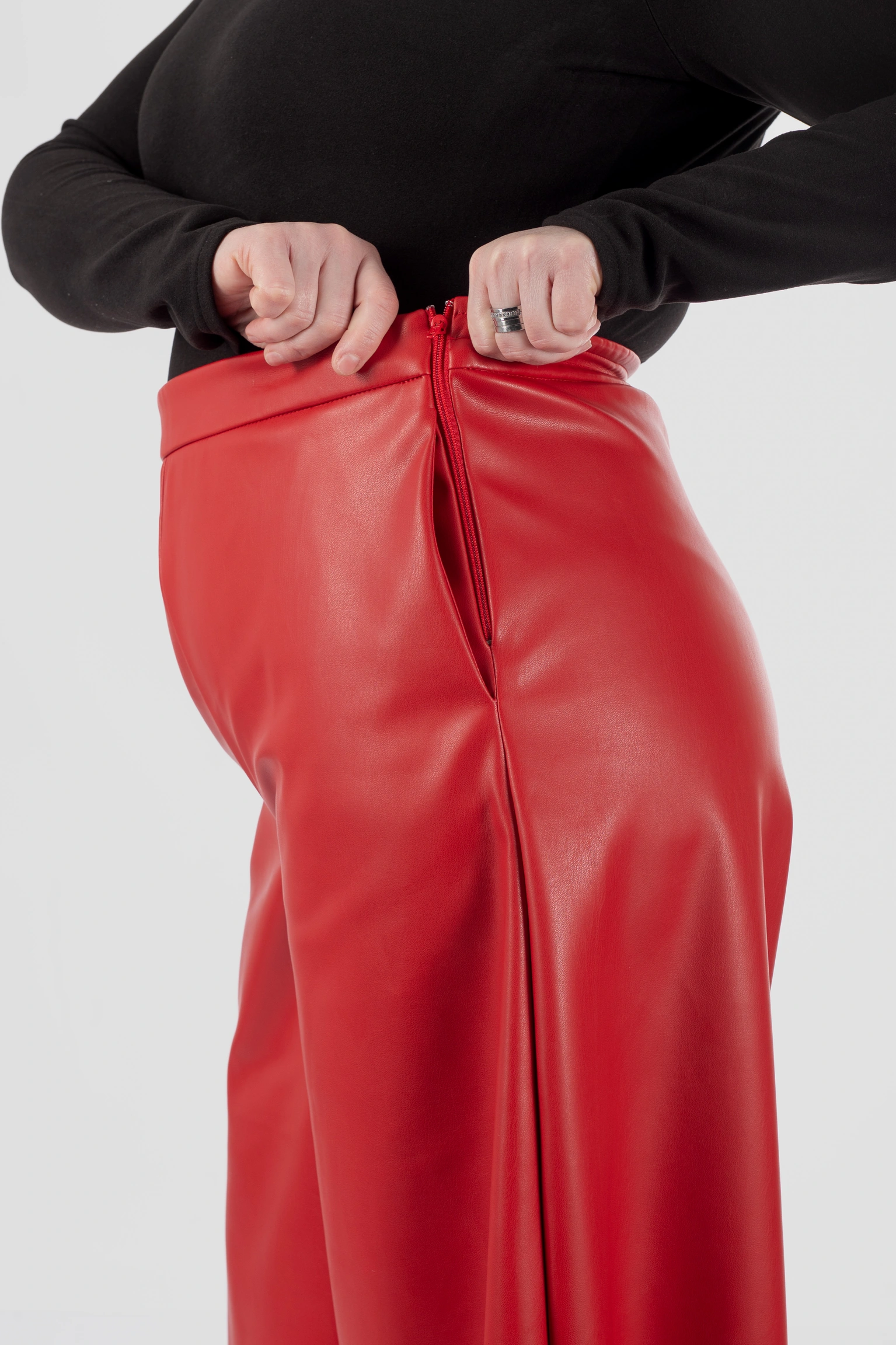 Кюлоти Annie з еко-шкіри на замшевій основі — це модель із чіткою архітектурою силуету, продуманою посадкою і матеріалом, який виглядає виразно та дорого. Вони створені для тих, кому важливо, щоб річ не просто привертала увагу, а й добре працювала на фігурі з формами.