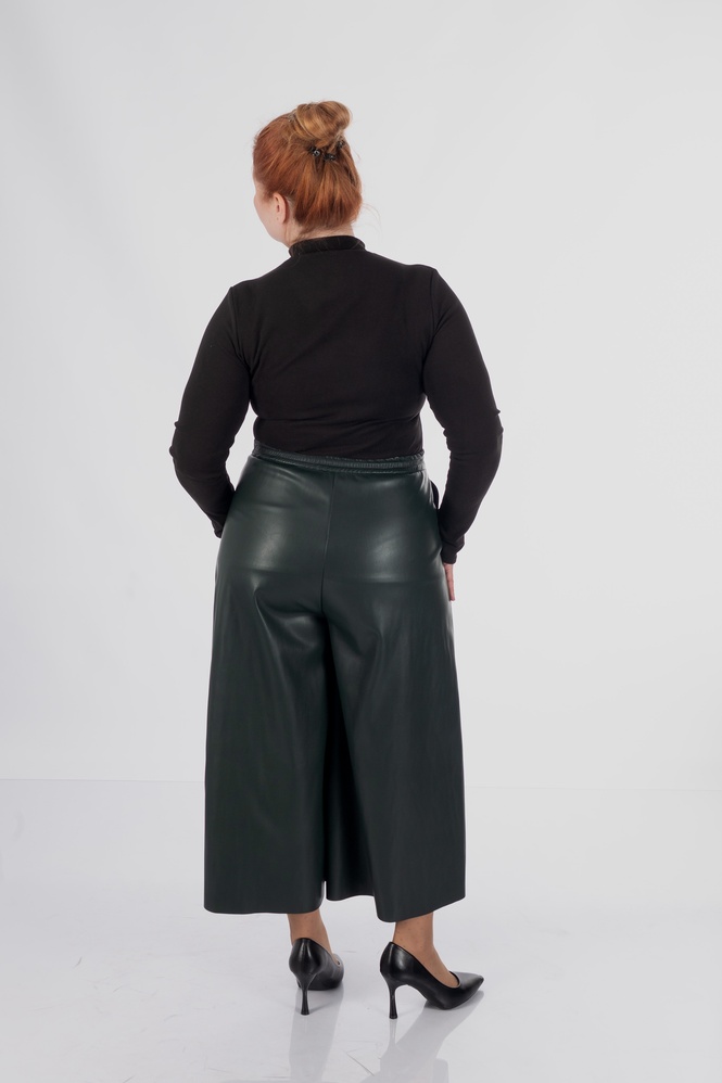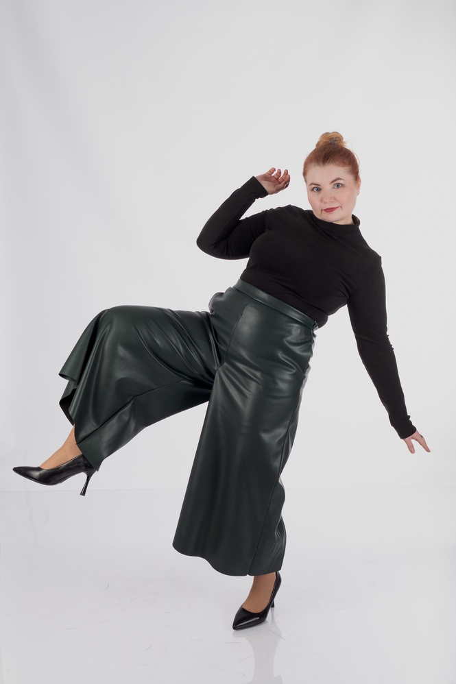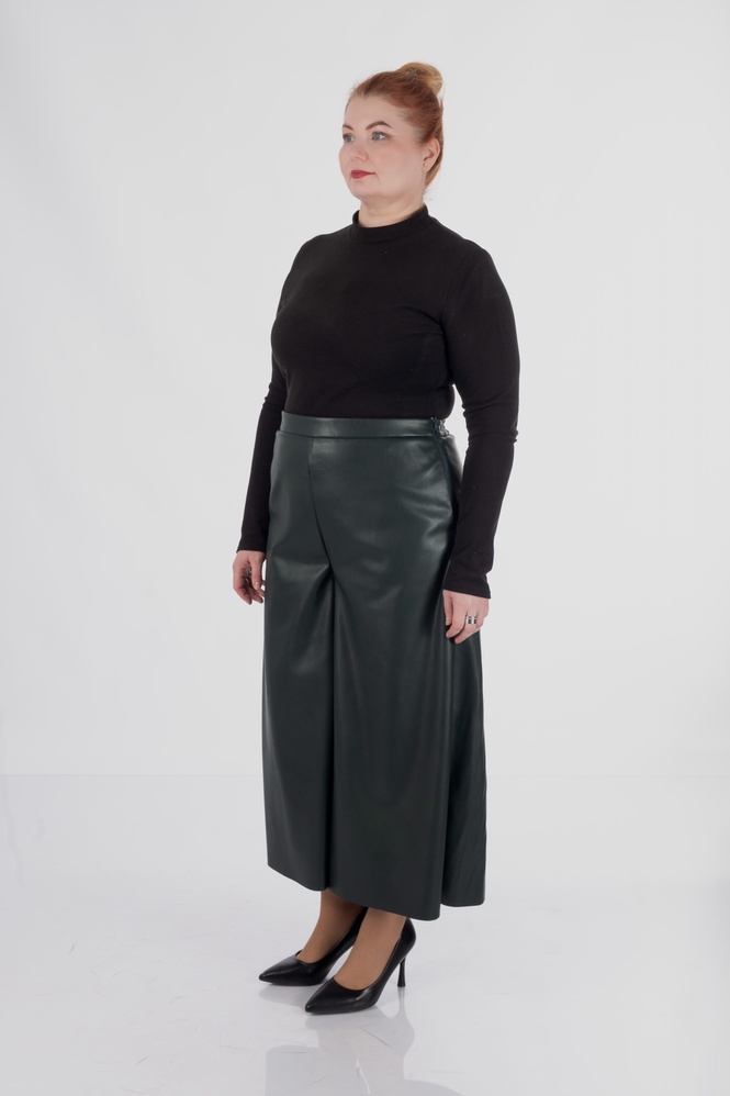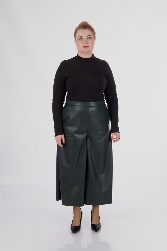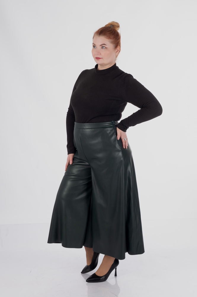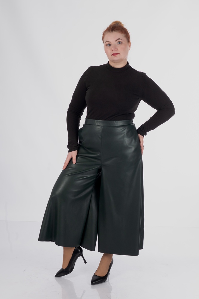 Для plus size у цій моделі особливо важлива конструкція верхньої частини: кюлоти не створюють зайвого натягу в зоні живота, не перетискають талію і дають комфортну посадку в стегнах. Саме це дозволяє силуету залишатися акуратним і зібраним, а не важким.