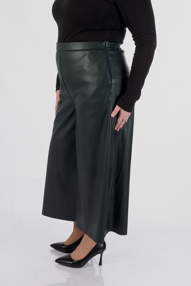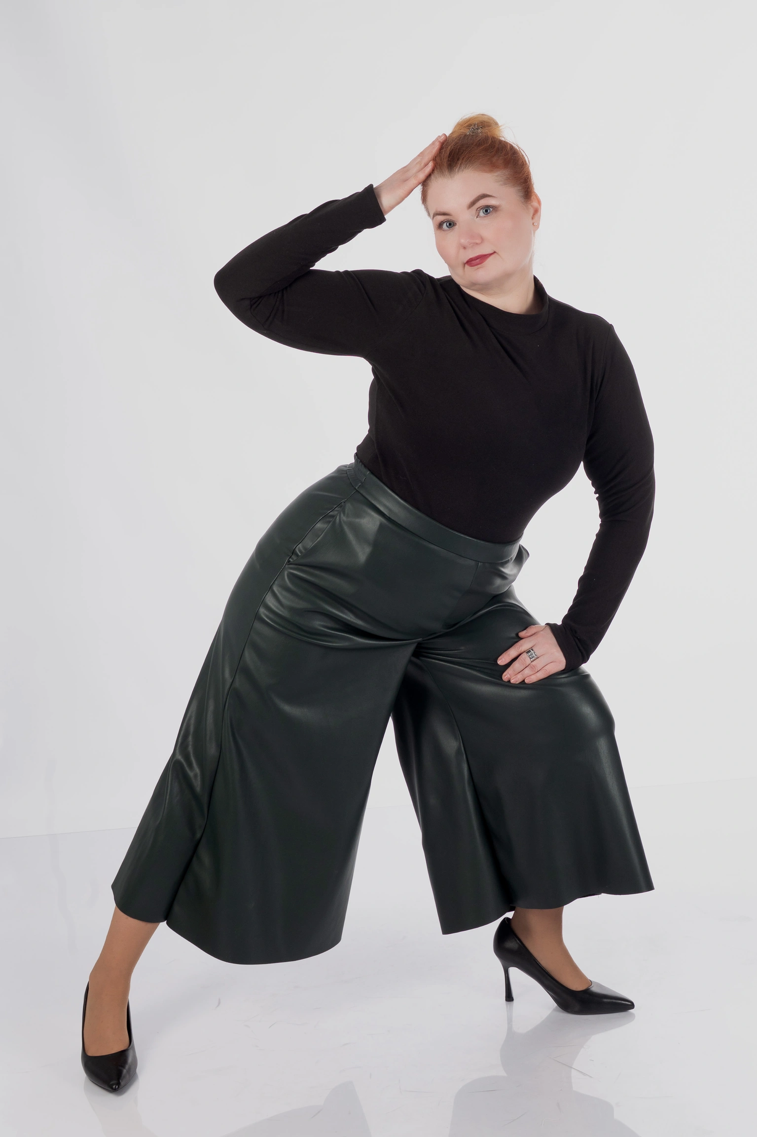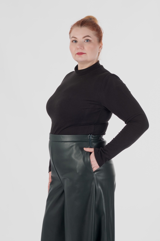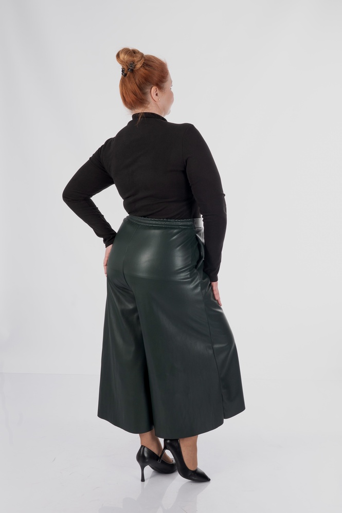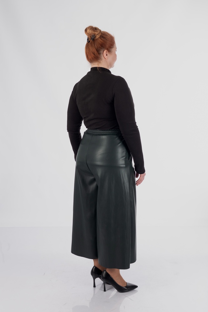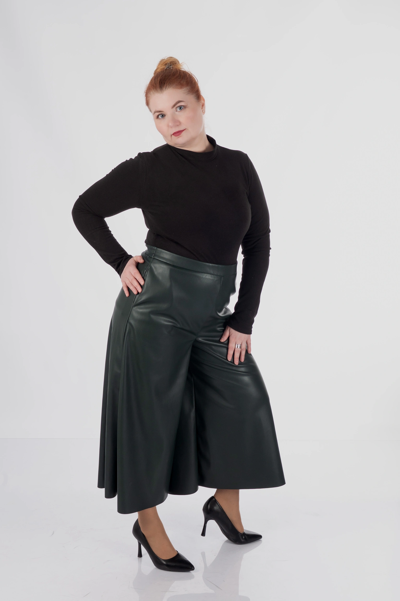 Для plus size у цій моделі особливо важлива конструкція верхньої частини: кюлоти не створюють зайвого натягу в зоні живота, не перетискають талію і дають комфортну посадку в стегнах. Саме це дозволяє силуету залишатися акуратним і зібраним, а не важким.