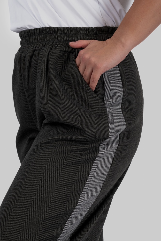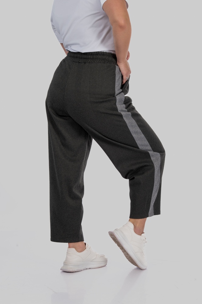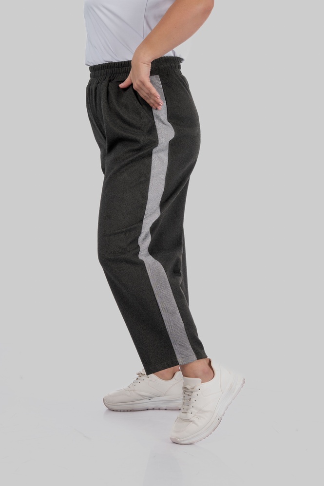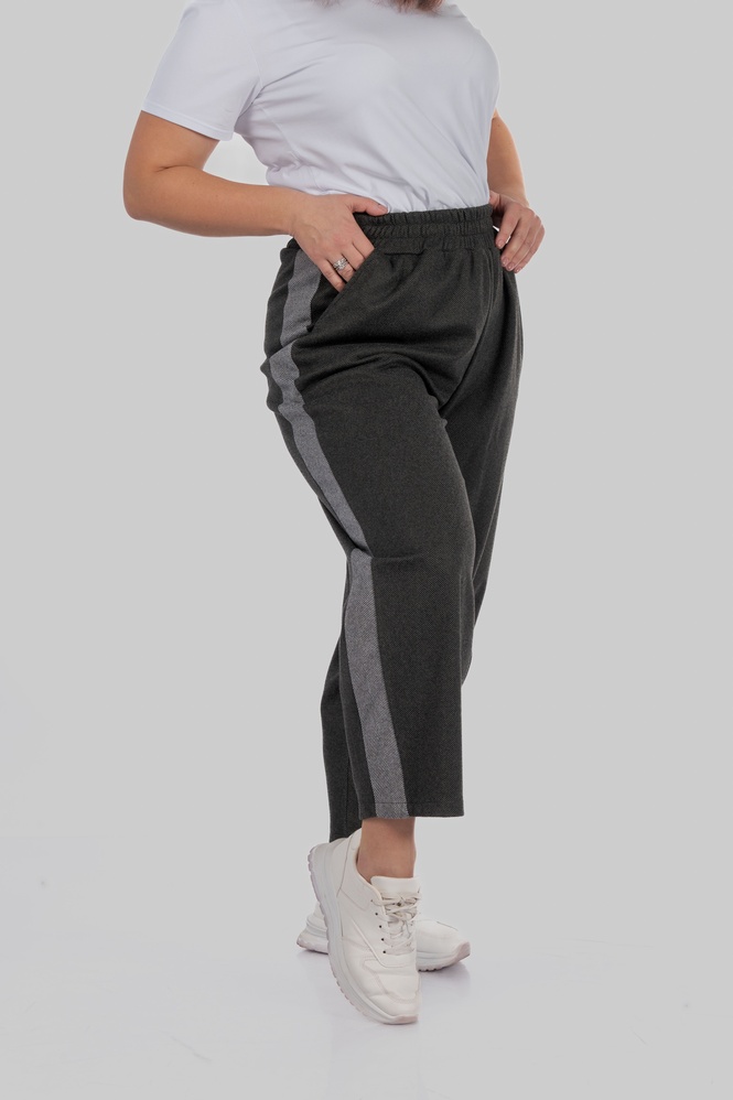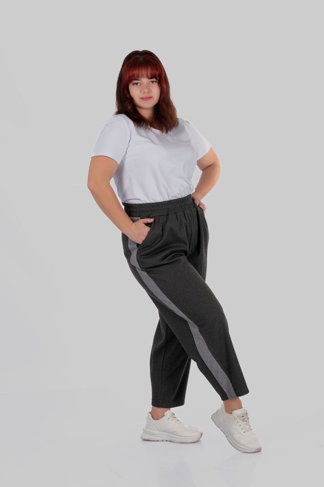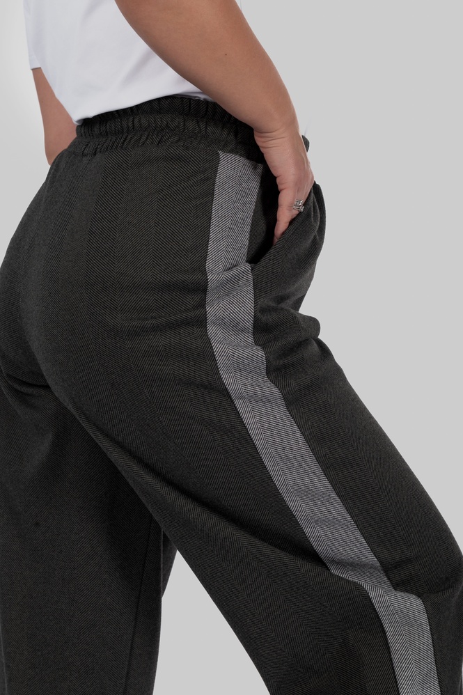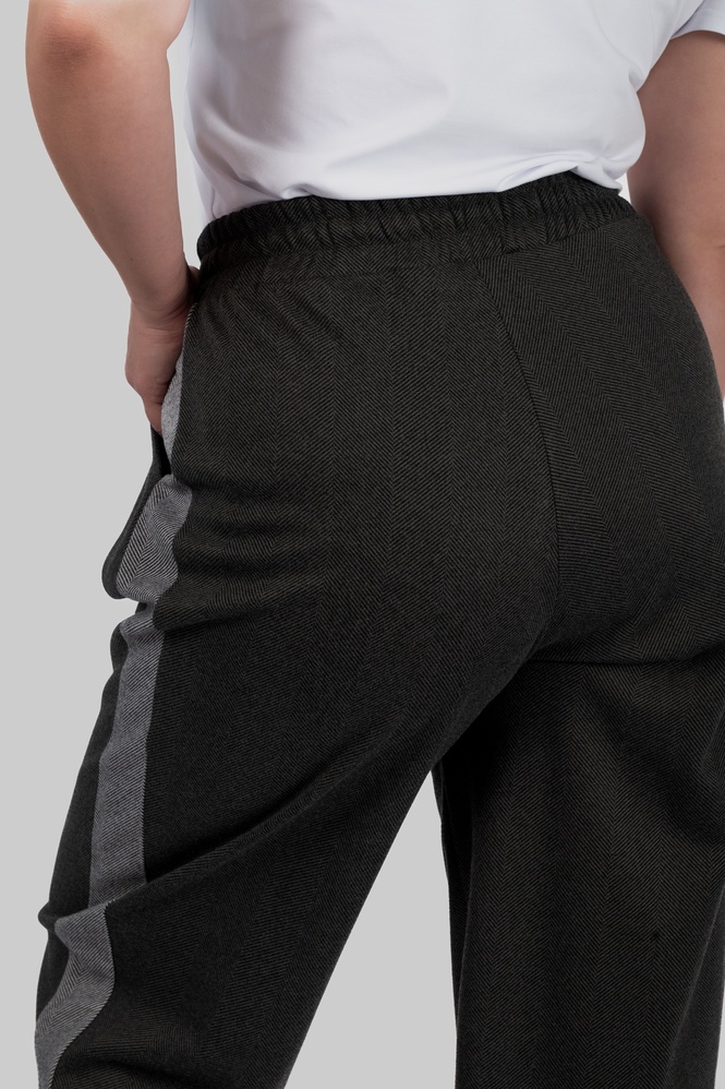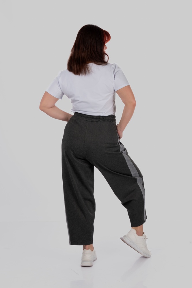 Окремий акцент моделі — контрастні лампаси шириною 4 см, вшиті в шов по всій довжині штанини. Вони працюють не як випадковий декор, а як частина конструкції: формують чітку вертикаль, візуально витягують силует і роблять образ більш структурованим. На світло-сірому кольорі лампаси темно-сірі, тому модель виглядає виразно, але стримано.