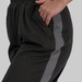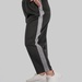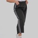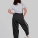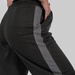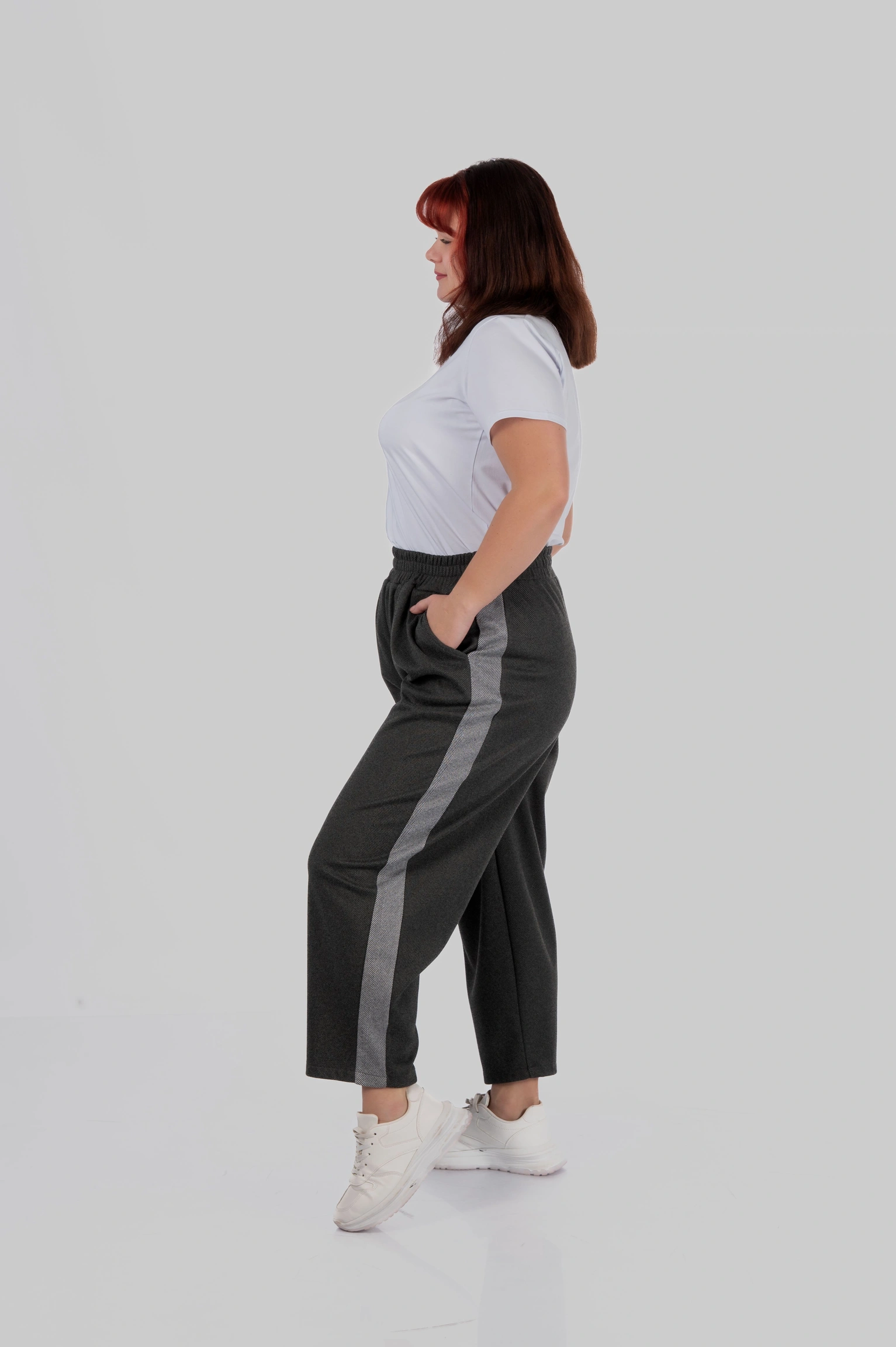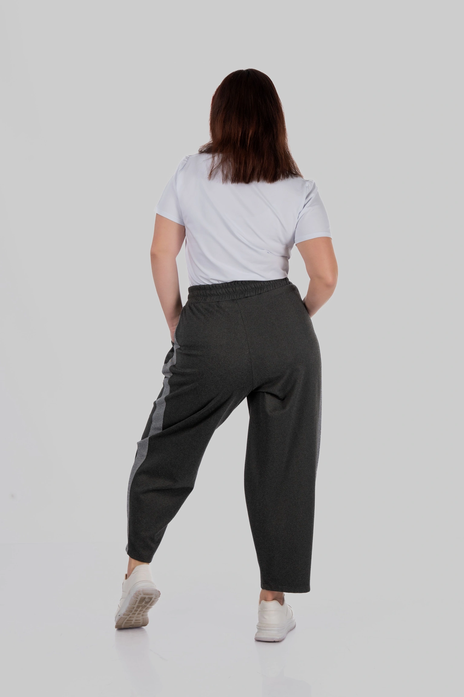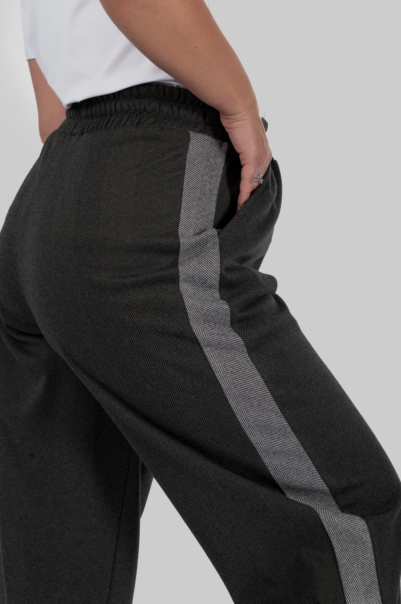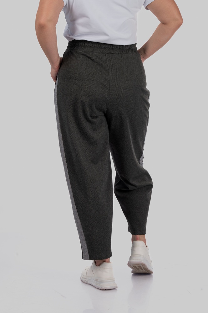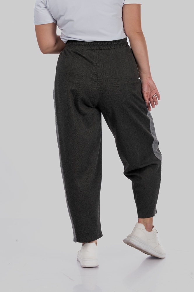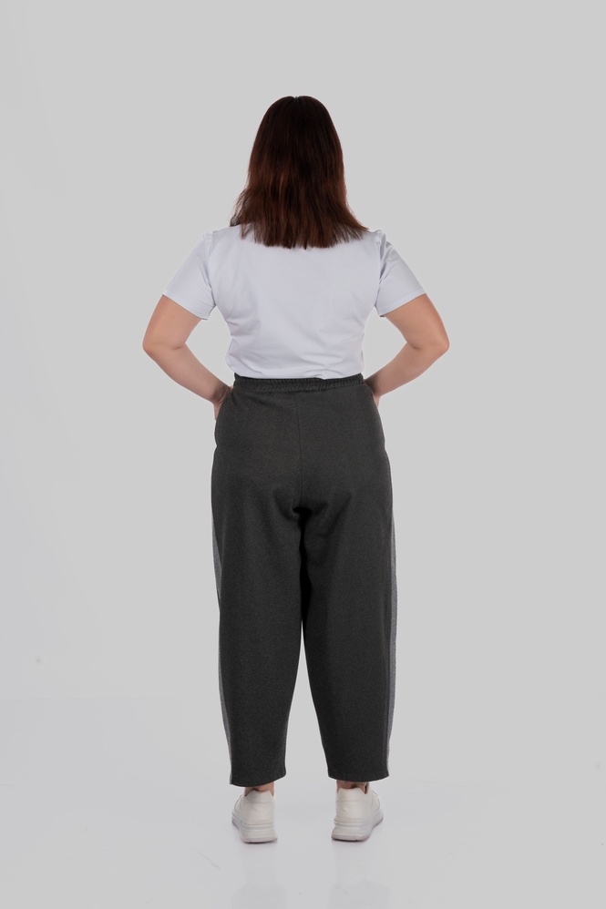 Окремий акцент моделі — контрастні лампаси шириною 4 см, вшиті в шов по всій довжині штанини. Вони працюють не як випадковий декор, а як частина конструкції: формують чітку вертикаль, візуально витягують силует і роблять образ більш структурованим. На світло-сірому кольорі лампаси темно-сірі, тому модель виглядає виразно, але стримано.