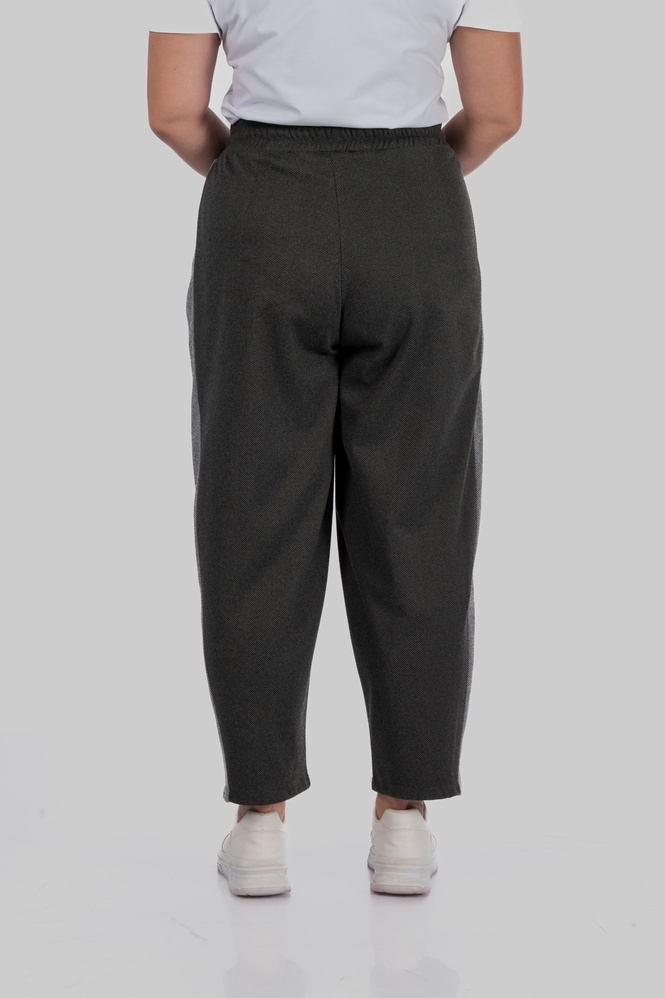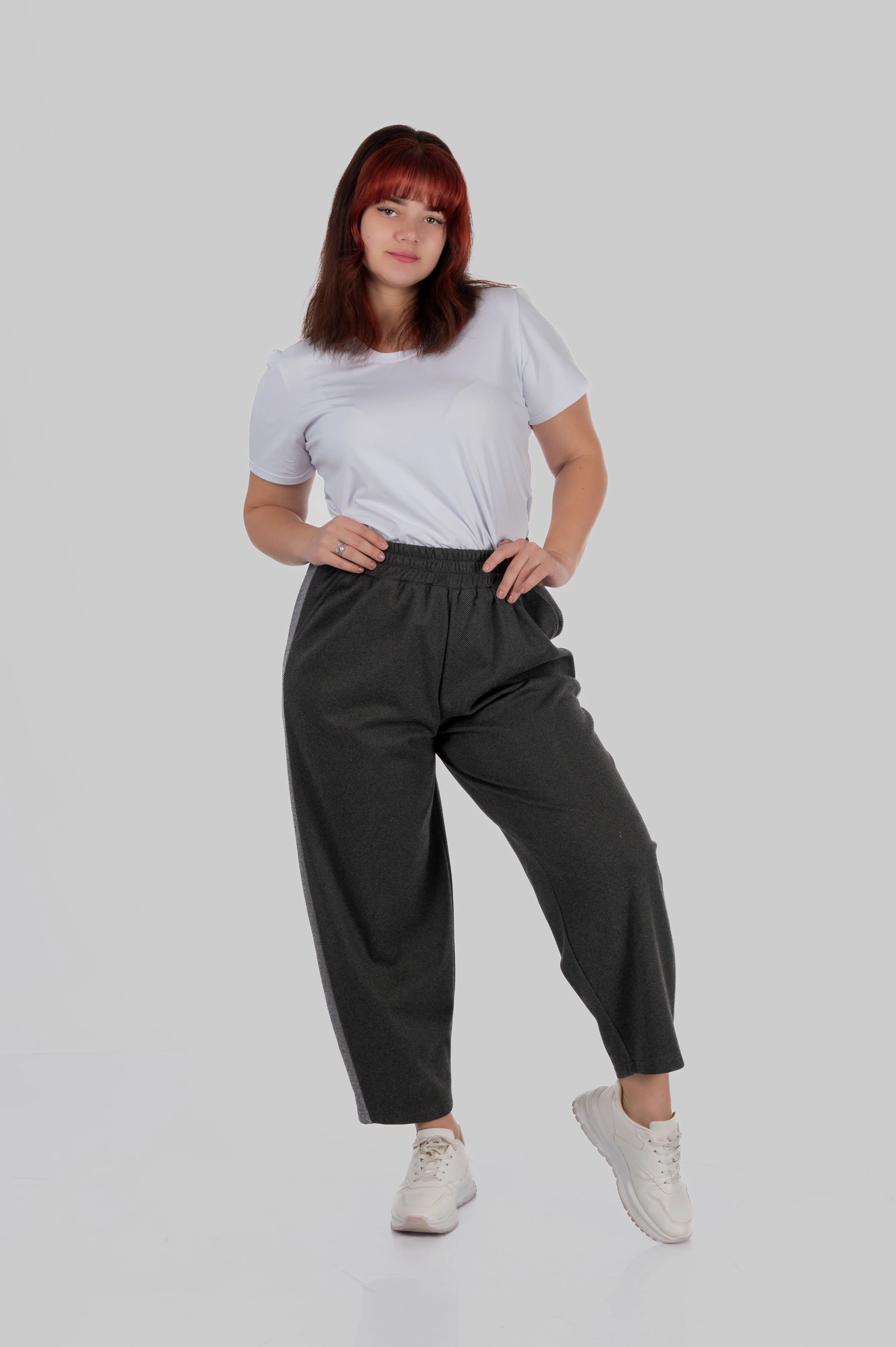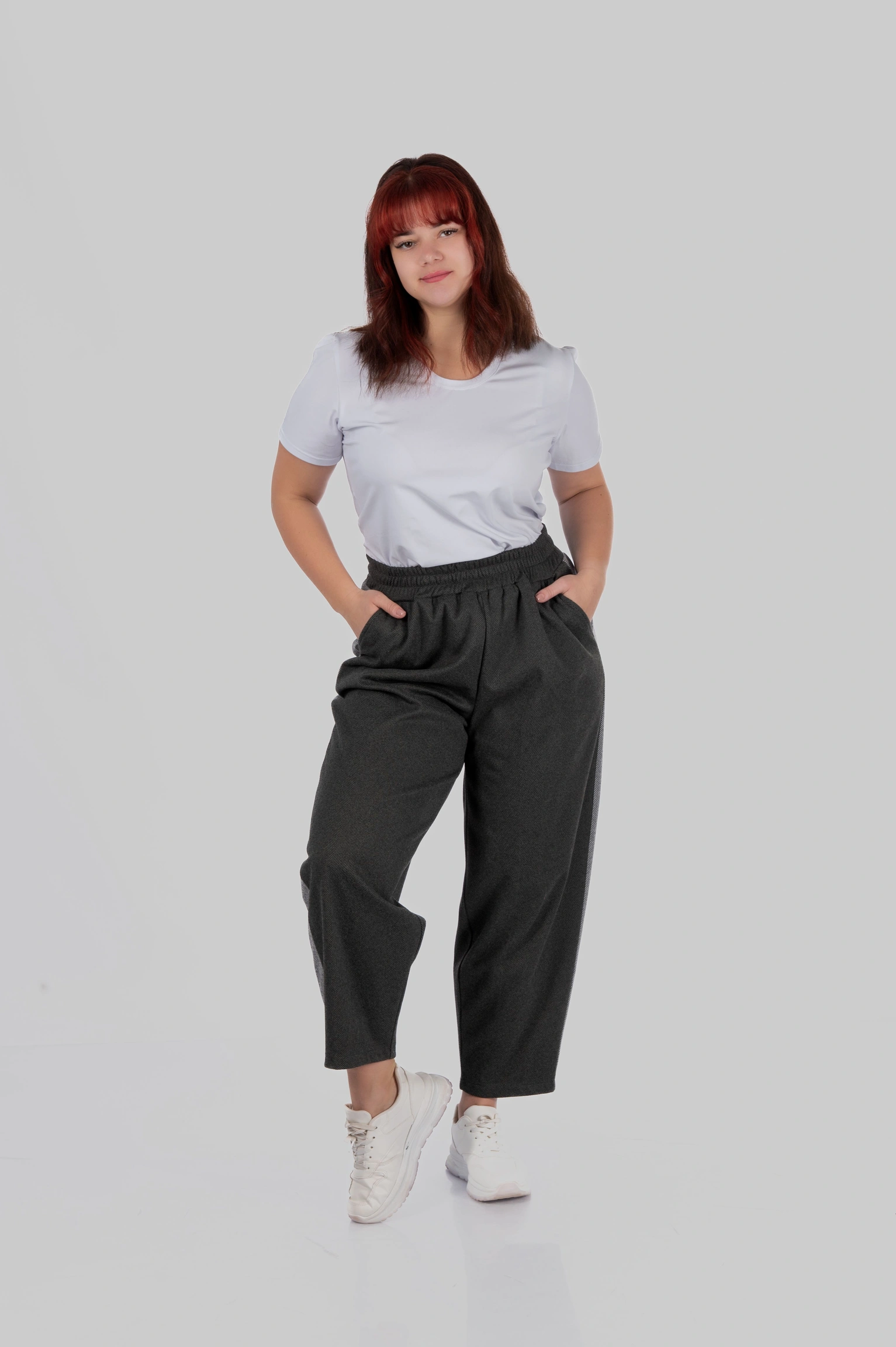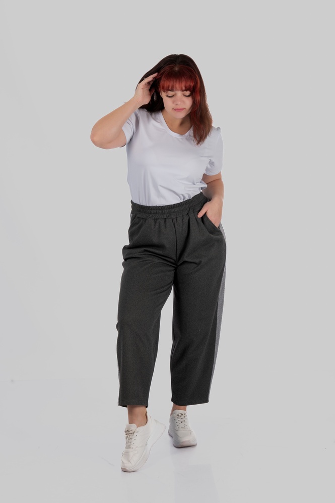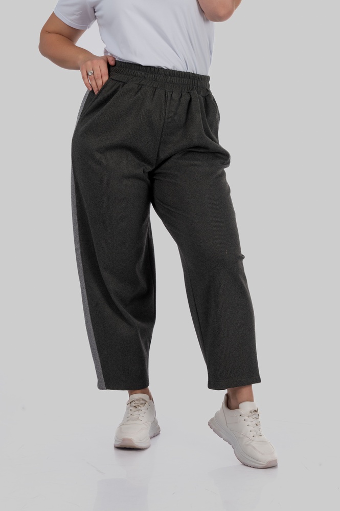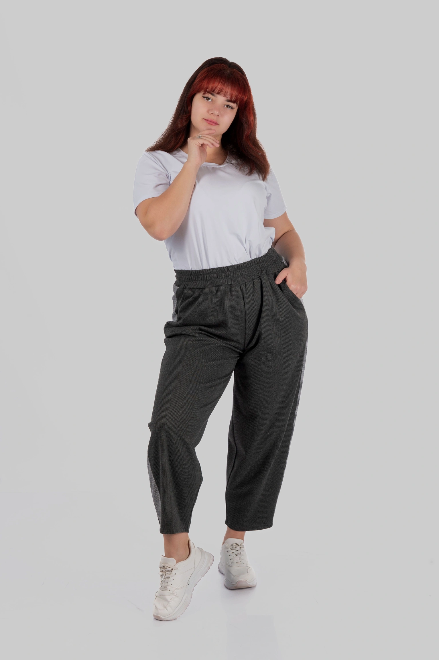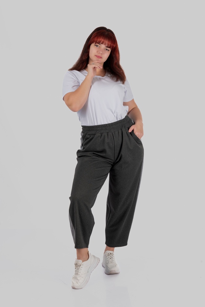 Посадка — комфортно висока. Пояс шириною 4 см із резинкою по всьому колу м’яко адаптується до талії, не тисне на живіт і рівномірно розподіляє об’єм. Така конструкція особливо важлива для plus size, бо штани залишаються комфортними протягом дня і не потребують постійного поправляння.
