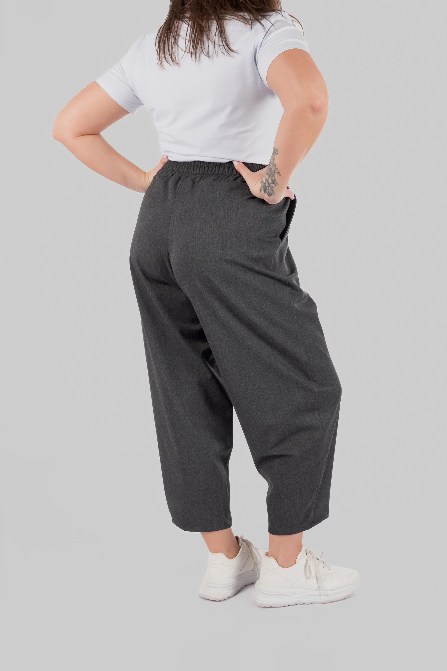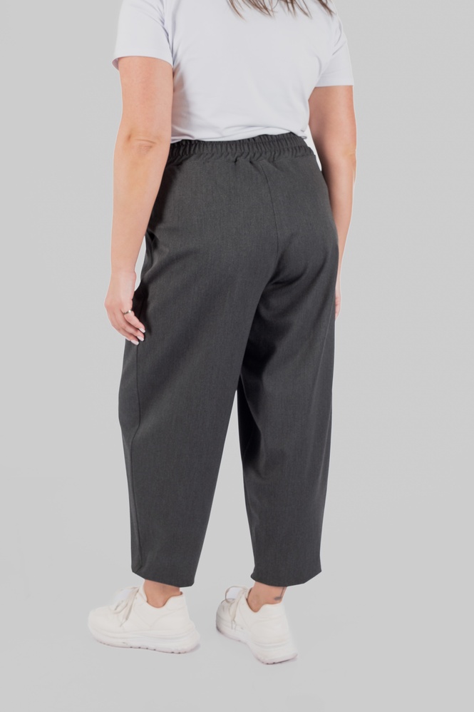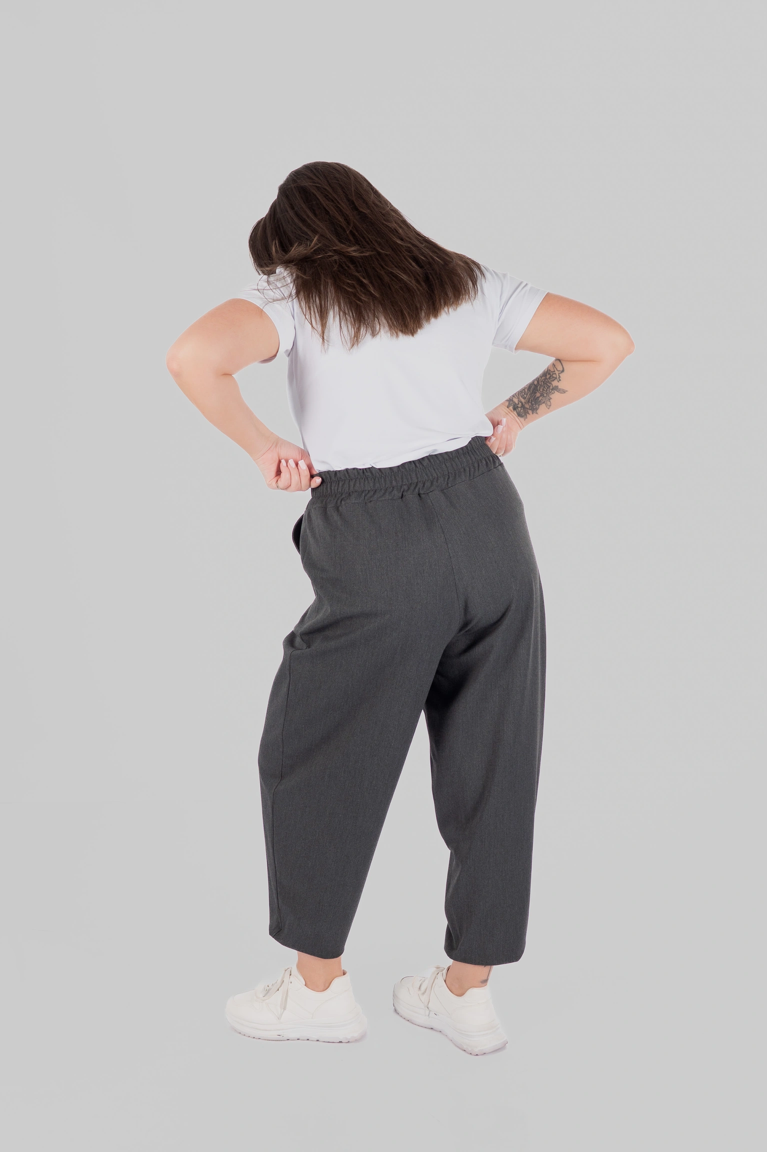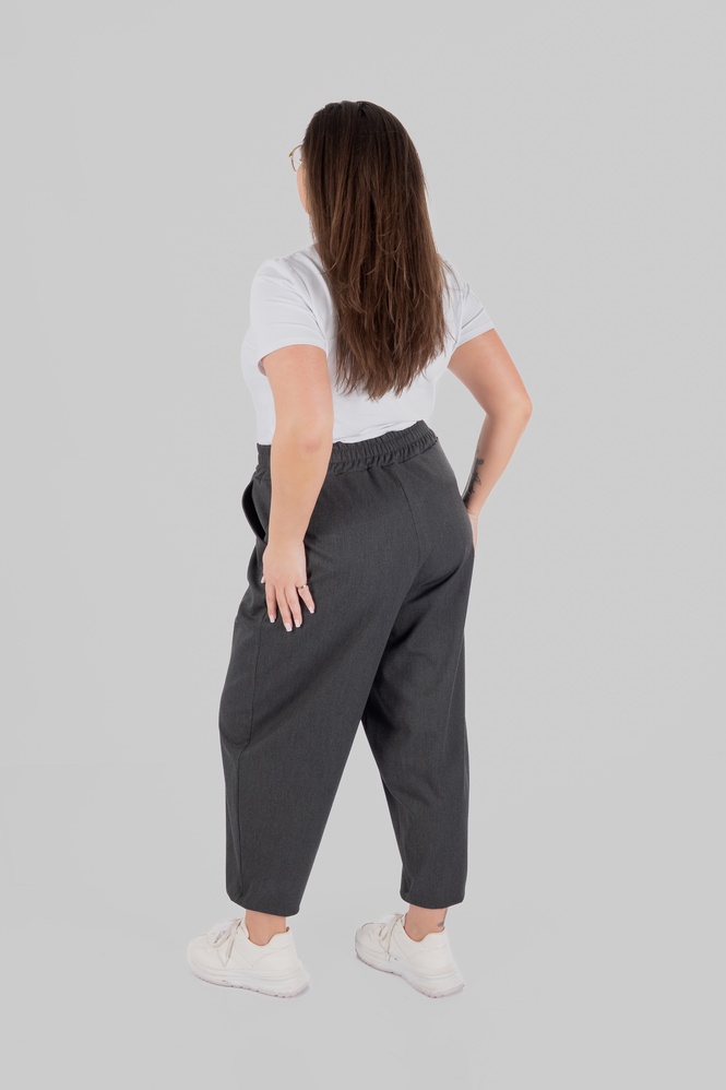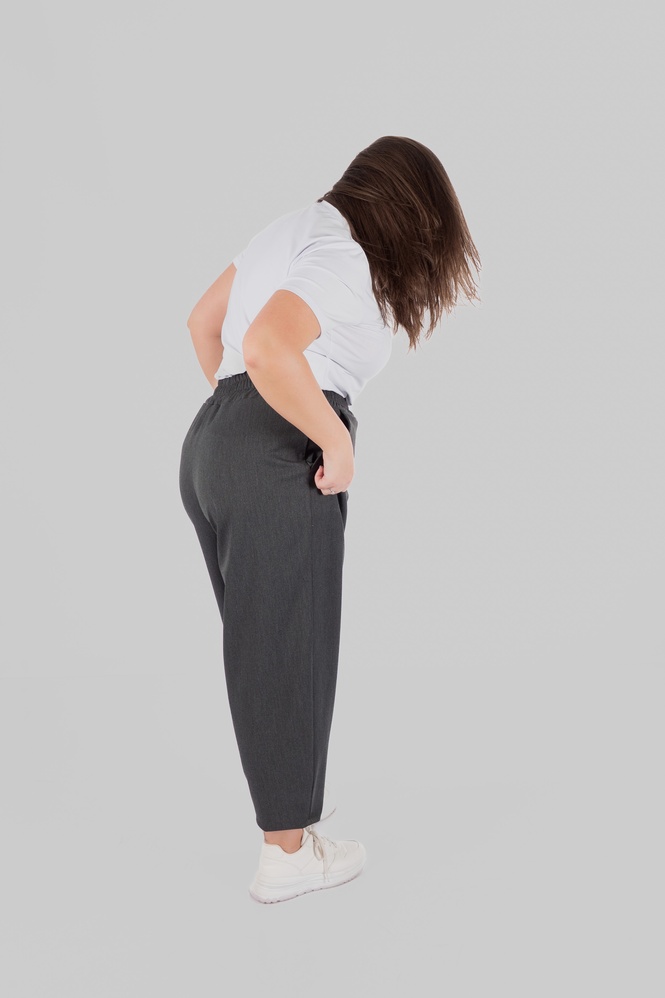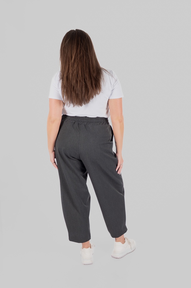 У plus size штани часто створюють дві крайності: або вони обтягують стегна і тягнуть у зоні живота, або виглядають занадто обʼємно і втрачають форму. Nora сконструйовані так, щоб уникнути обох цих проблем. Силует акуратно повторює лінію стегон, але при цьому залишає достатньо свободи, щоб штани виглядали пропорційно і комфортно у русі.