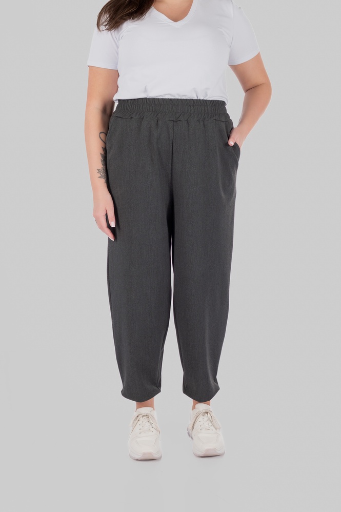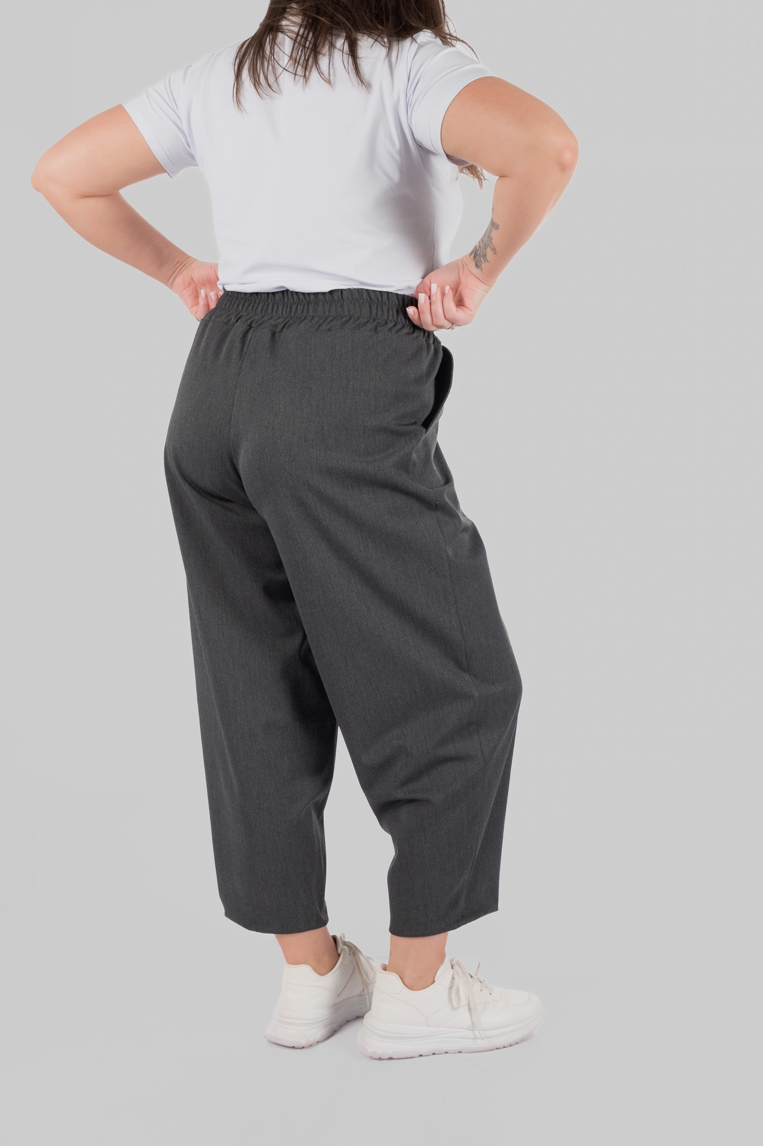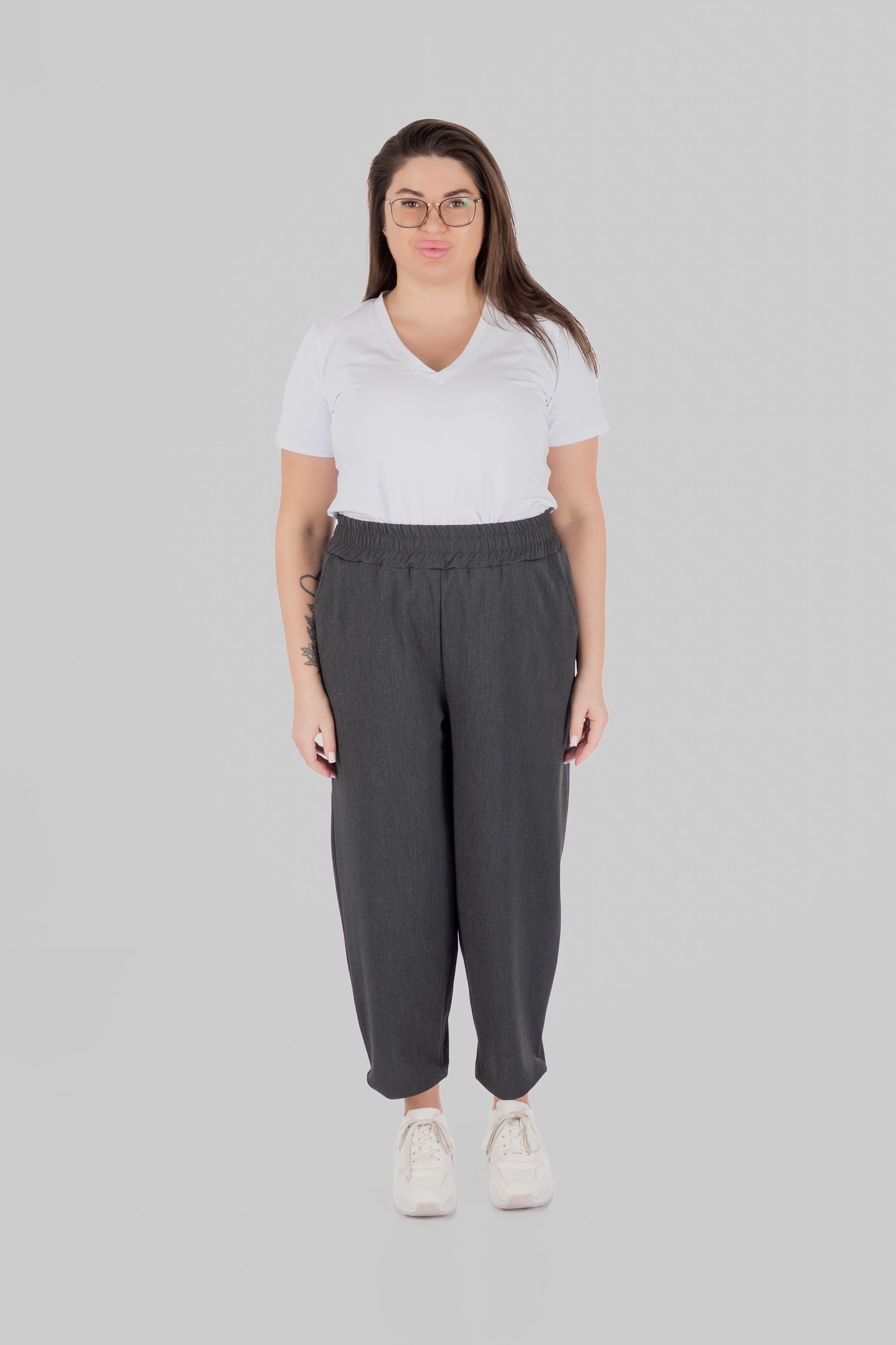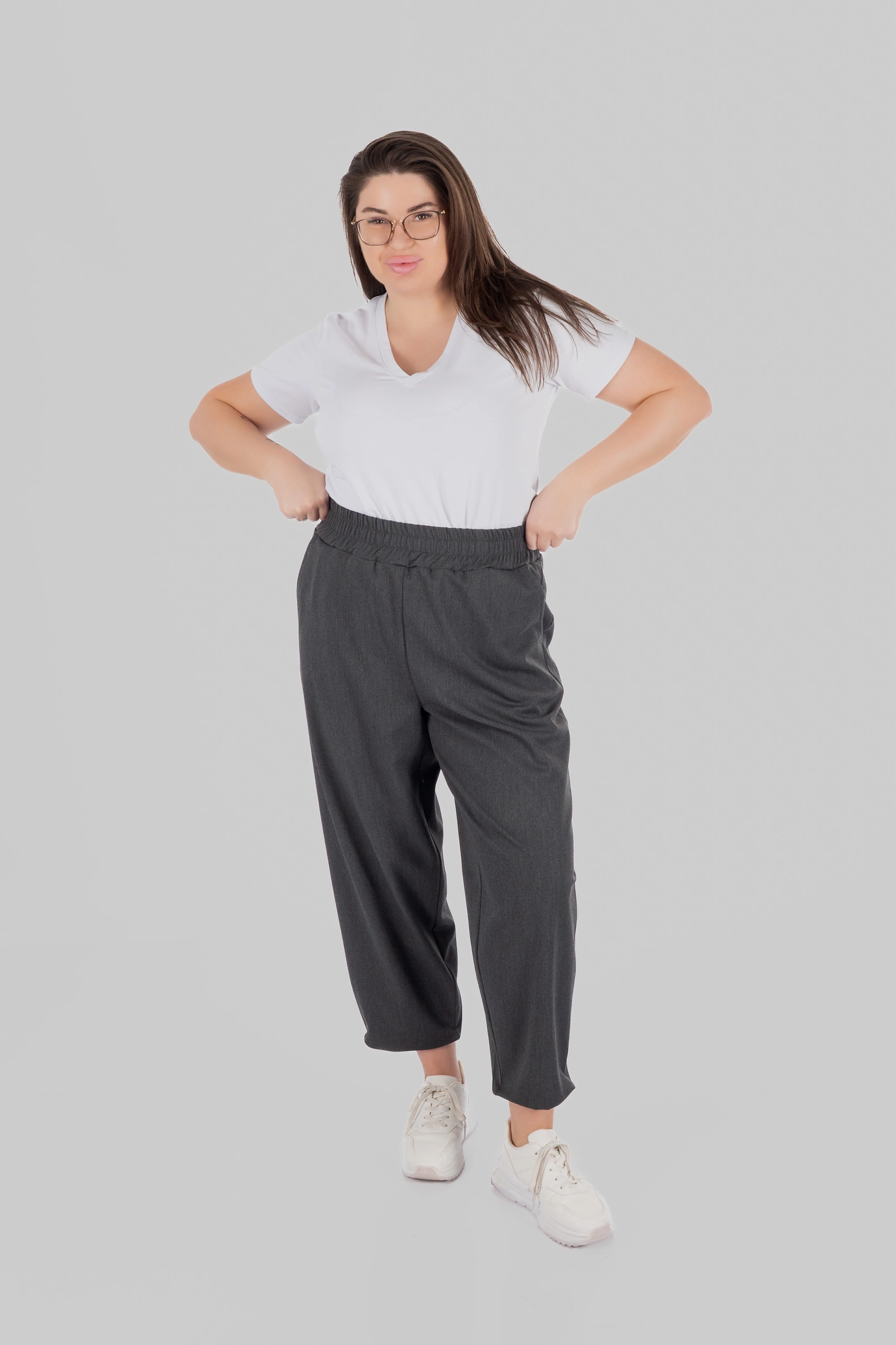 У plus size штани часто створюють дві крайності: або вони обтягують стегна і тягнуть у зоні живота, або виглядають занадто обʼємно і втрачають форму. Nora сконструйовані так, щоб уникнути обох цих проблем. Силует акуратно повторює лінію стегон, але при цьому залишає достатньо свободи, щоб штани виглядали пропорційно і комфортно у русі.
