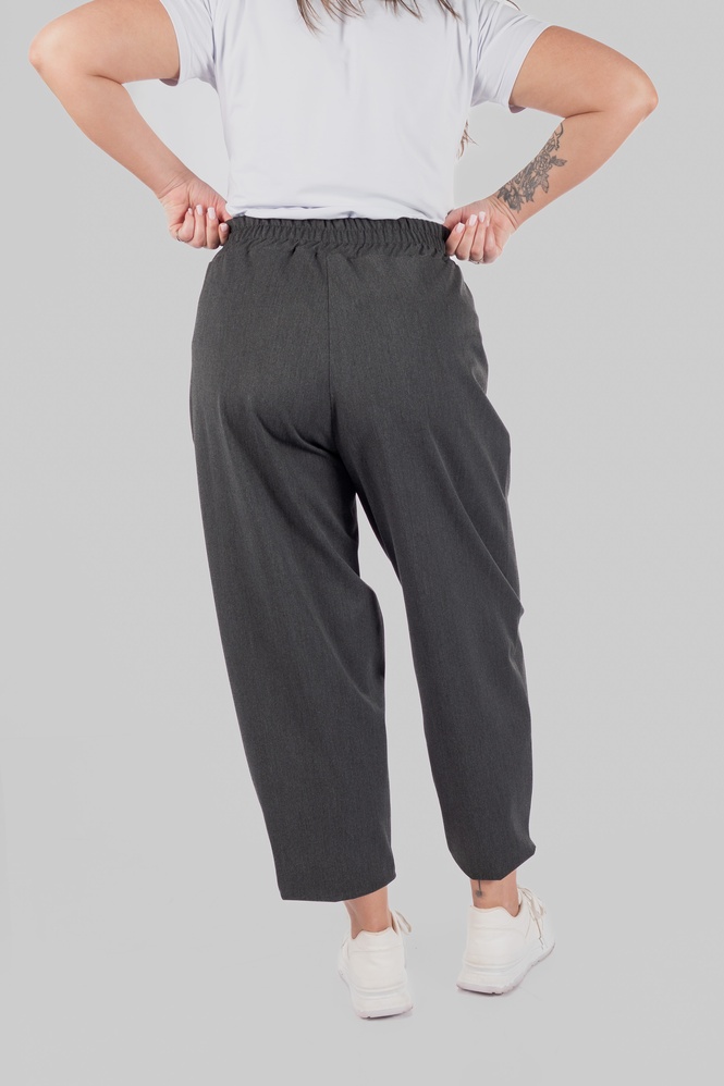 Модель виконана з костюмної віскозної тканини середньої щільності. Матеріал матовий, добре тримає форму, не просвічує і не підкреслює дрібні нерівності фігури. Слабка еластичність додає комфорту в русі, але зберігає чітку геометрію штанів — тканина не «пливе» і виглядає акуратно навіть після тривалого носіння.
