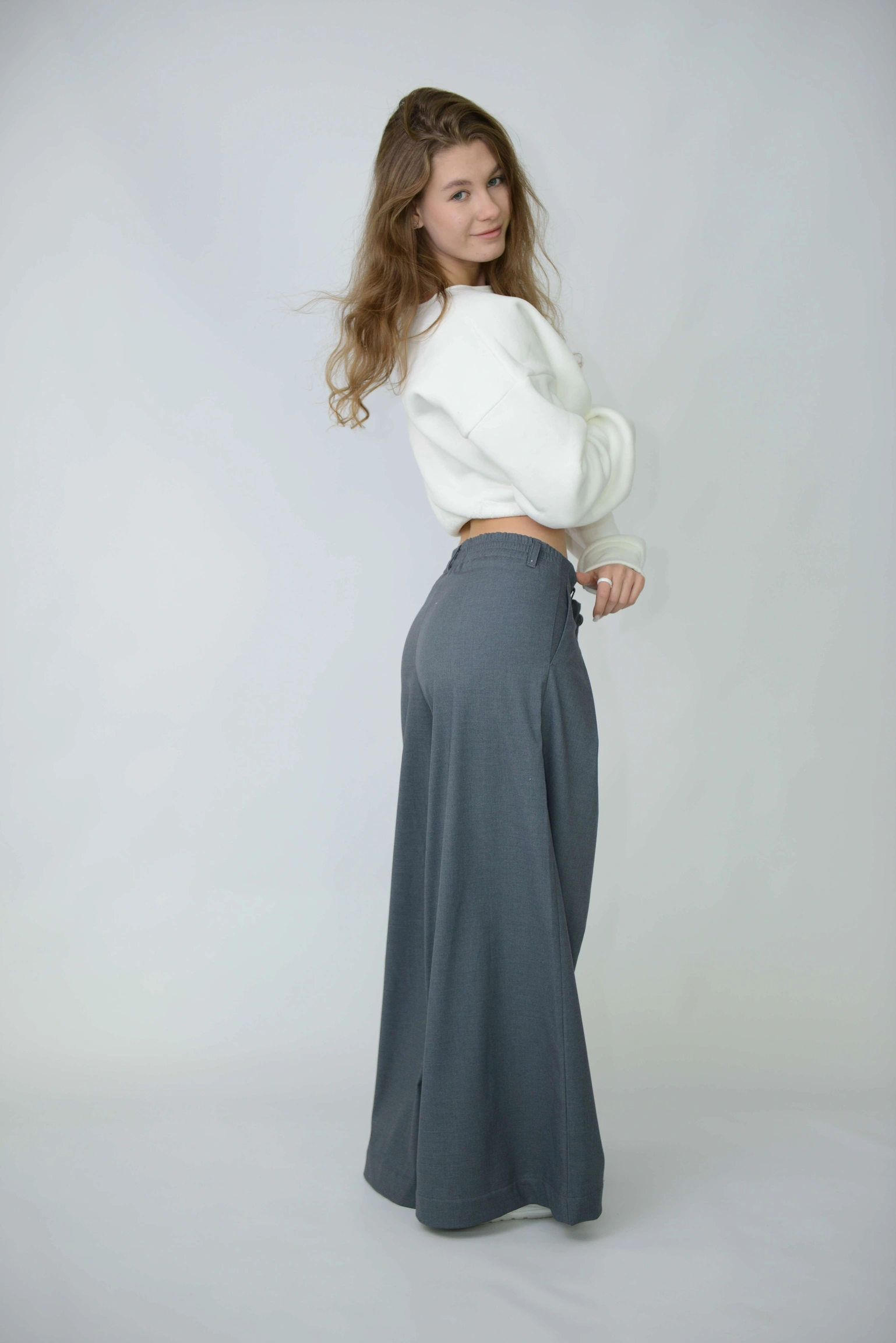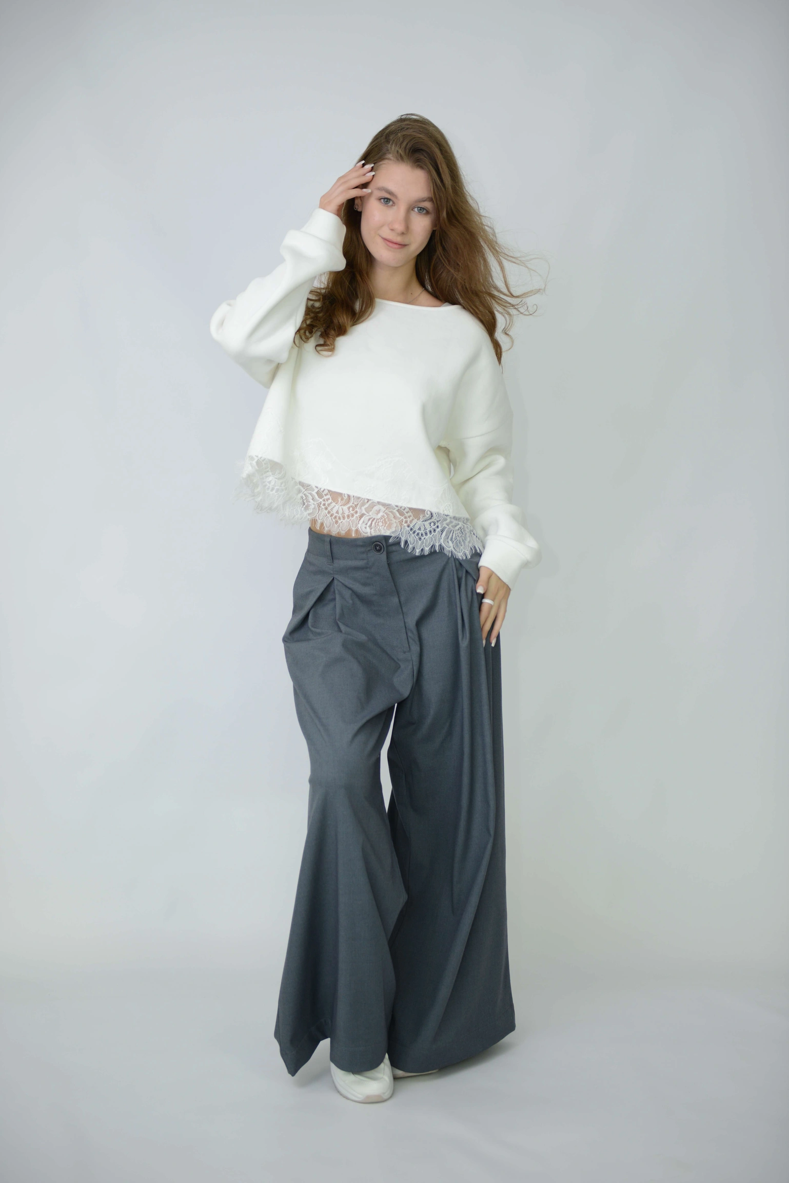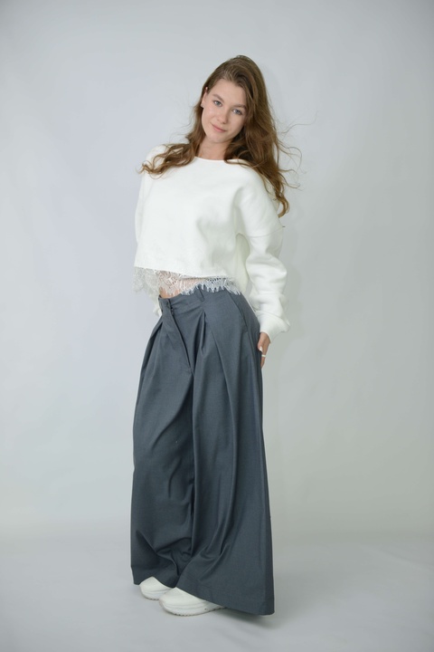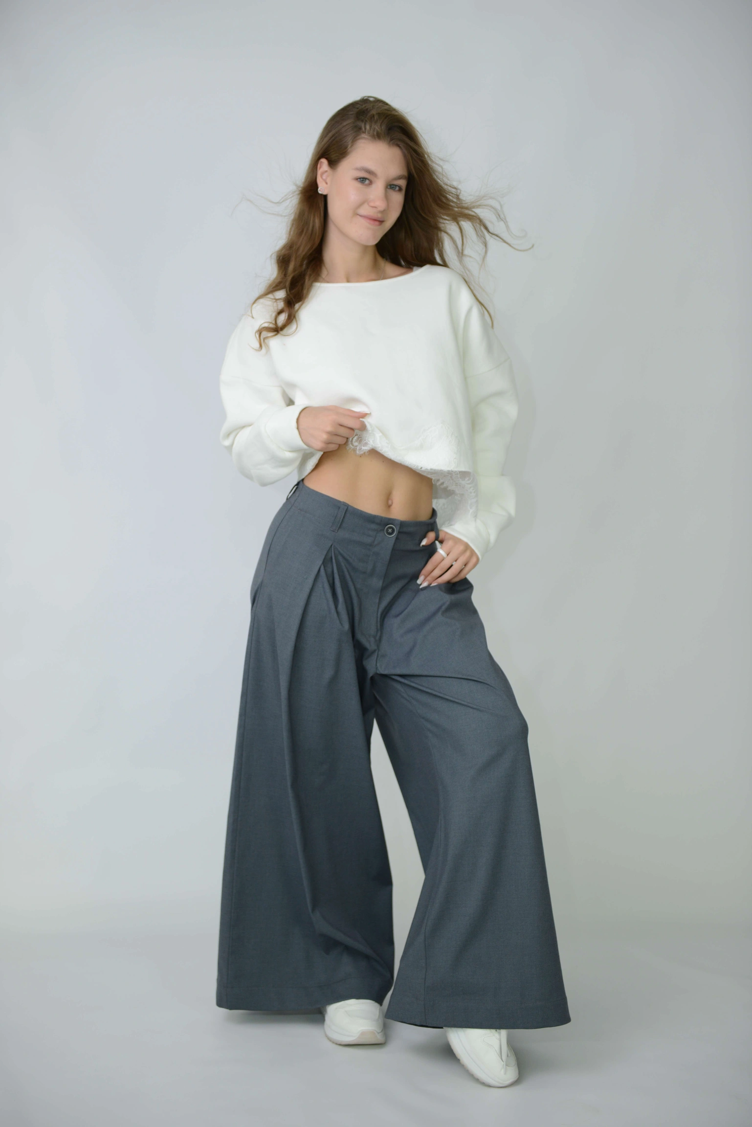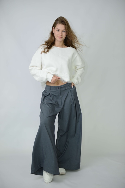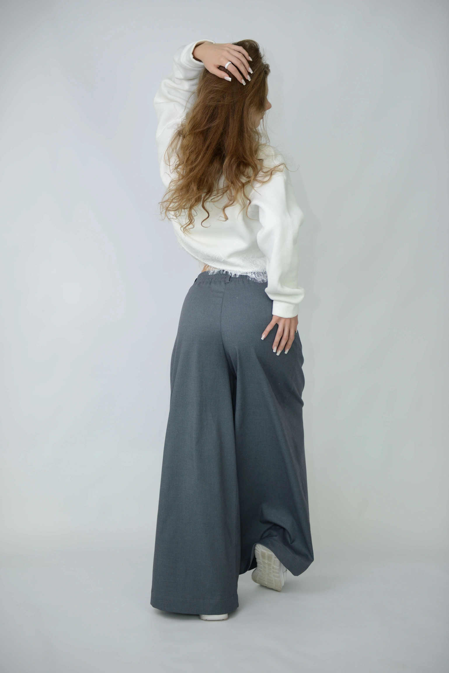 Лінія посадки в Grande продумана так, щоб штани м’яко формували силует: глибокі складки на передній частині візуально подовжують ноги, а подовжена довжина додає образу легкості та стрімкості. Саме тому Grande так гарно «грають» у русі — створюють ефект м’якої хвилі та дорогої пластики, яку неможливо не помітити.