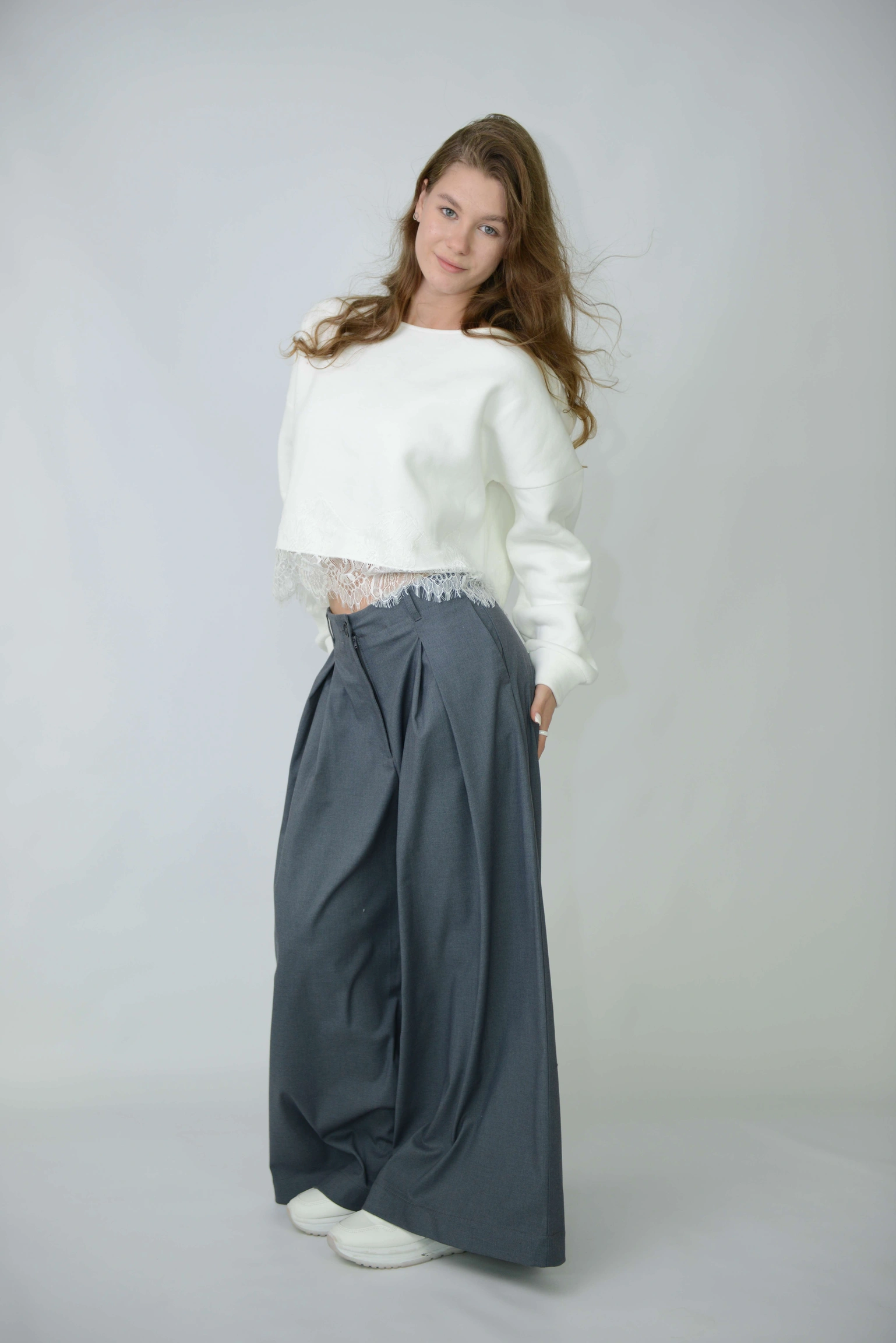 Grande — це не просто штани-палаццо. Це модель, яка створює відчуття продуманого стилю та естетики, що не підвладні трендам. У цих штанах поєднується архітектурний крій, елегантна пластика тканини та комфорт, який відчувається у кожному русі.