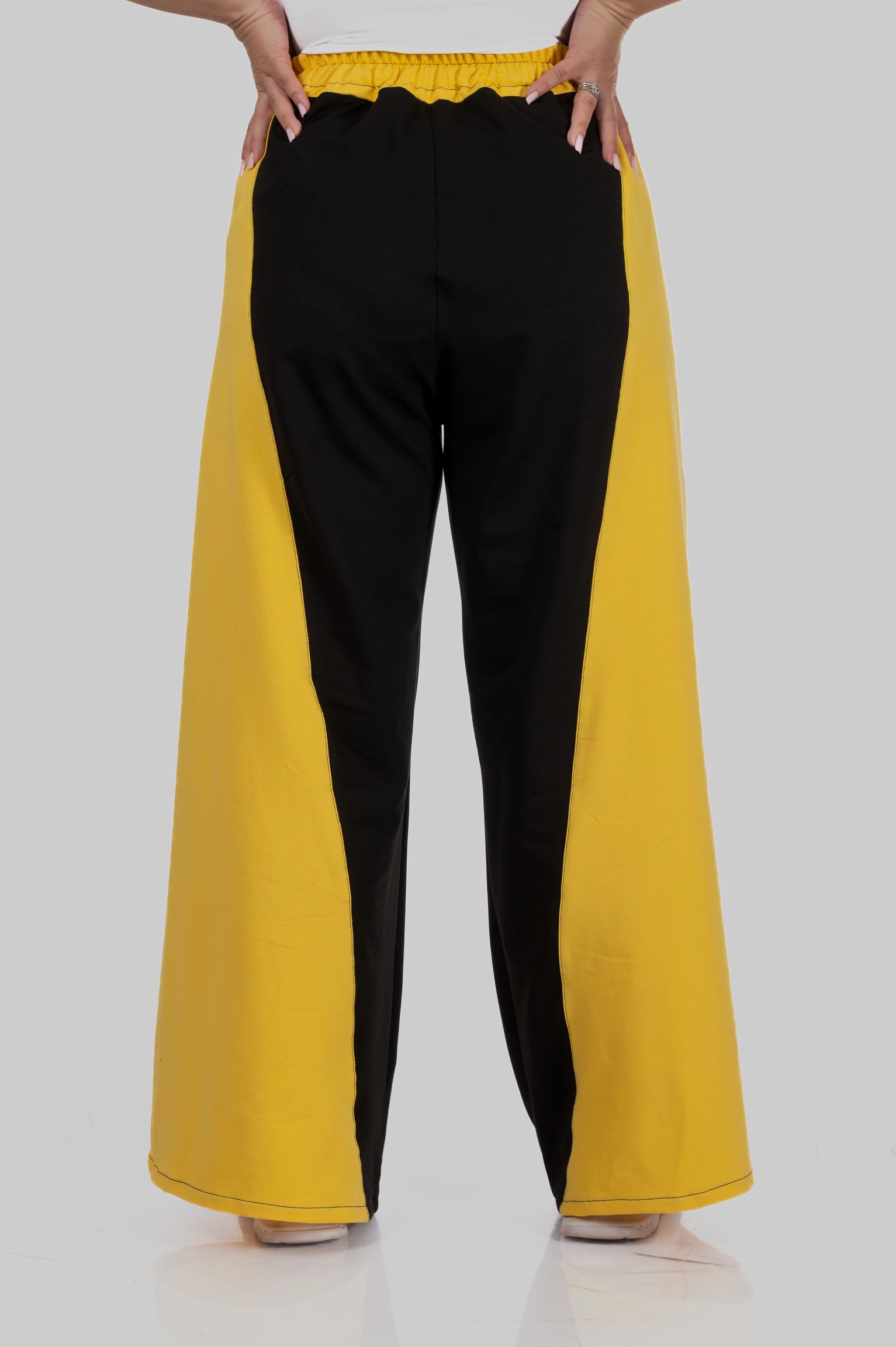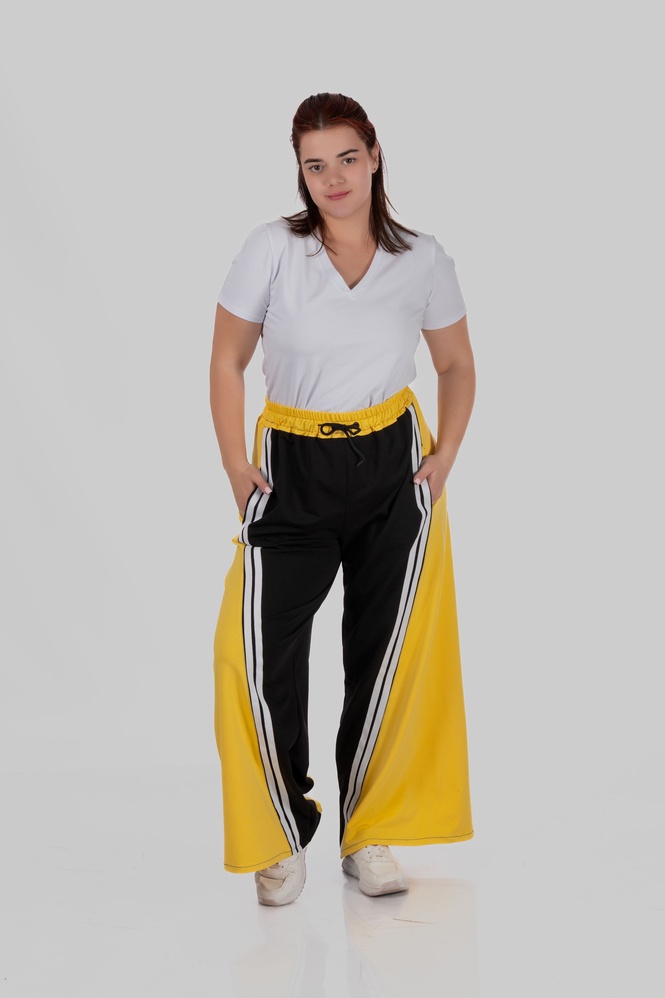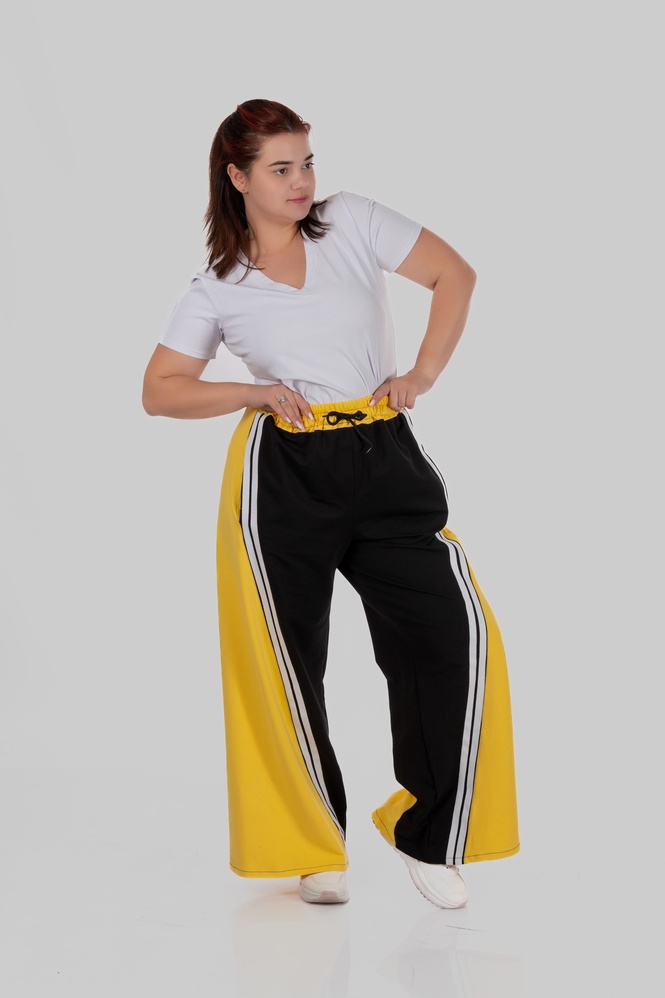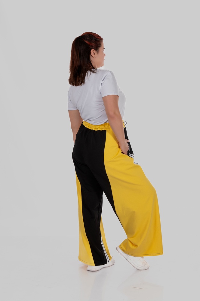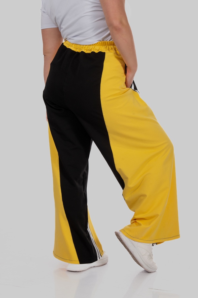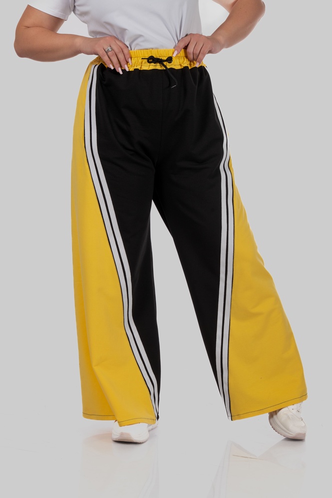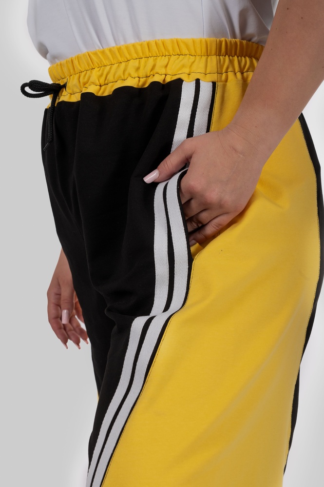 Контрастні широкі вставки з боків у поєднанні з вертикальними лампасами створюють чіткий візуальний ефект: ноги виглядають довшими, силует — витягнутішим, а фігура — більш пропорційною.