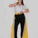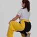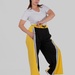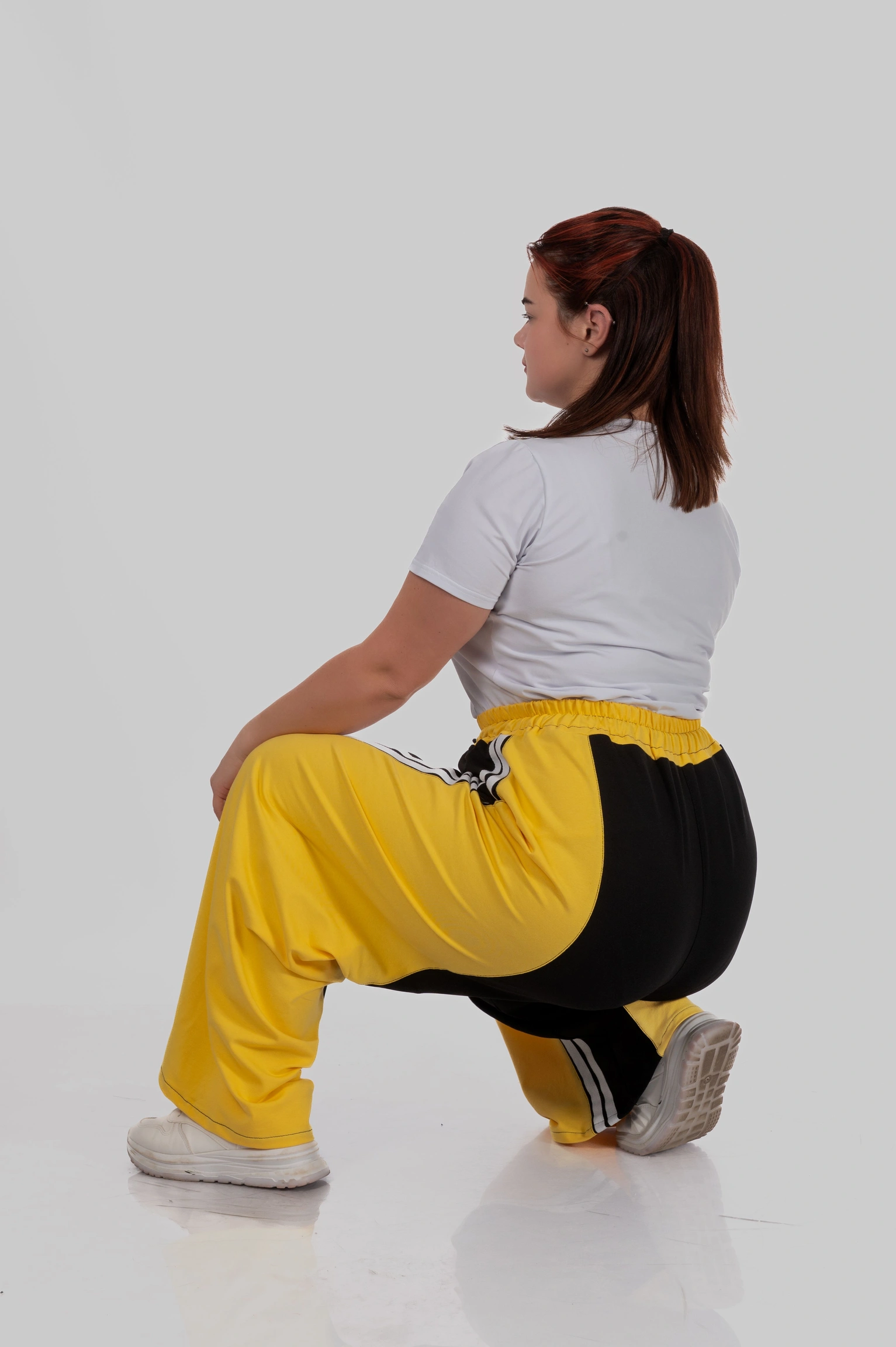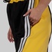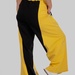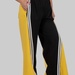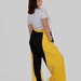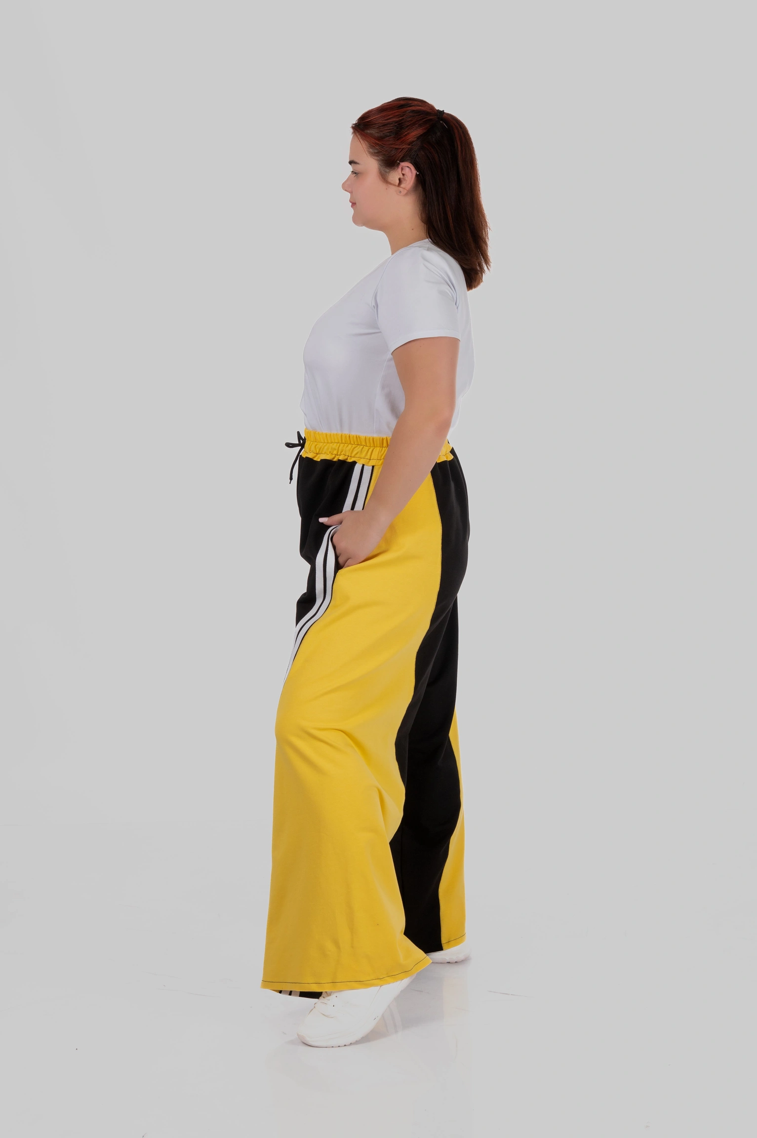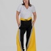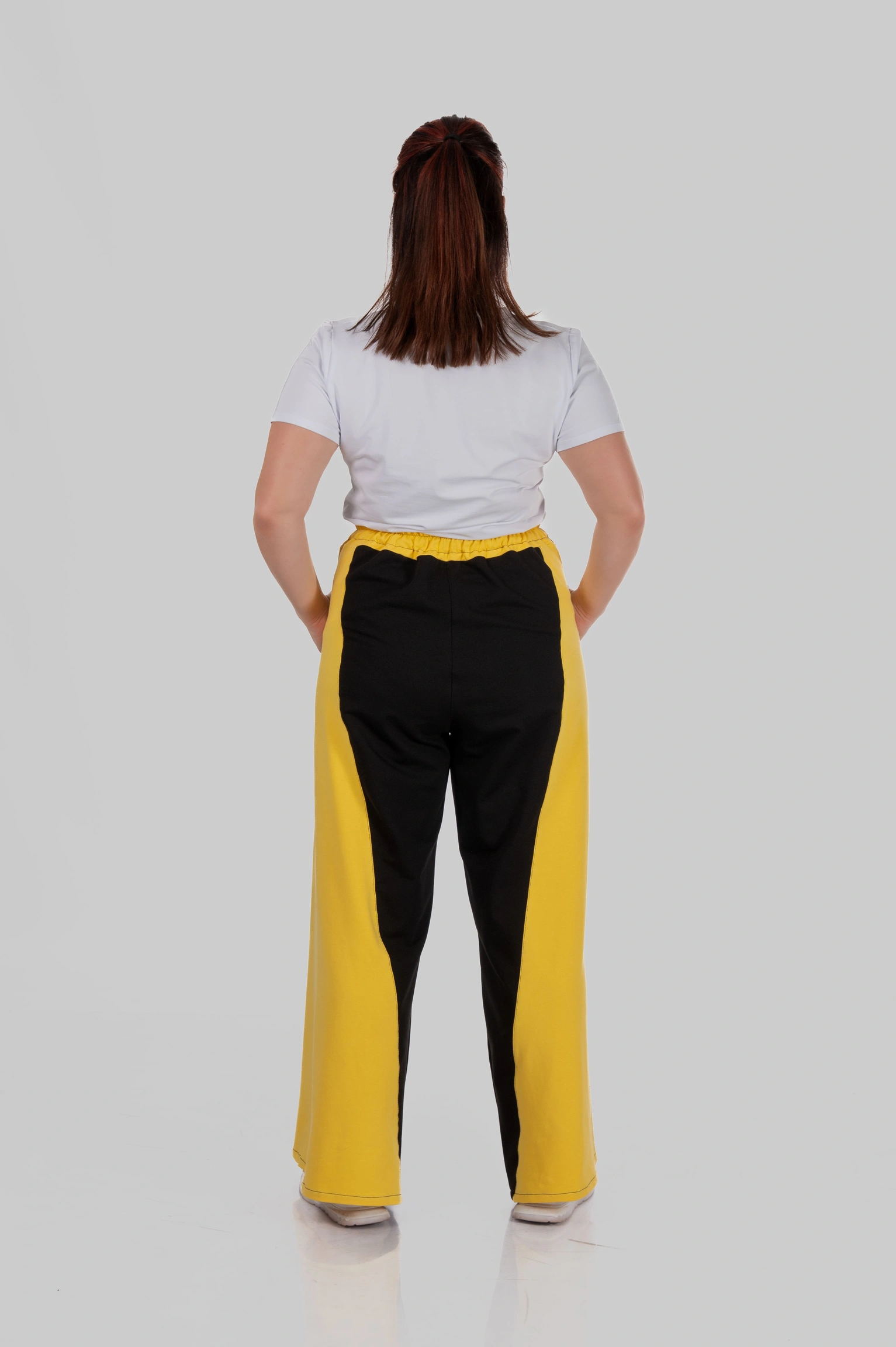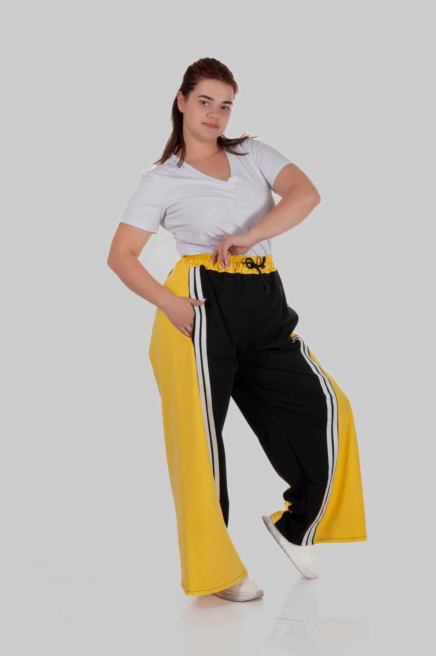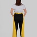Контрастні широкі вставки з боків у поєднанні з вертикальними лампасами створюють чіткий візуальний ефект: ноги виглядають довшими, силует — витягнутішим, а фігура — більш пропорційною.